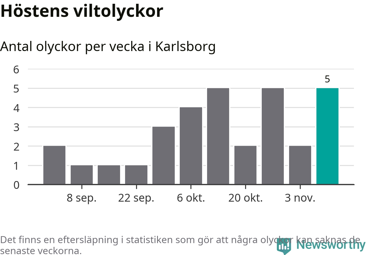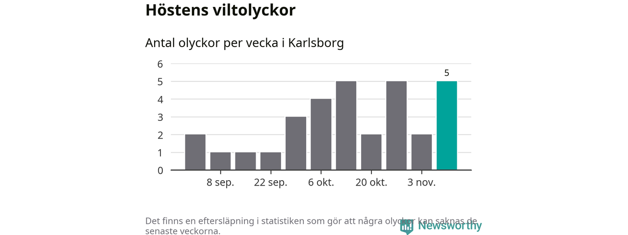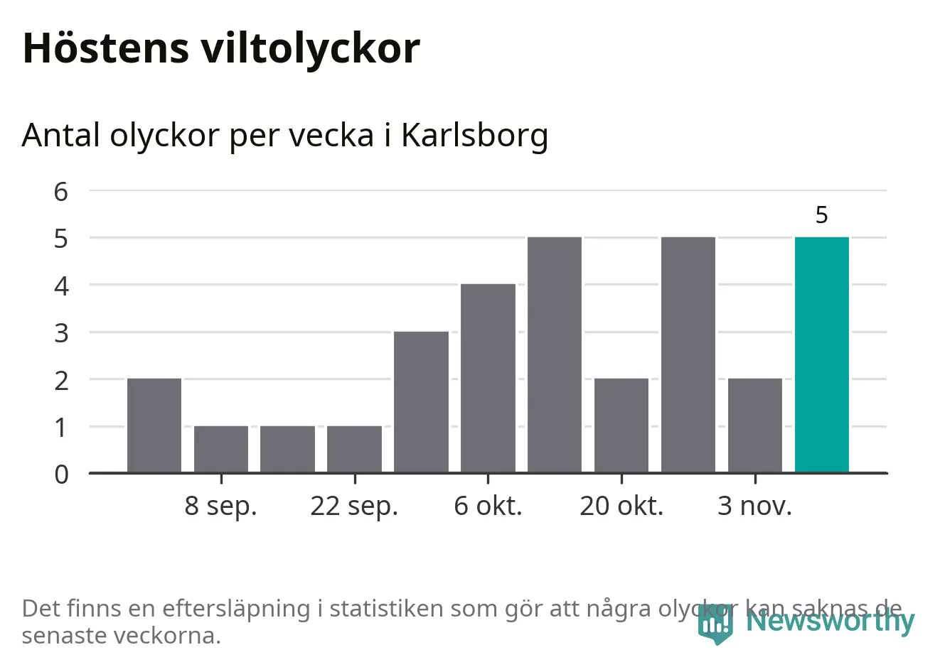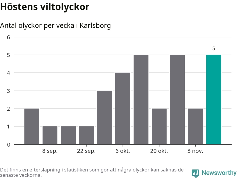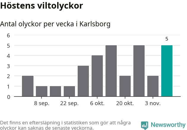 Under vecka 46 rapporterades fem viltolyckor in i Karlsborgs kommun. Därmed har det inträffat fler viltolyckor hittills den här hösten, än det brukar göra en hel genomsnittlig höst.