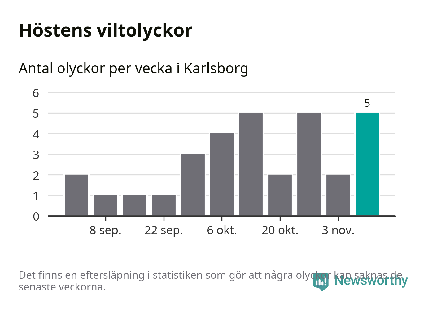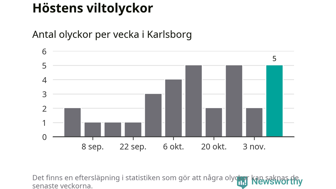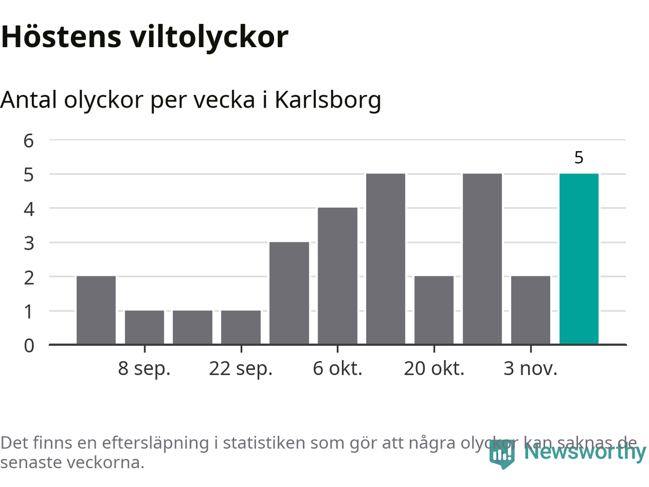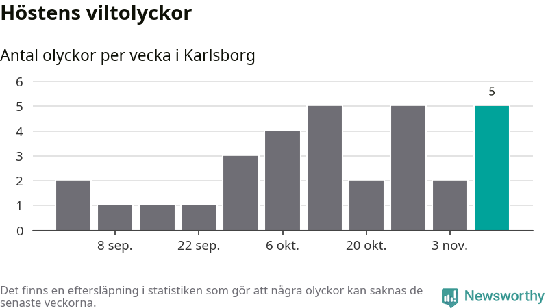 Under vecka 46 rapporterades fem viltolyckor in i Karlsborgs kommun. Därmed har det inträffat fler viltolyckor hittills den här hösten, än det brukar göra en hel genomsnittlig höst.