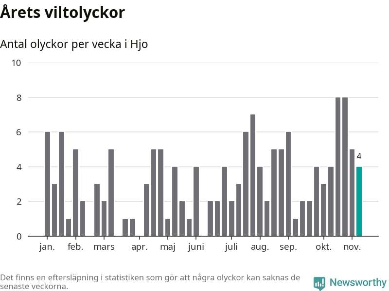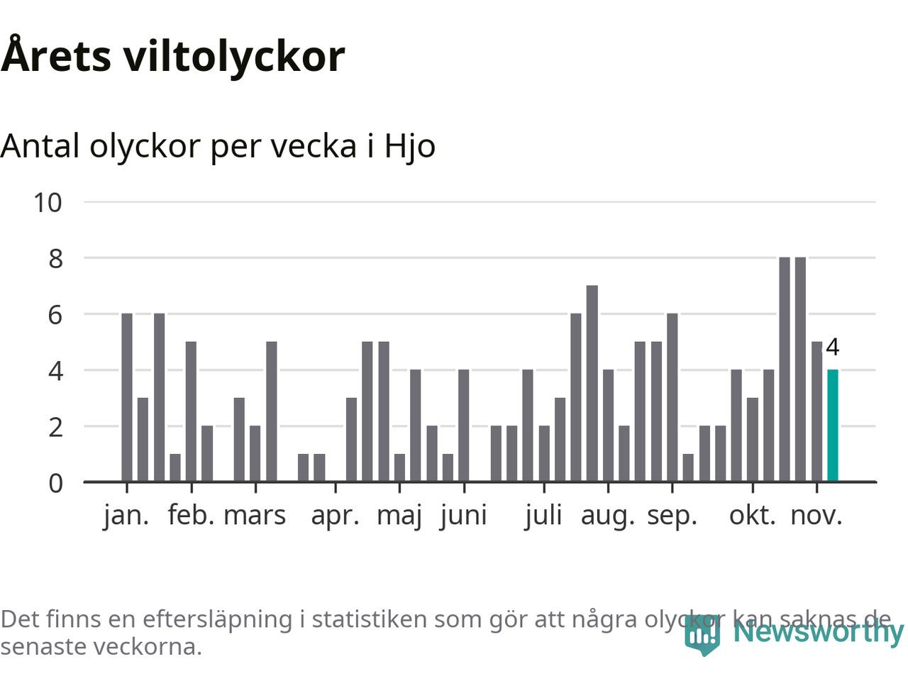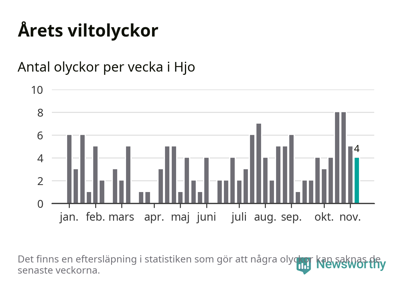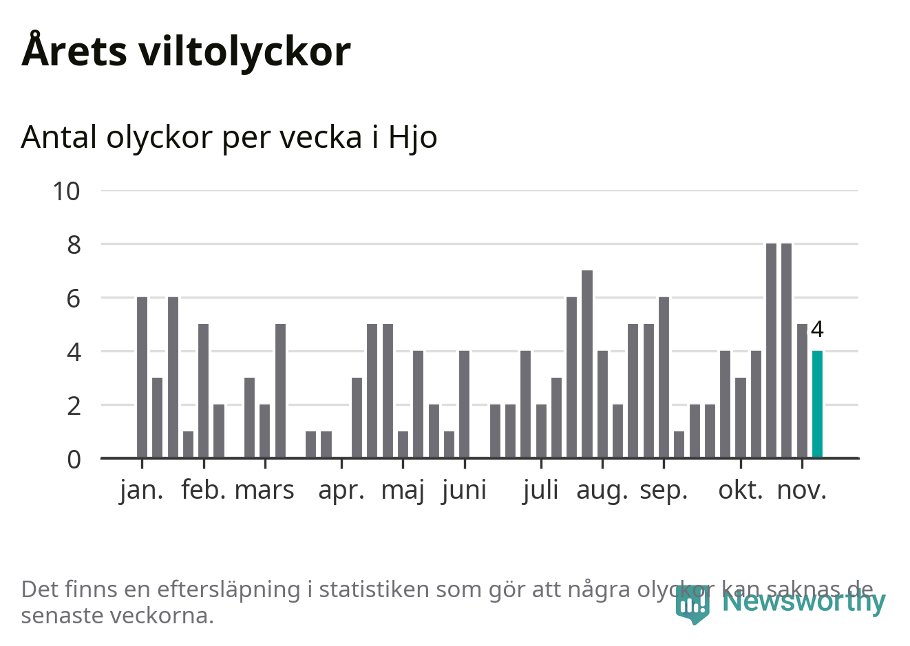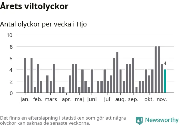 Hittills har fyra viltolyckor rapporterats in i Hjo kommun från vecka 46. Se listan här.