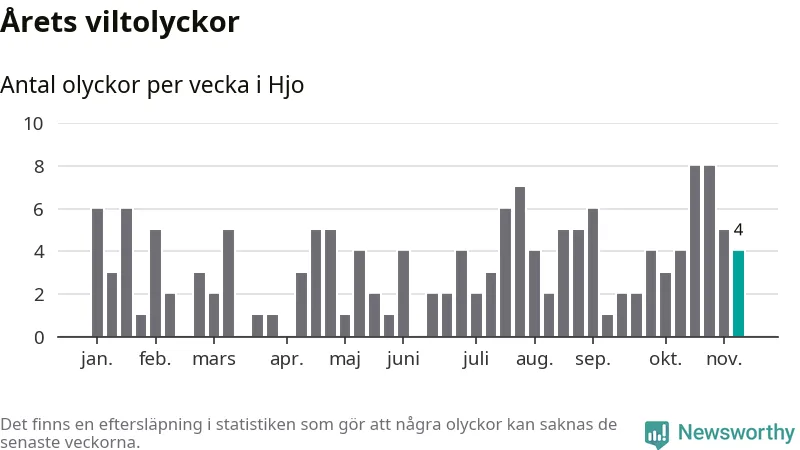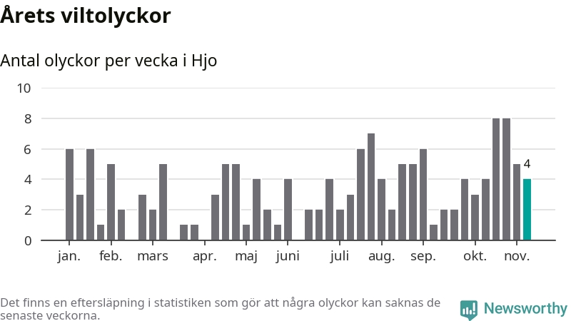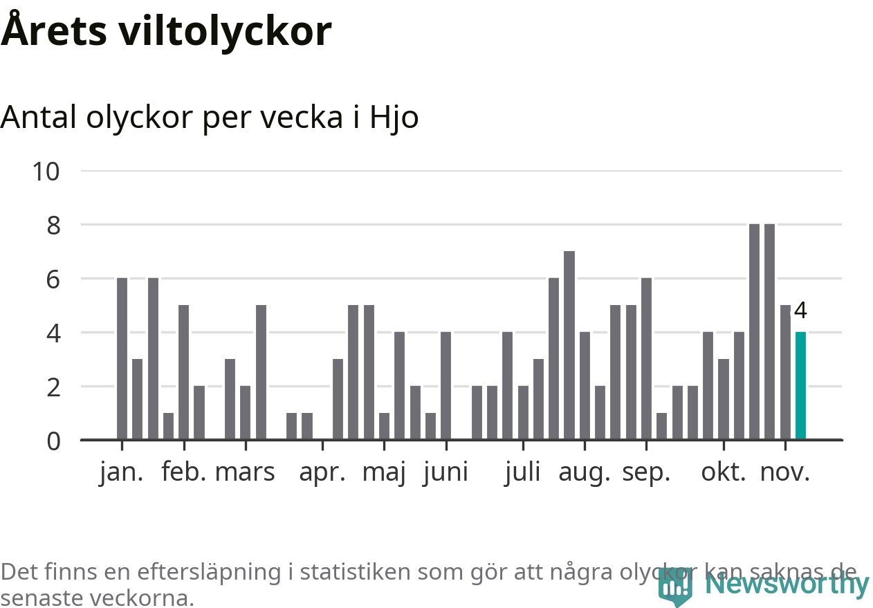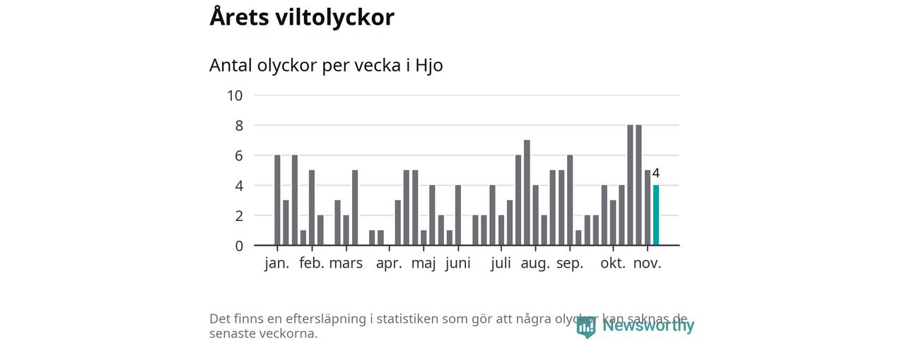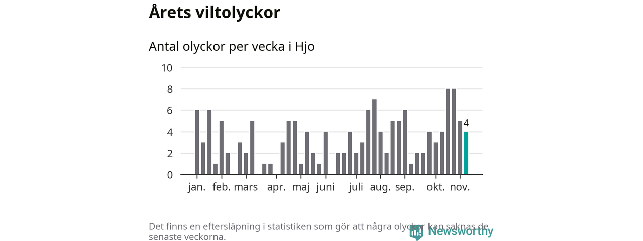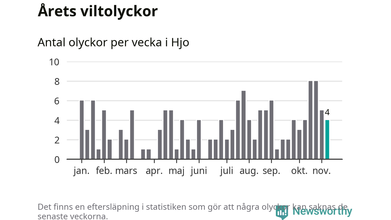 Hittills har fyra viltolyckor rapporterats in i Hjo kommun från vecka 46. Se listan här.