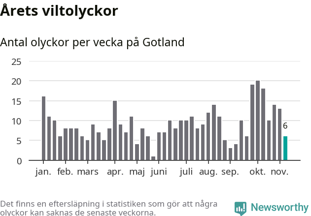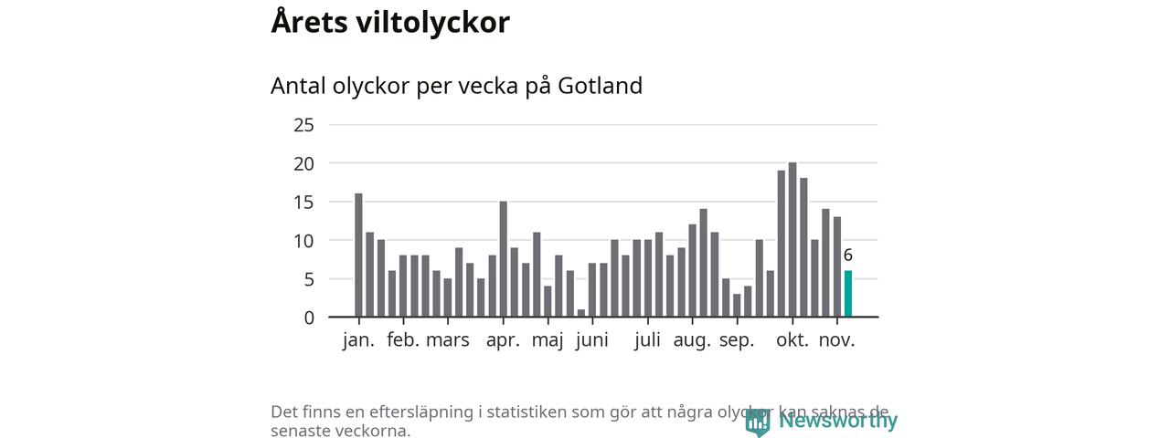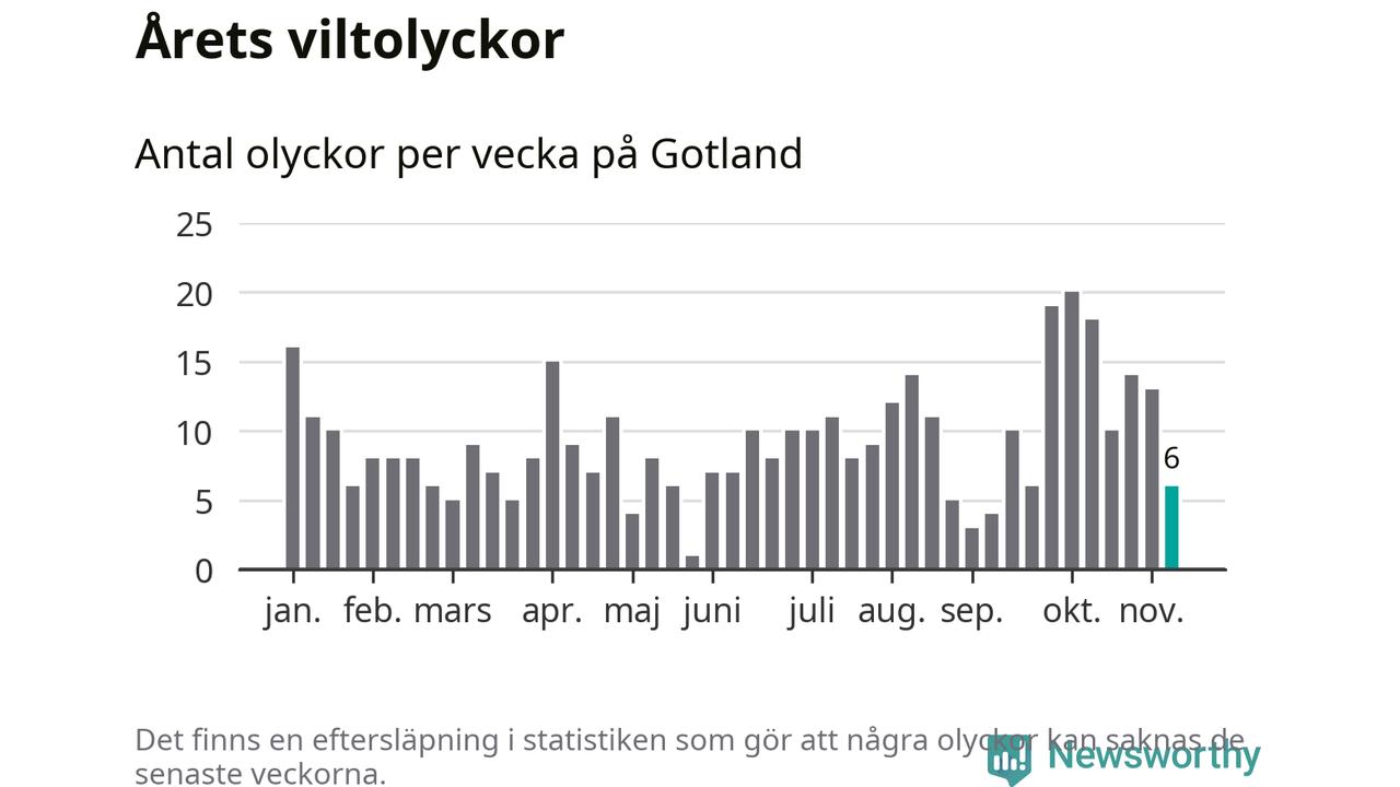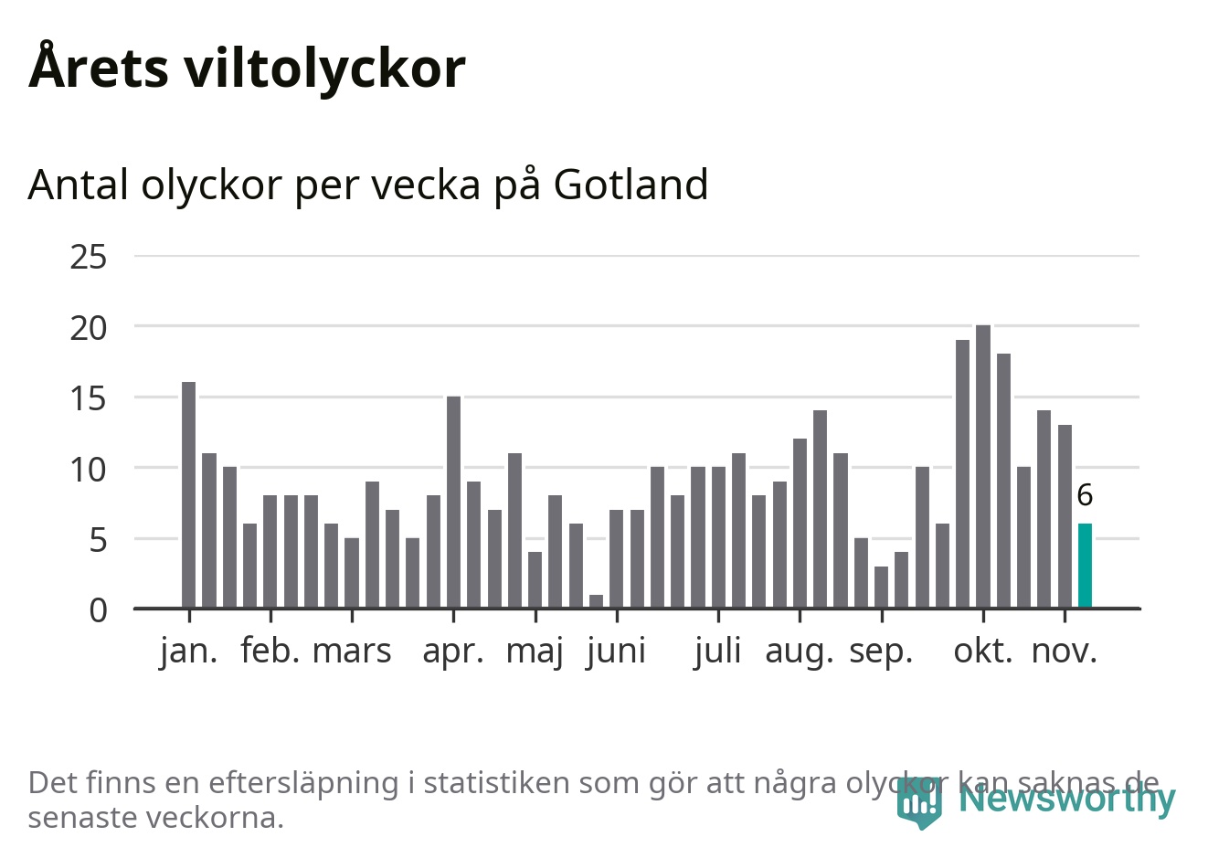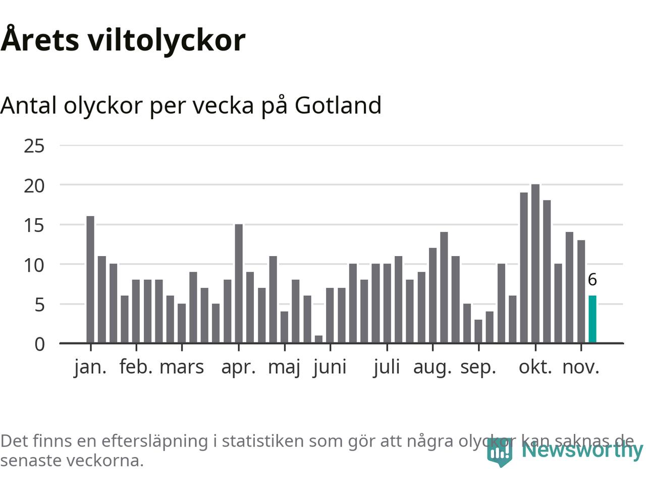 Hittills har sex viltolyckor rapporterats in i Gotlands kommun från vecka 46. Se listan här.