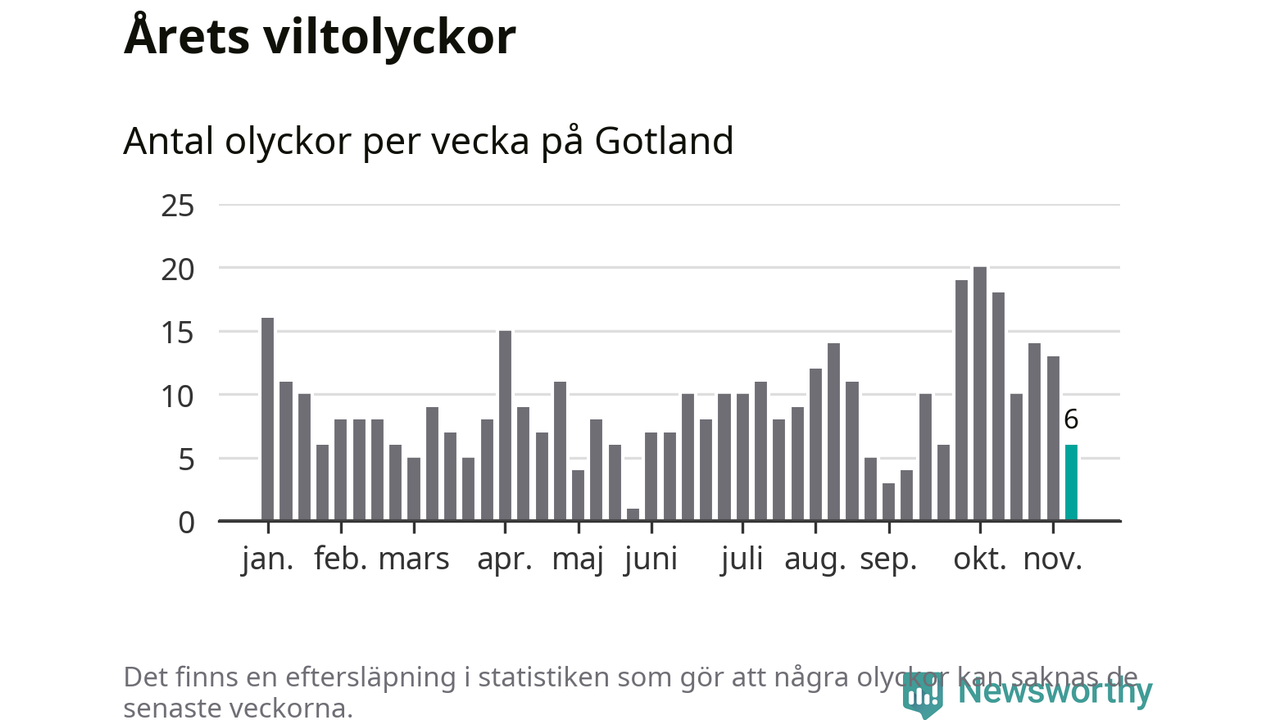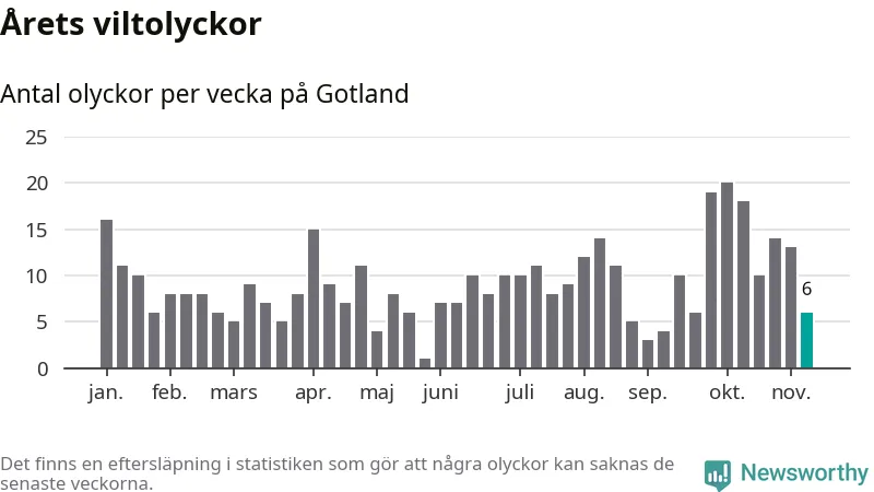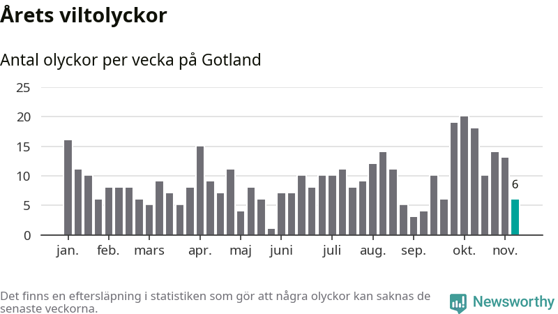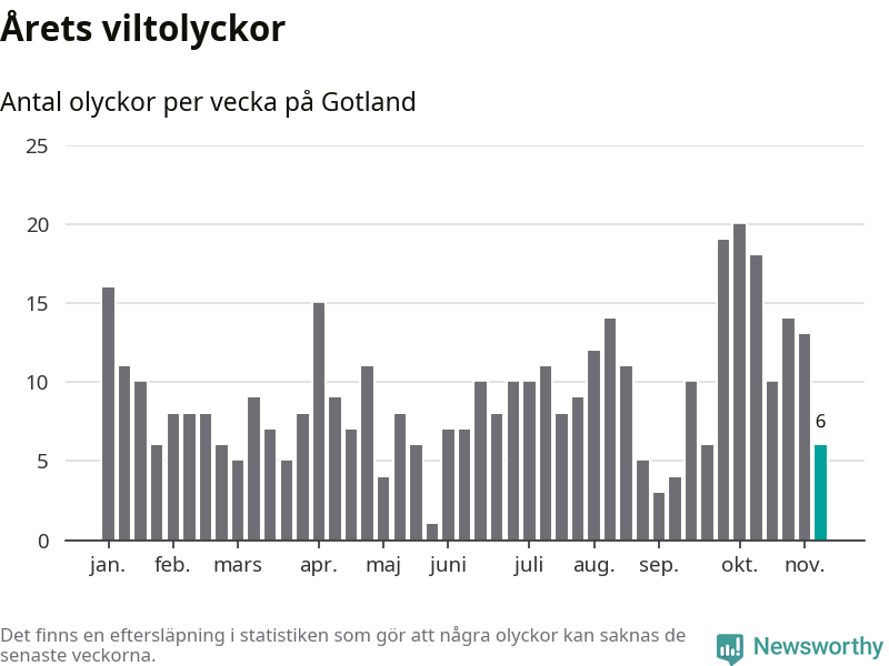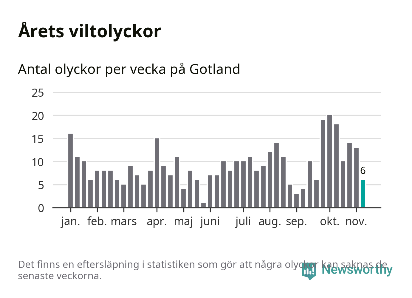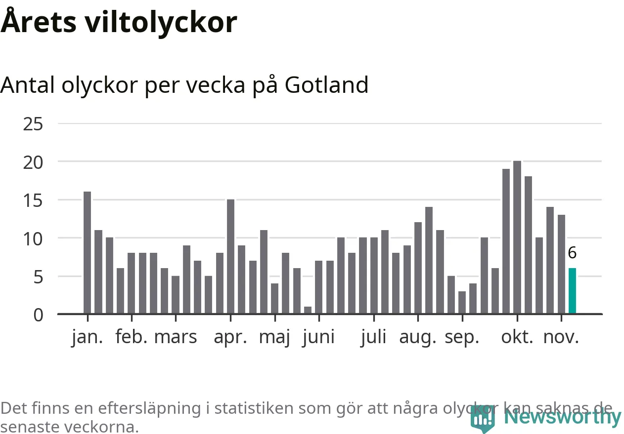 Hittills har sex viltolyckor rapporterats in i Gotlands kommun från vecka 46. Se listan här.