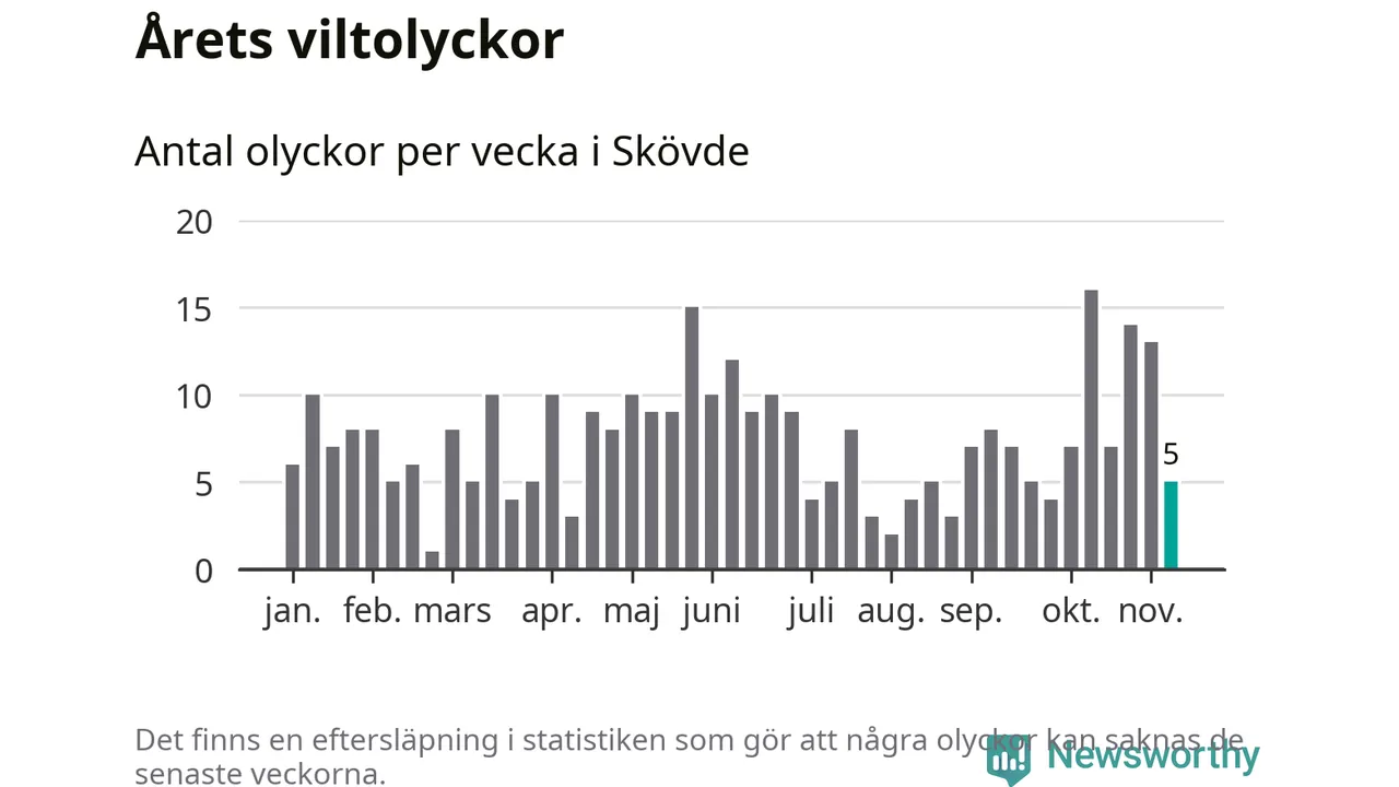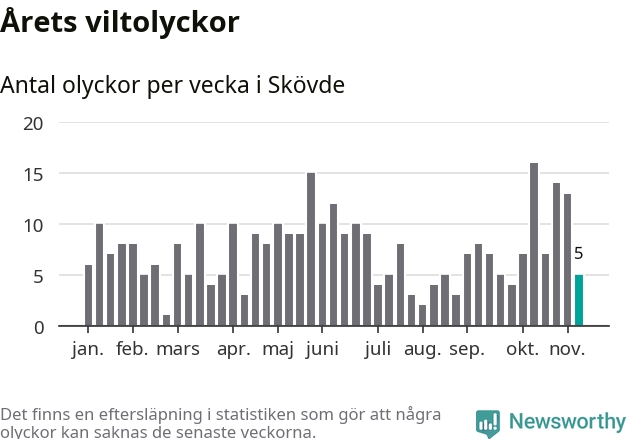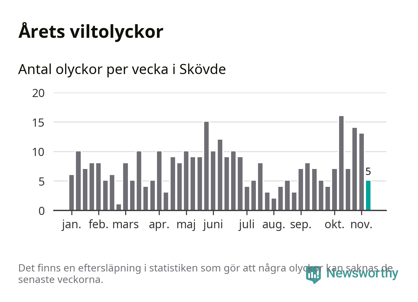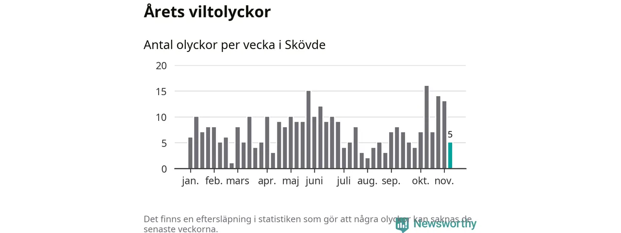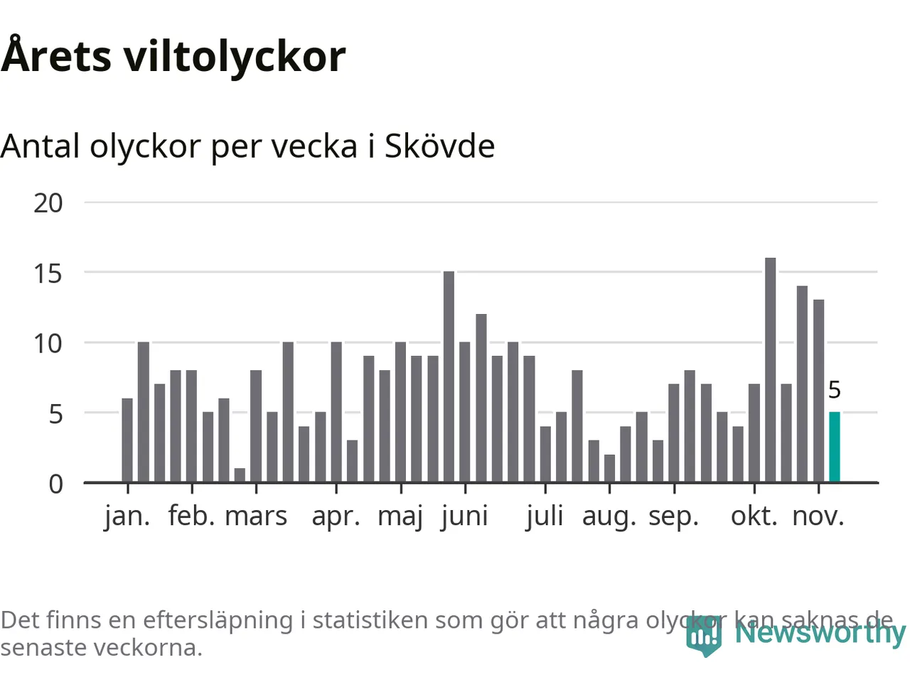 Hittills har fem viltolyckor rapporterats in i Skövde kommun från vecka 46. Se listan här.