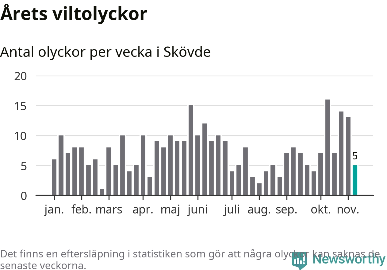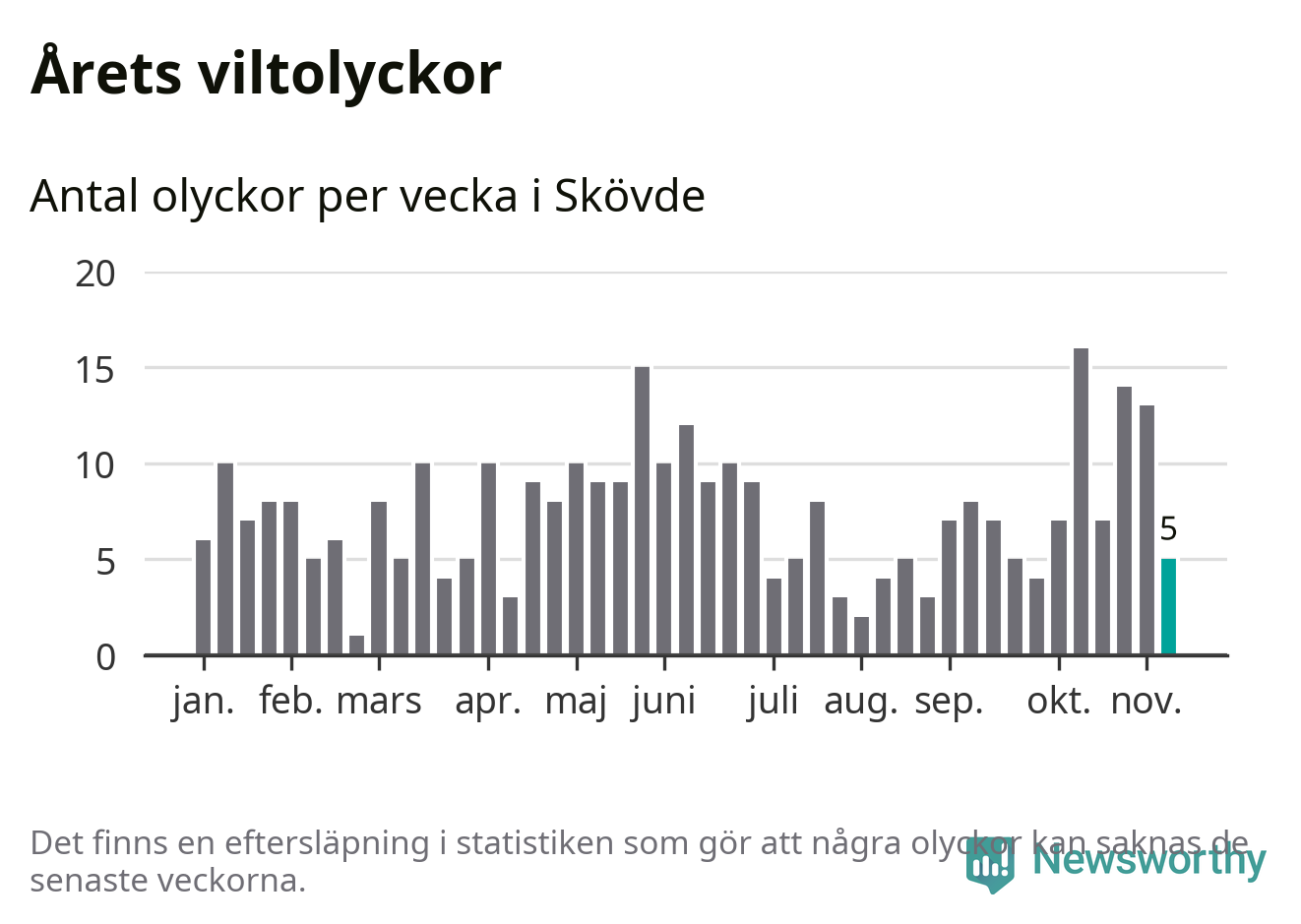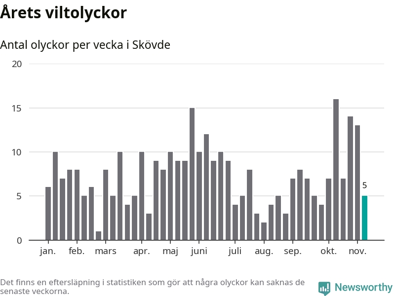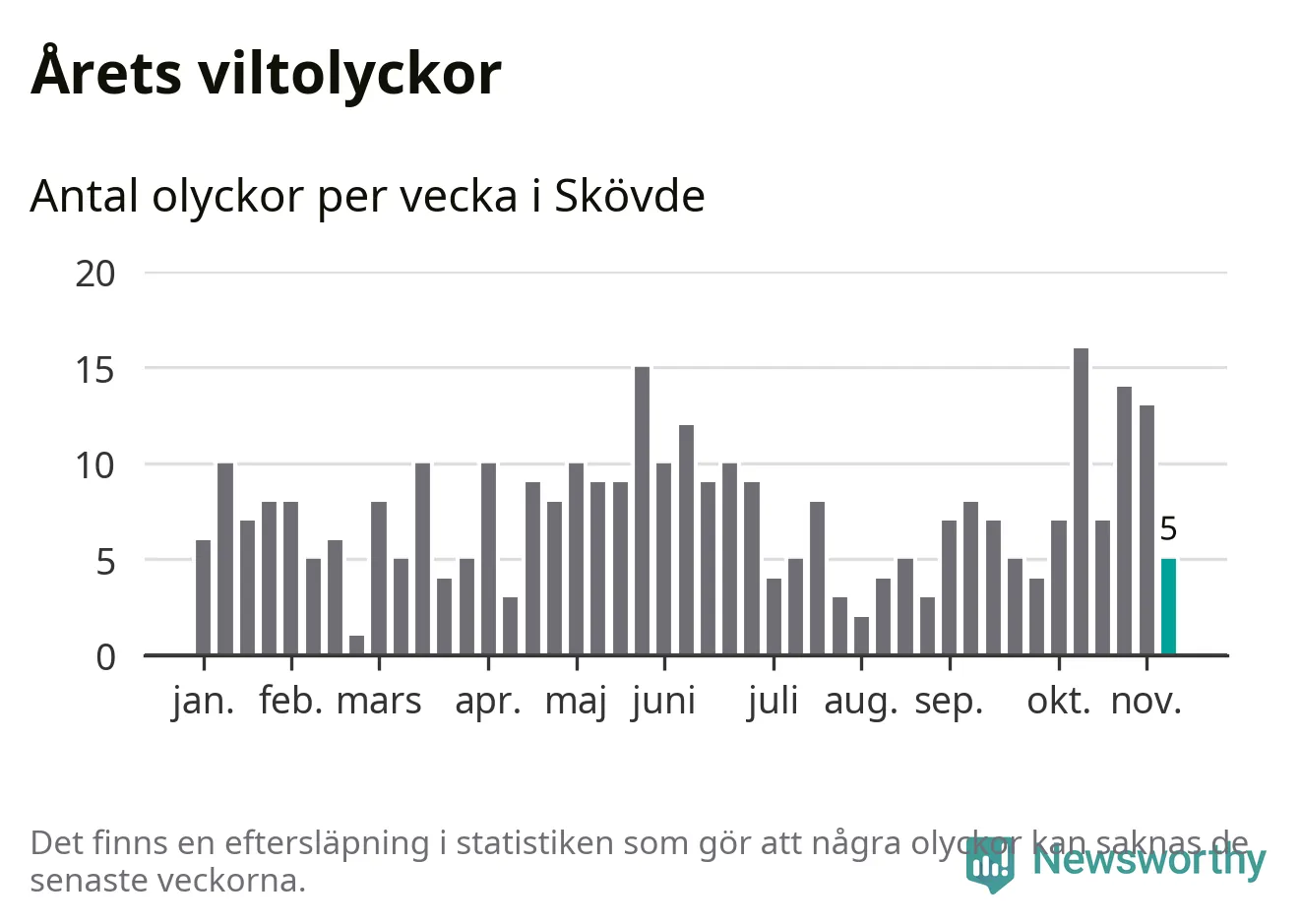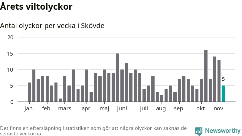 Hittills har fem viltolyckor rapporterats in i Skövde kommun från vecka 46. Se listan här.