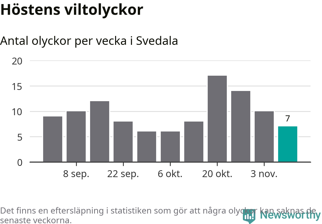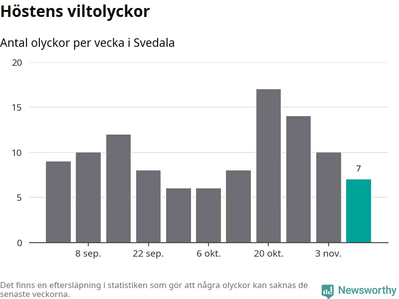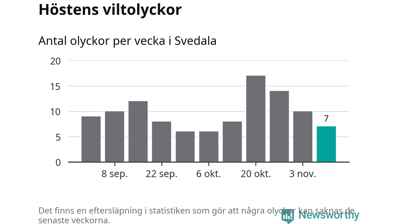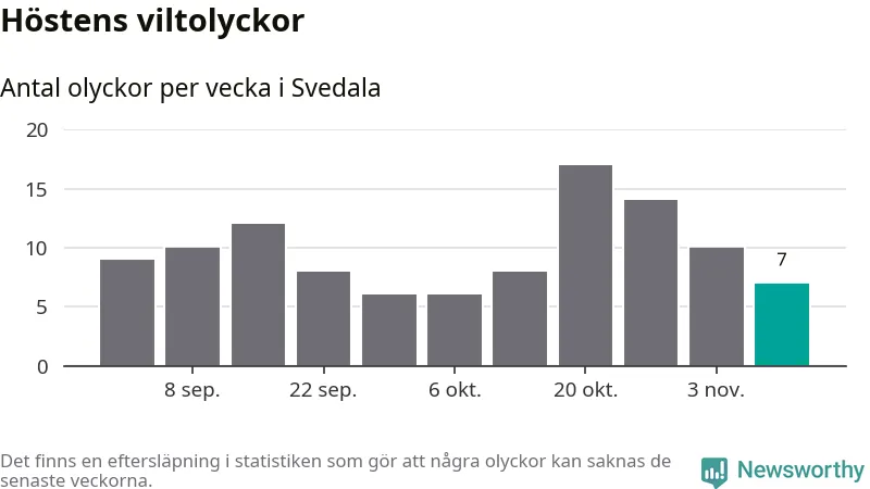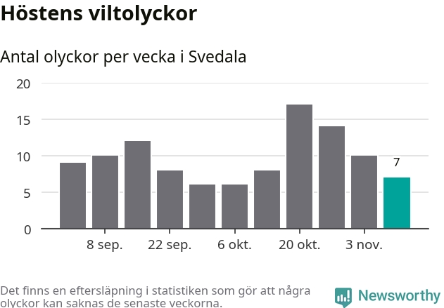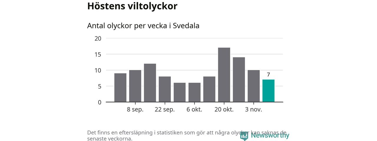 Under vecka 46 rapporterades sju viltolyckor in i Svedala kommun. Därmed har det inträffat fler viltolyckor hittills den här hösten, än det brukar göra en hel genomsnittlig höst.