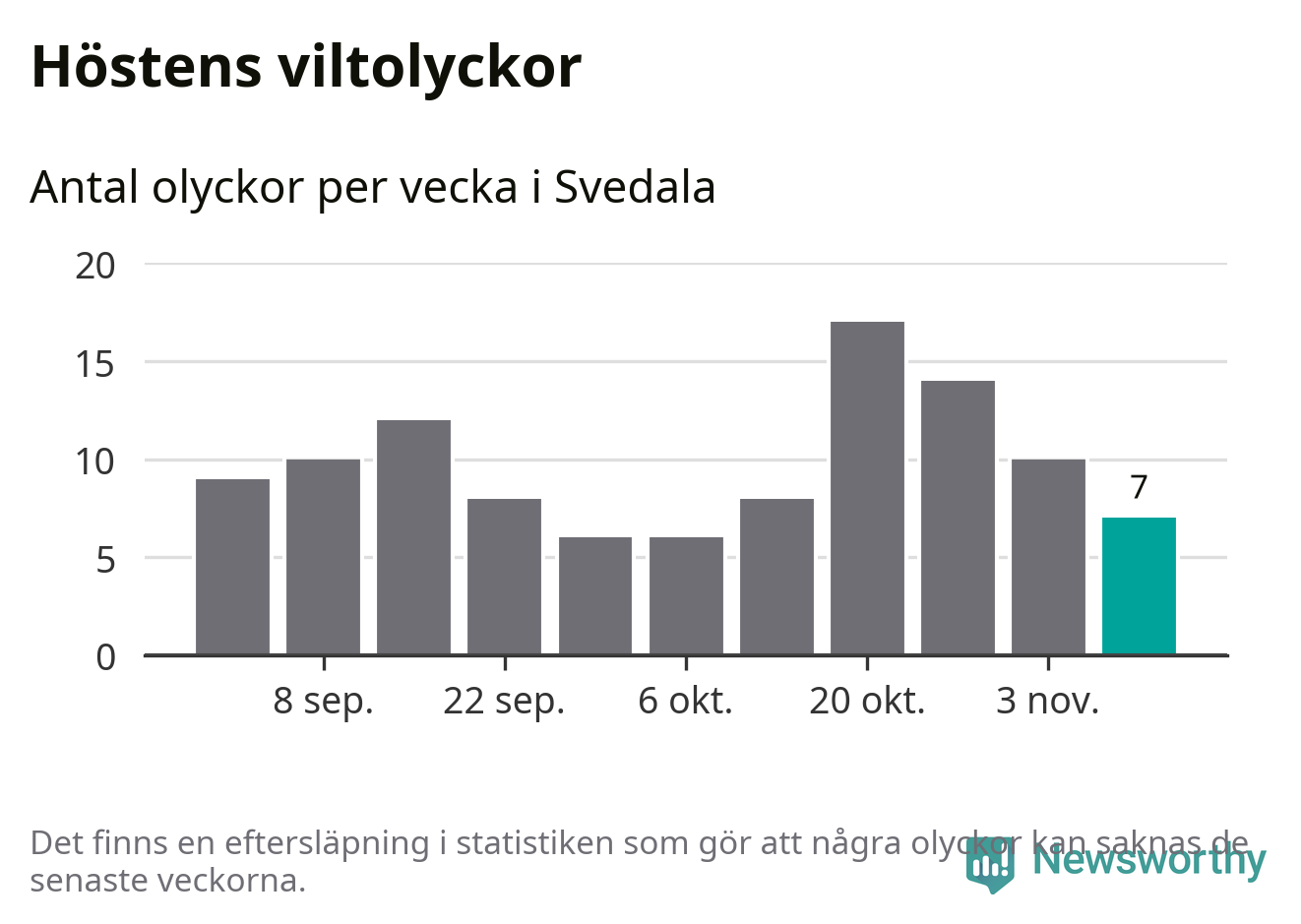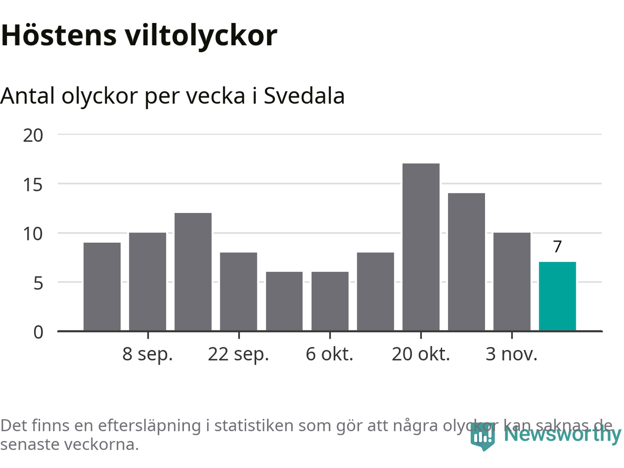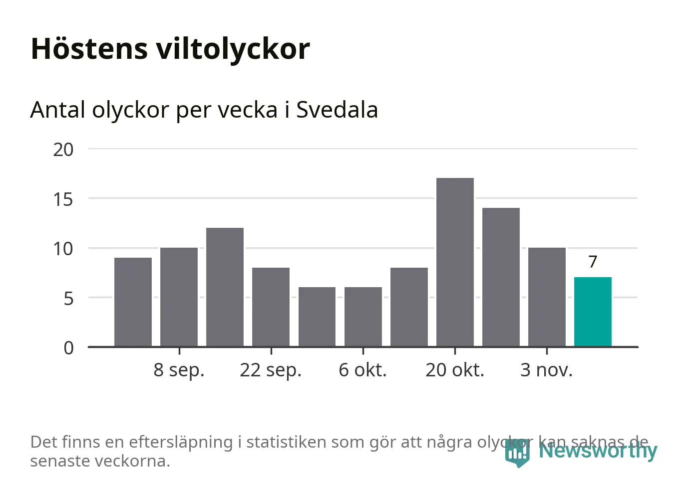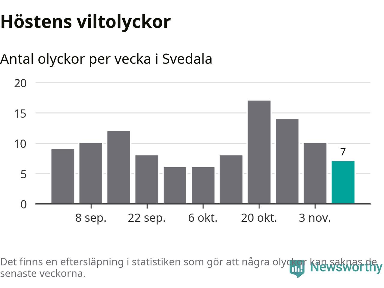 Under vecka 46 rapporterades sju viltolyckor in i Svedala kommun. Därmed har det inträffat fler viltolyckor hittills den här hösten, än det brukar göra en hel genomsnittlig höst.