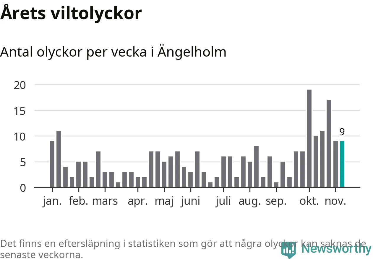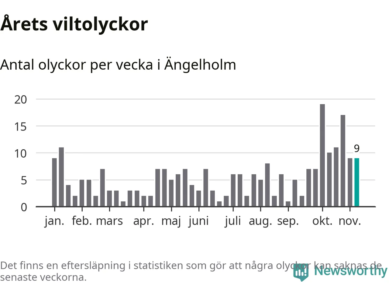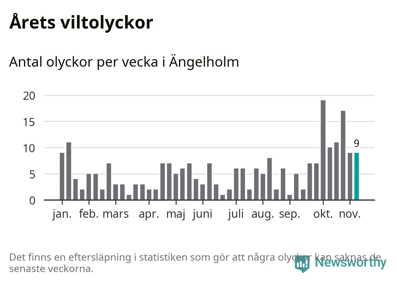 Hittills har nio viltolyckor rapporterats in i Ängelholms kommun från vecka 46. Se listan här.