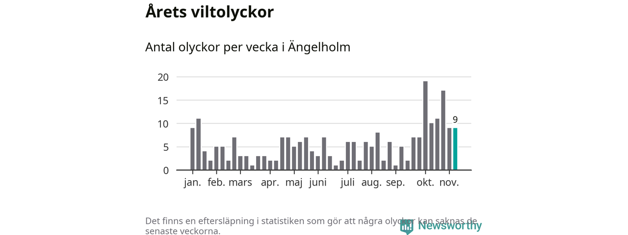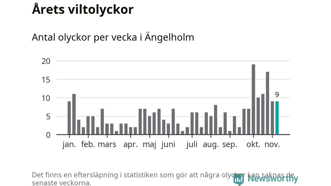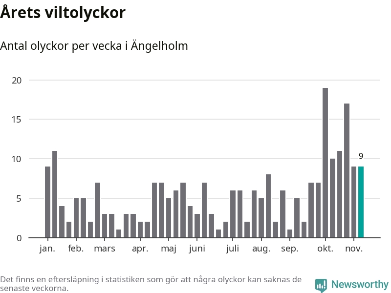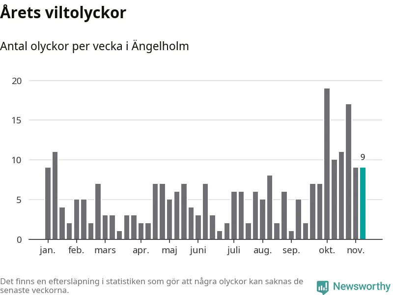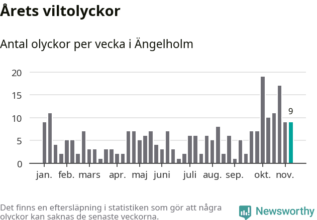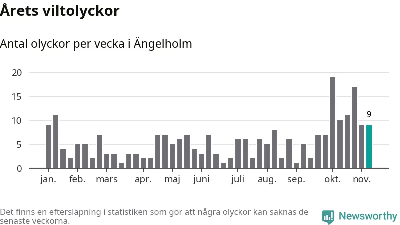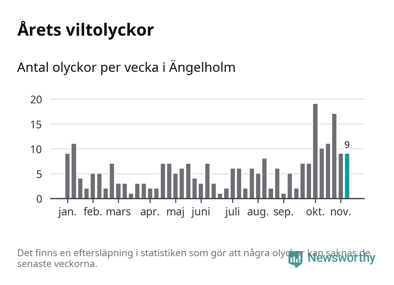 Hittills har nio viltolyckor rapporterats in i Ängelholms kommun från vecka 46. Se listan här.