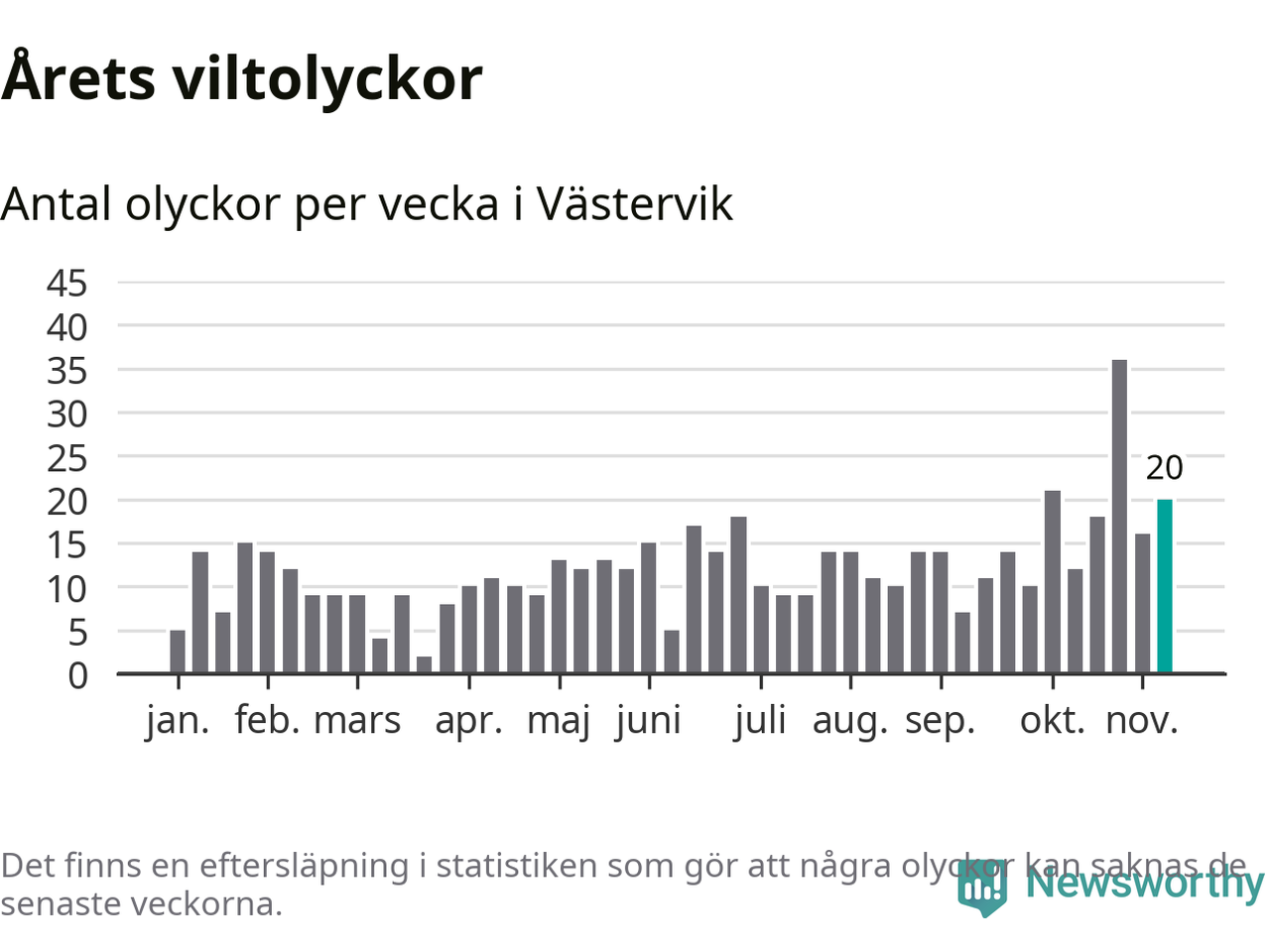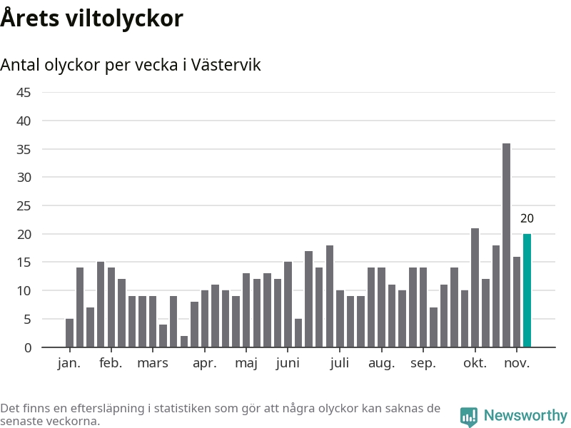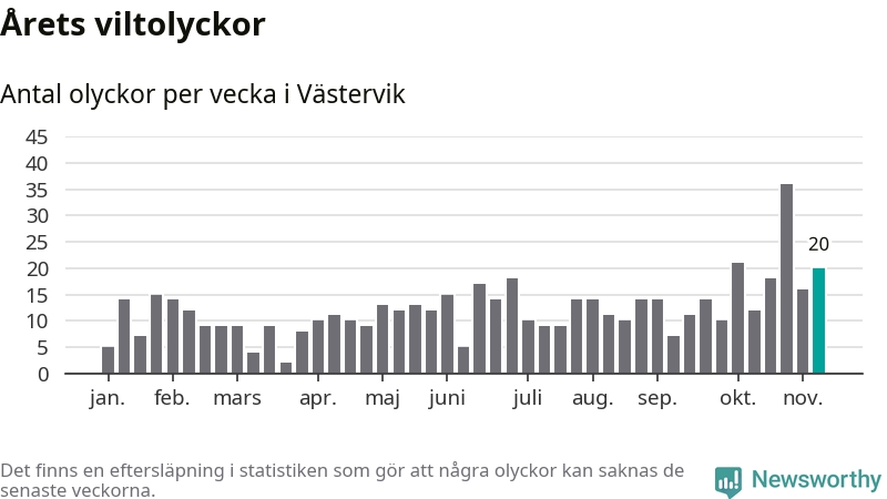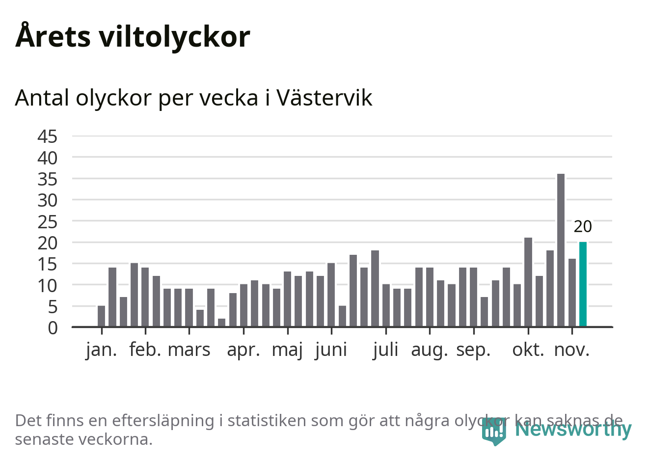 Hittills har 20 viltolyckor rapporterats in i Västerviks kommun från vecka 46. Se listan här.