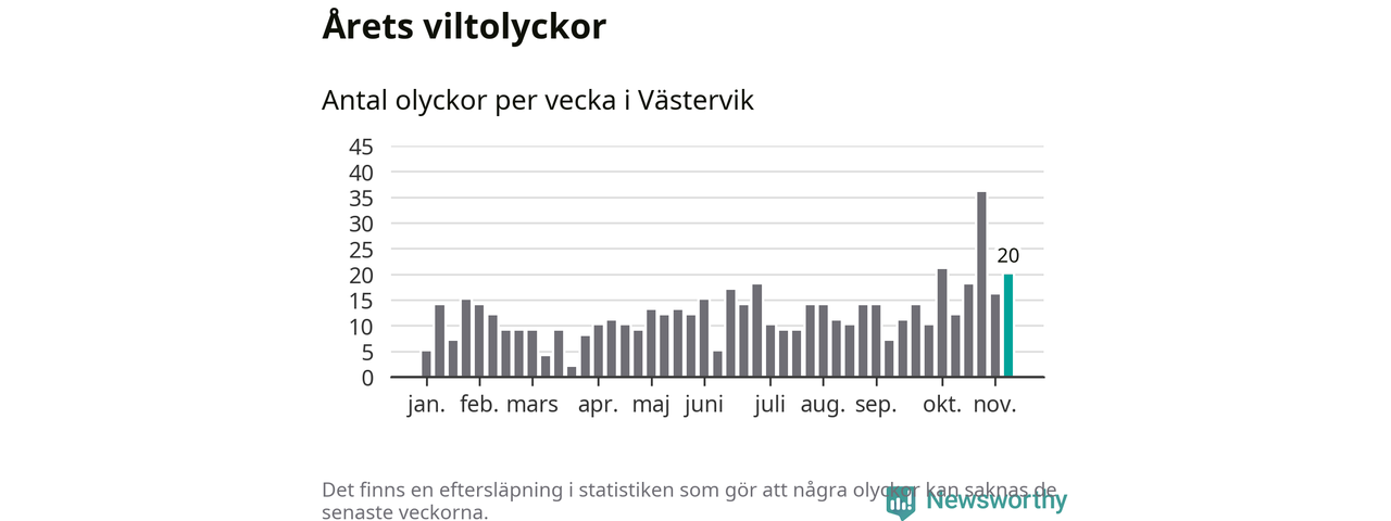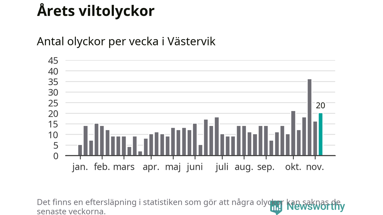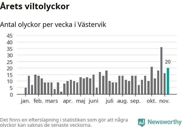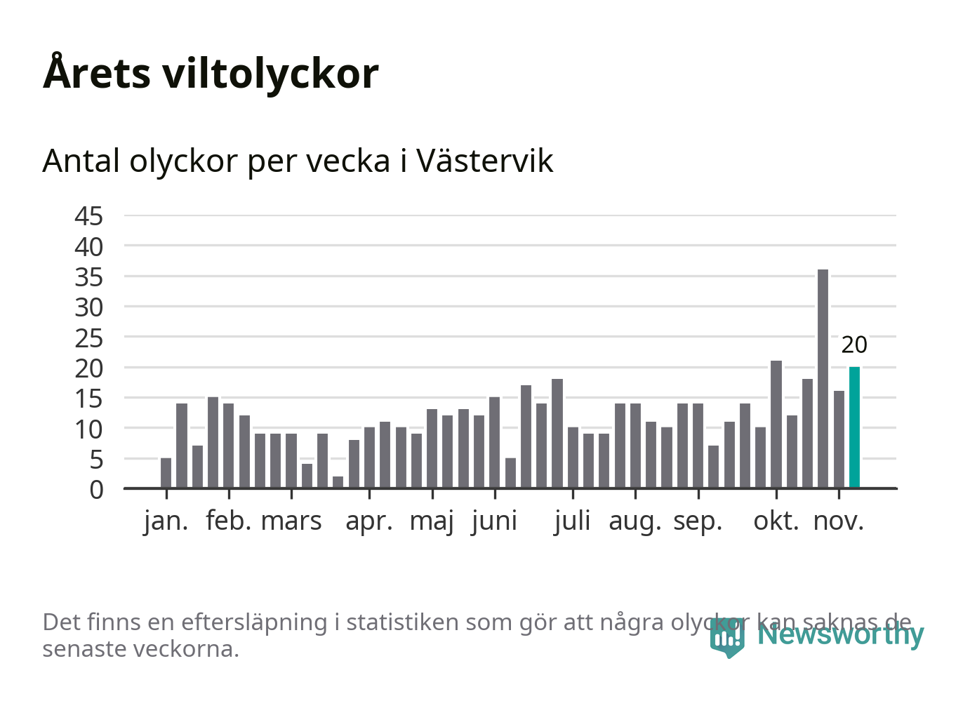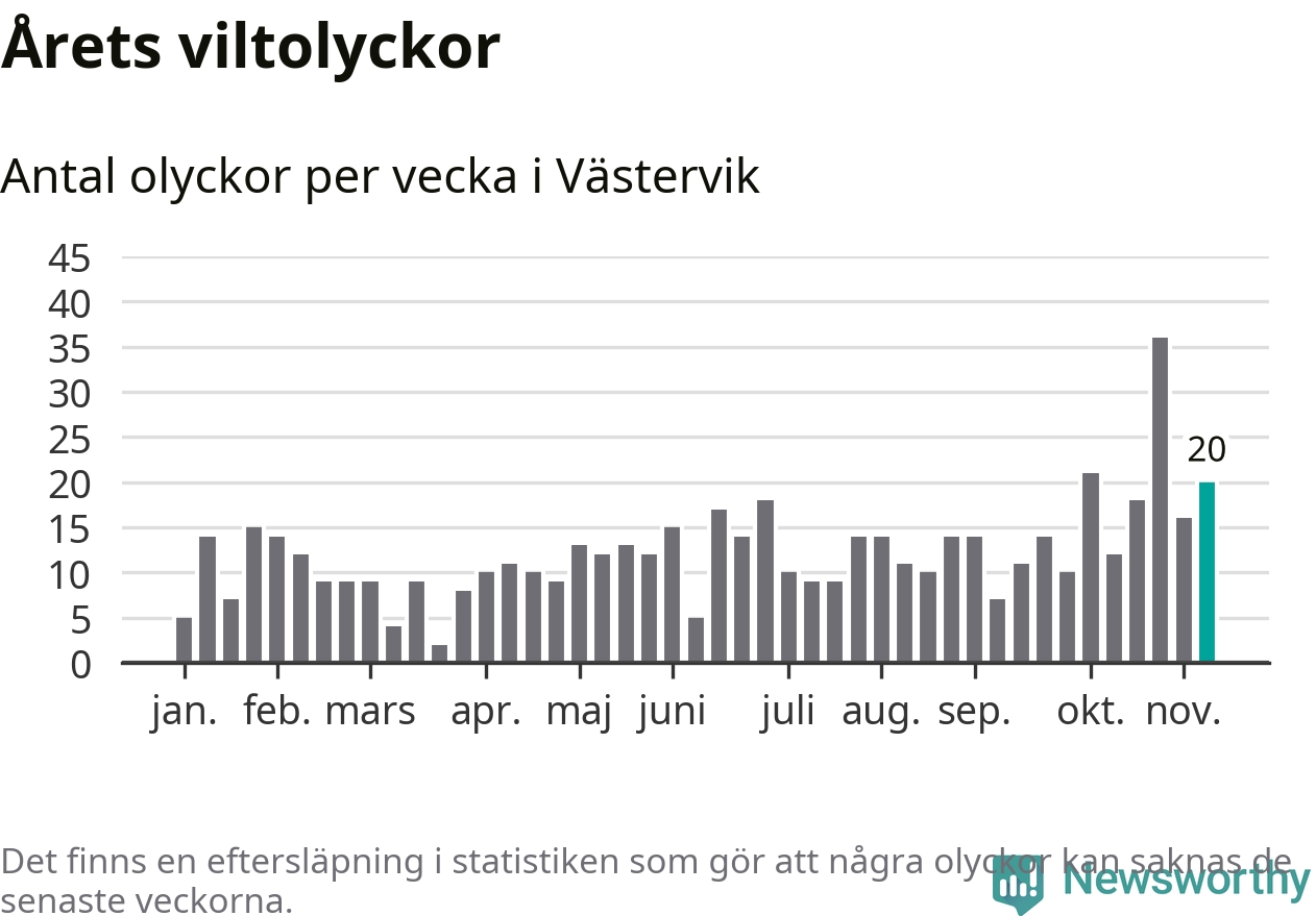 Hittills har 20 viltolyckor rapporterats in i Västerviks kommun från vecka 46. Se listan här.