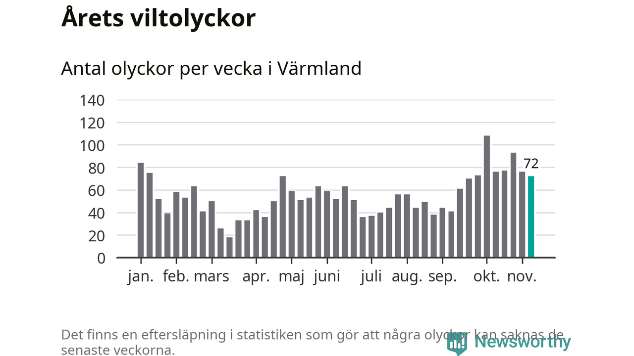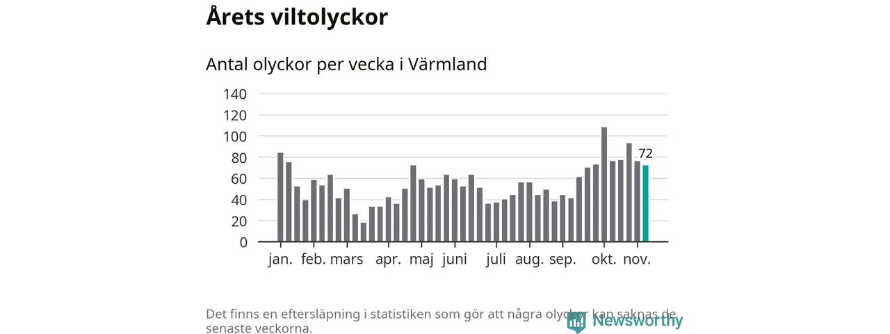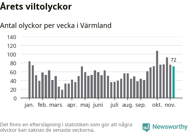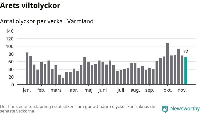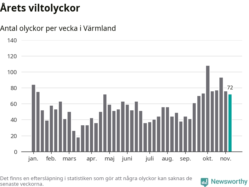 Hittills har 72 viltolyckor rapporterats in i Värmlands län från vecka 46. Se listan här.