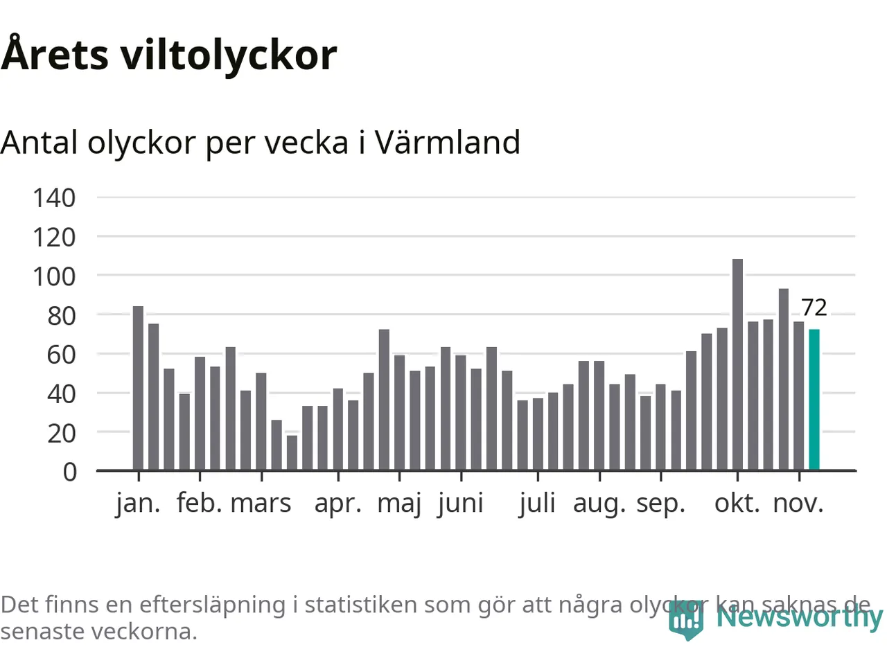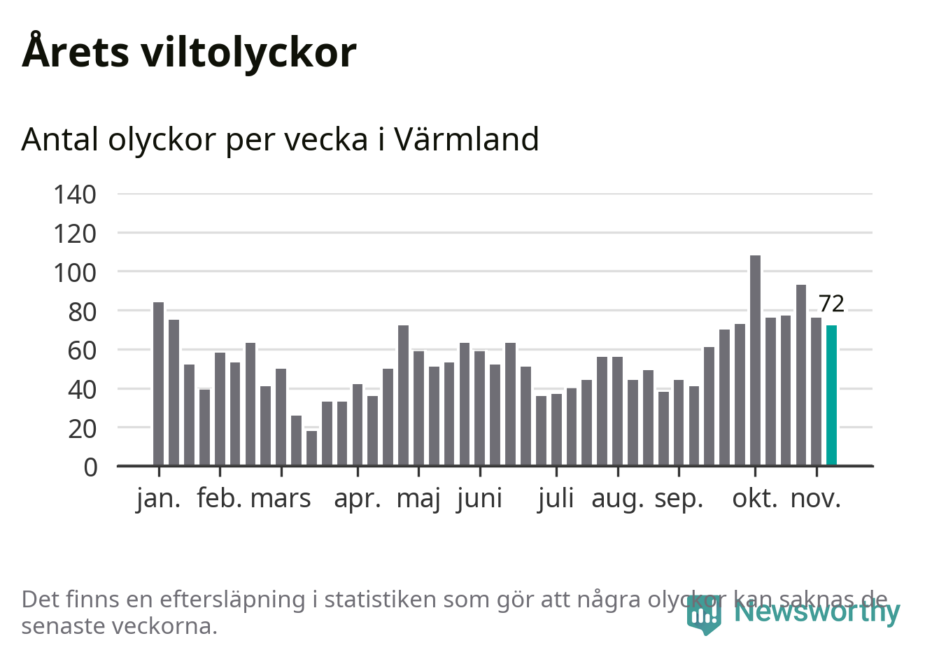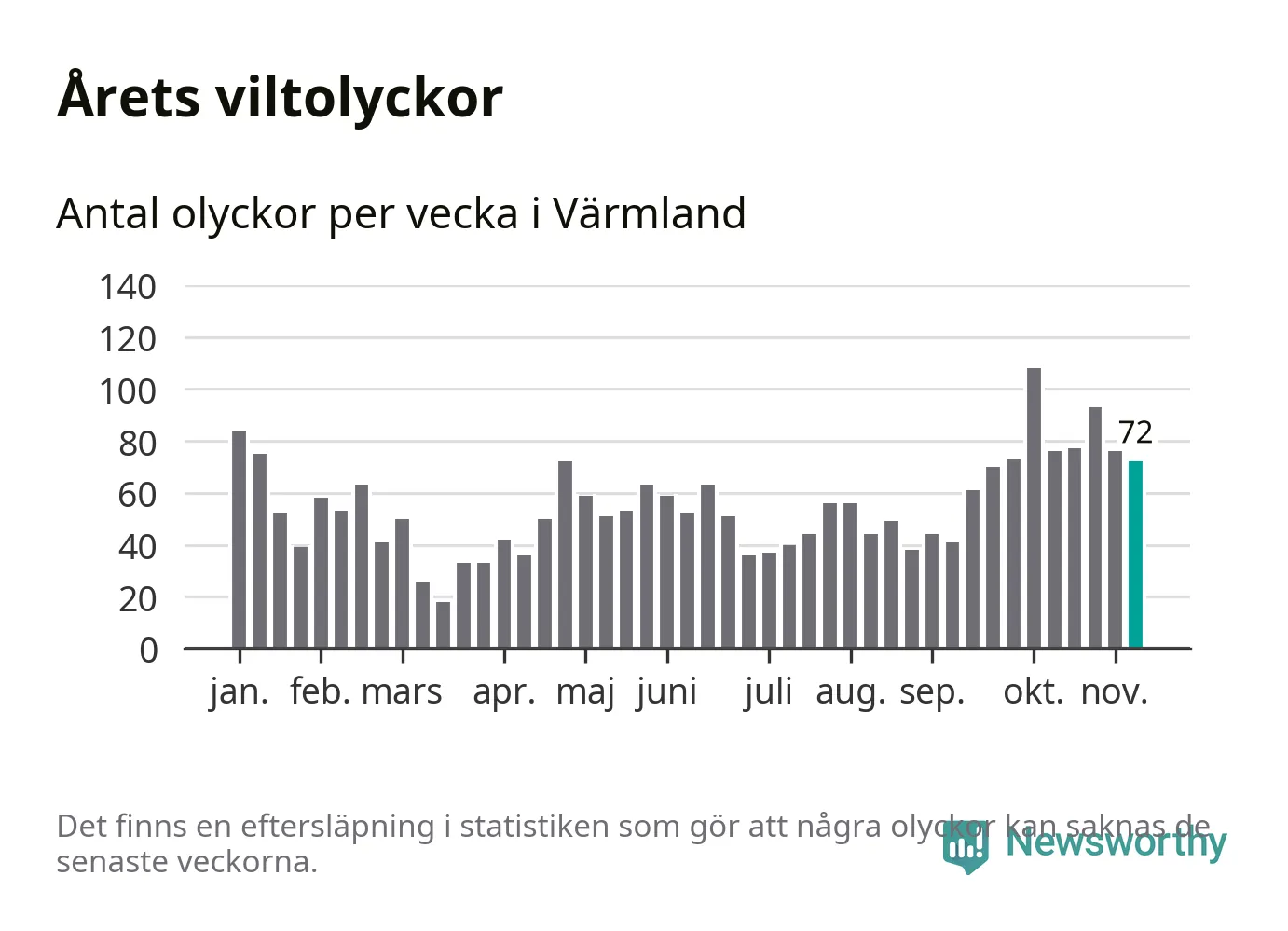Hittills har 72 viltolyckor rapporterats in i Värmlands län från vecka 46. Se listan här.