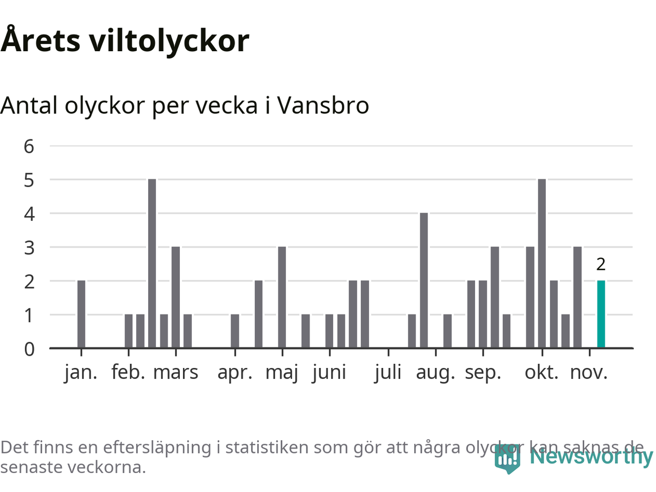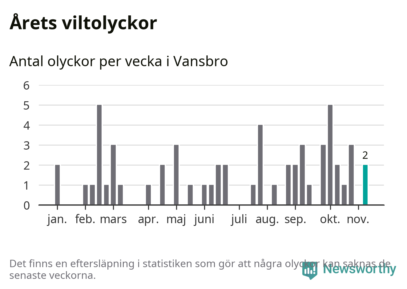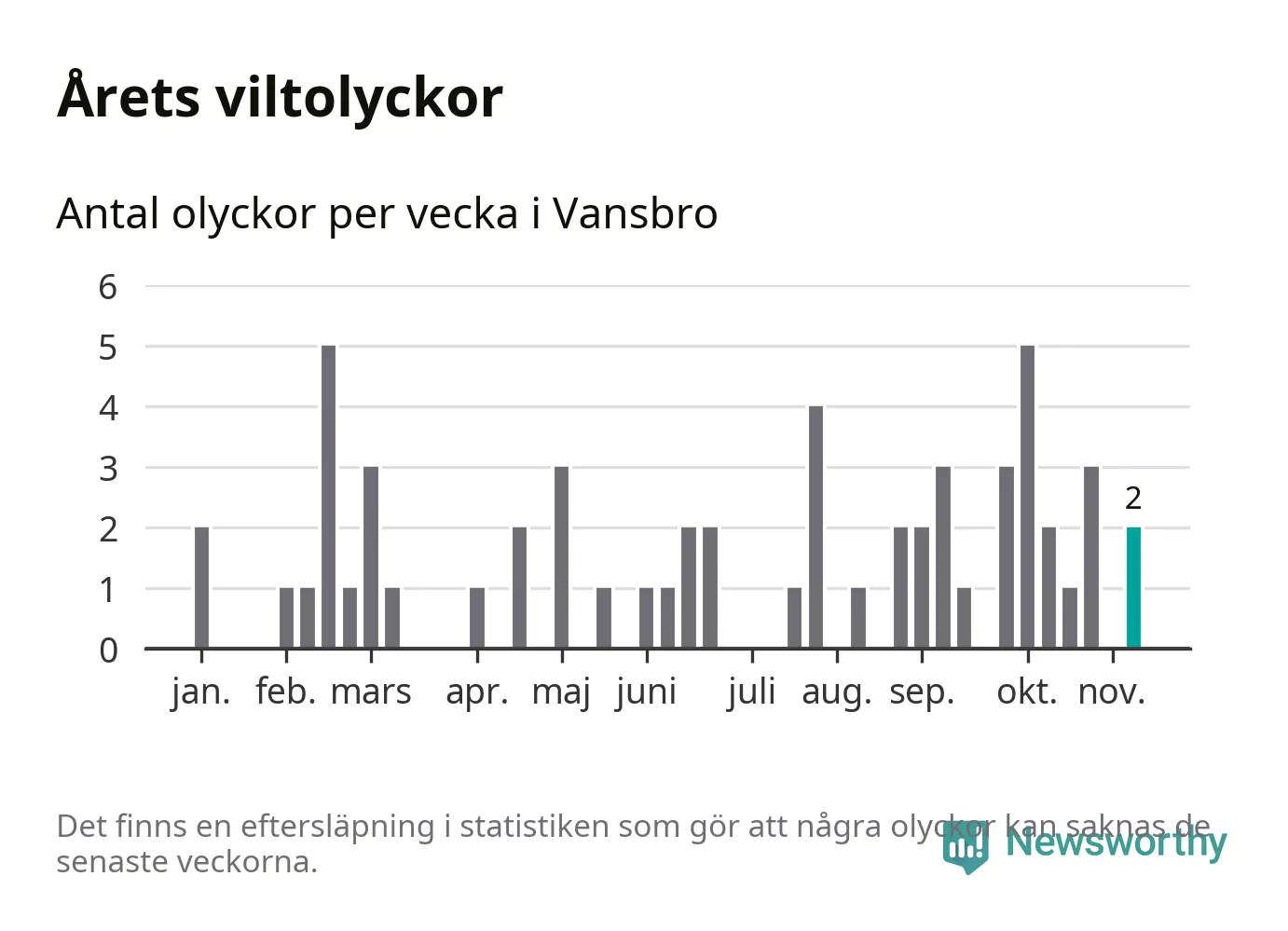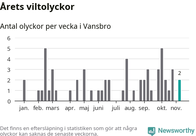 Totalt det här året har det inträffat 57 viltolyckor i kommunen. Det är mindre än genomsnittet för motsvarande period (omkring 67) de senaste tio åren.