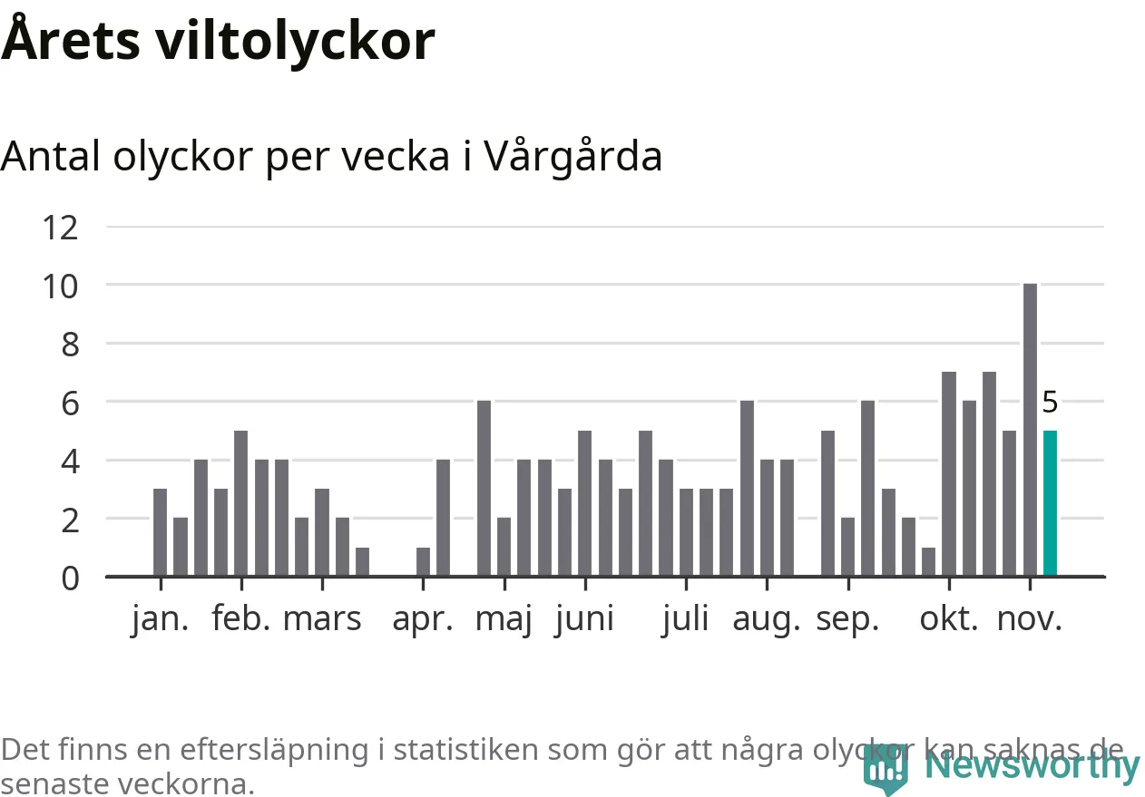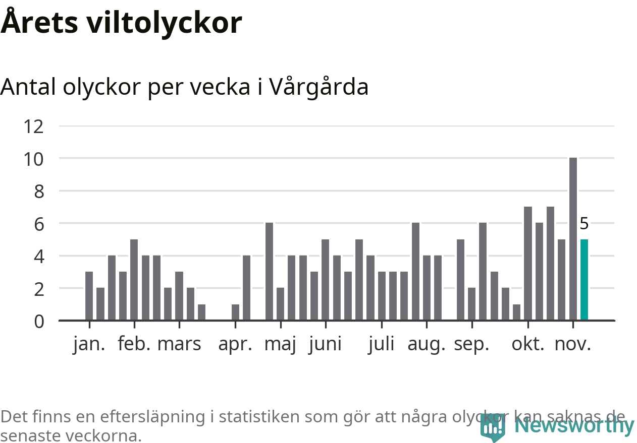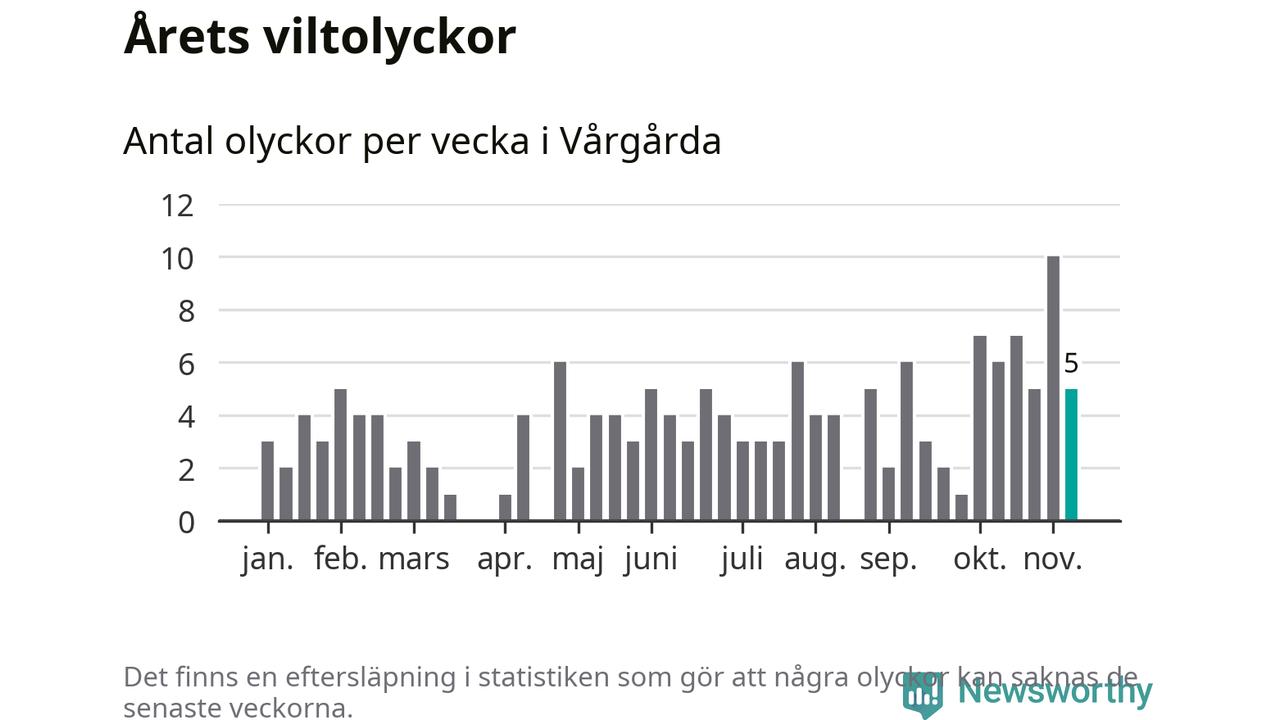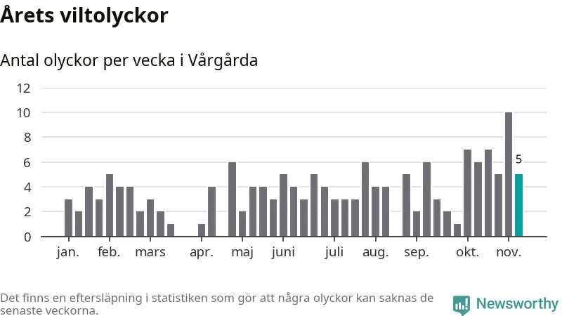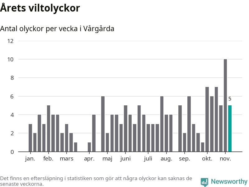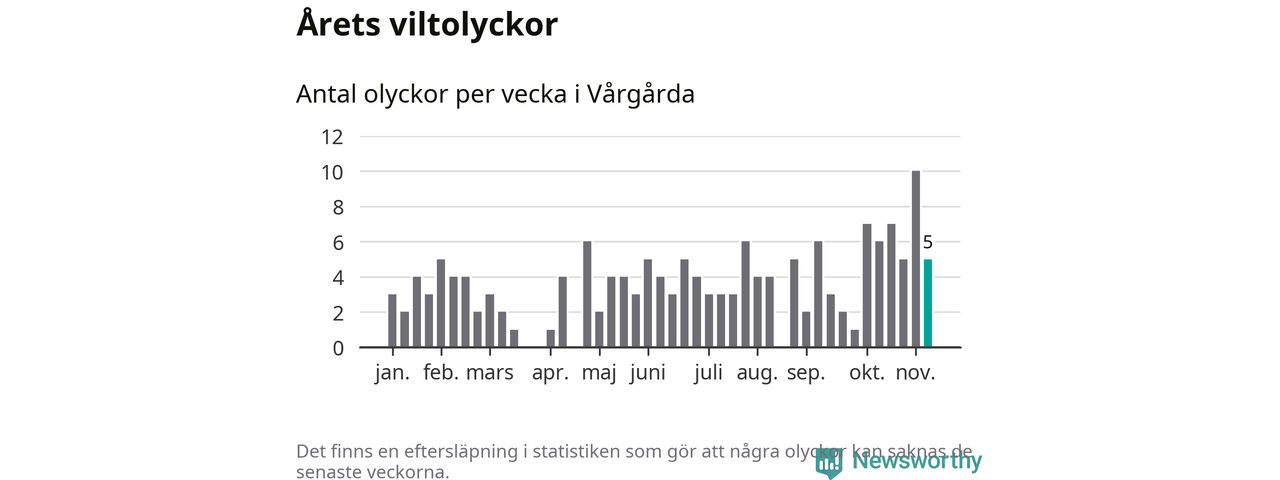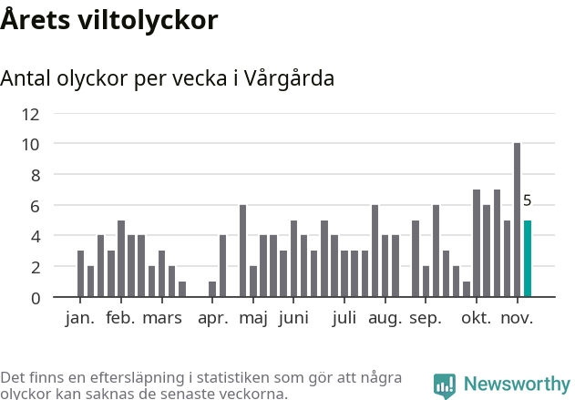 Hittills har fem viltolyckor rapporterats in i Vårgårda kommun från vecka 46. Se listan här.