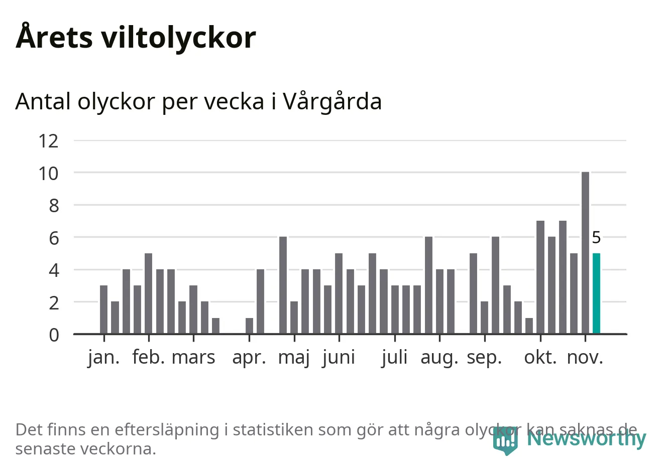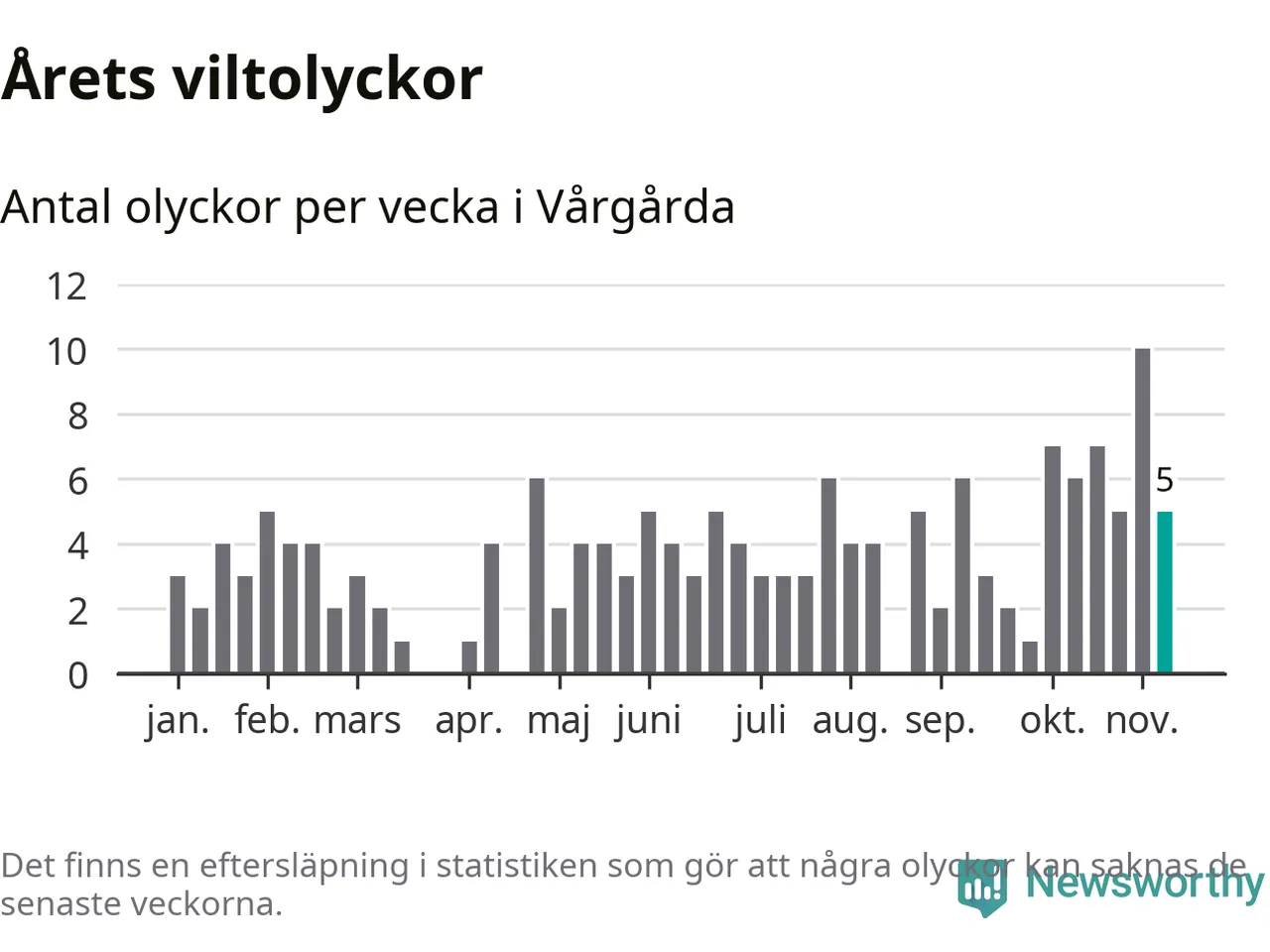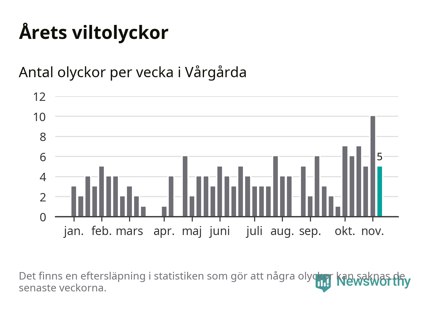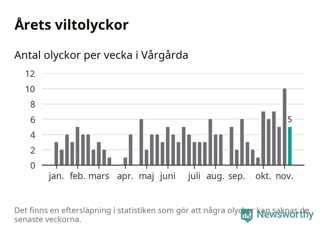 Hittills har fem viltolyckor rapporterats in i Vårgårda kommun från vecka 46. Se listan här.