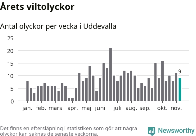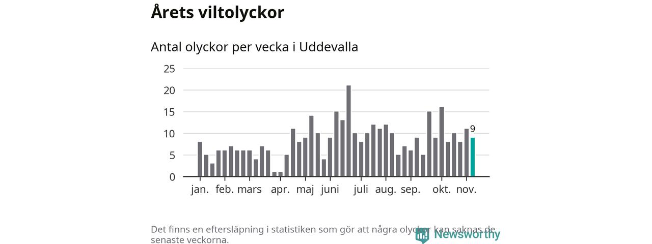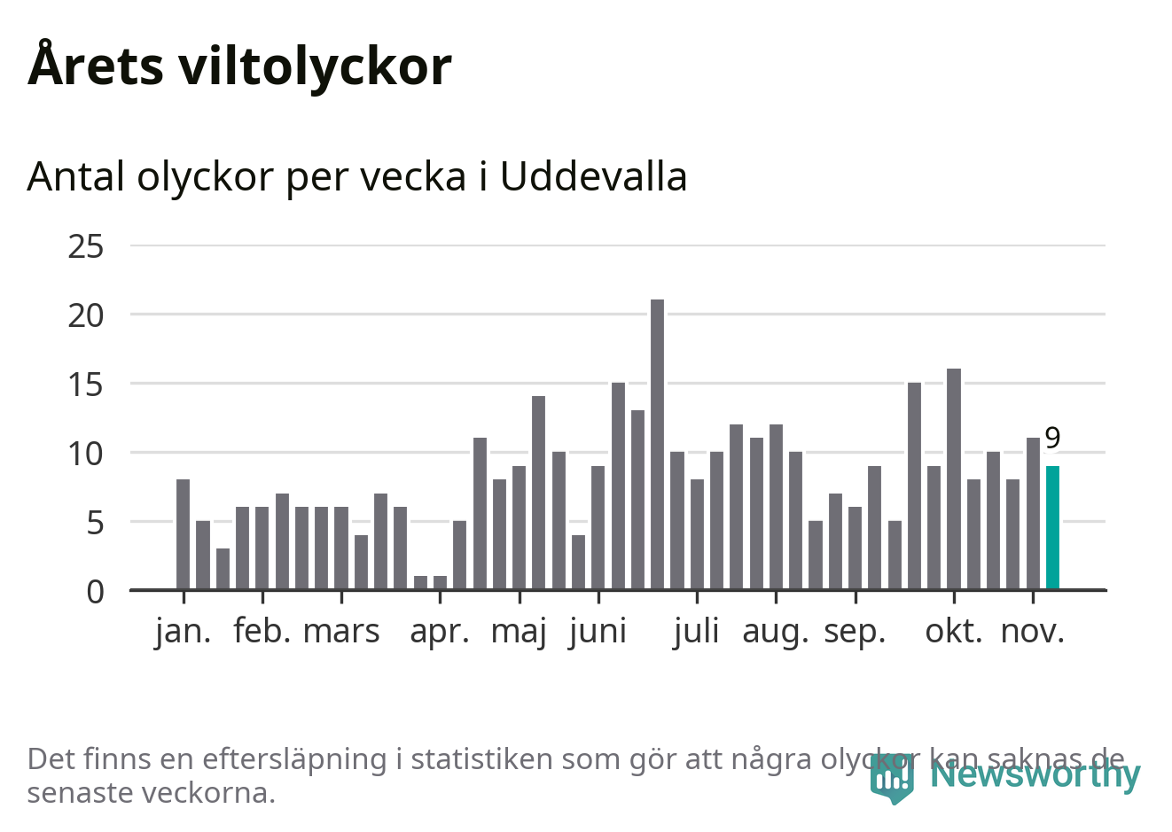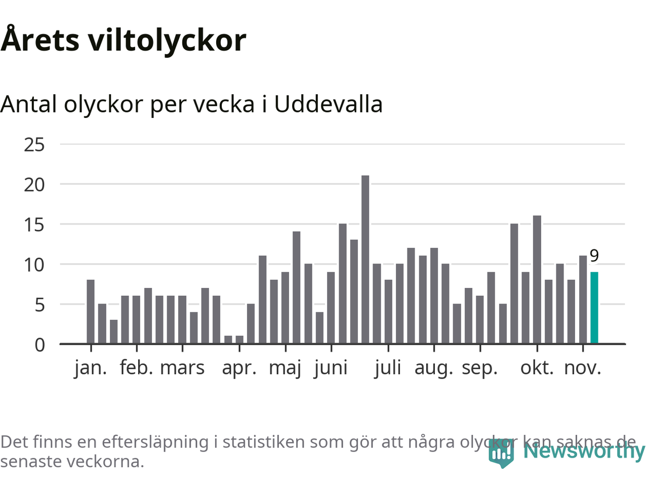 Hittills har nio viltolyckor rapporterats in i Uddevalla kommun från vecka 46. Se listan här.