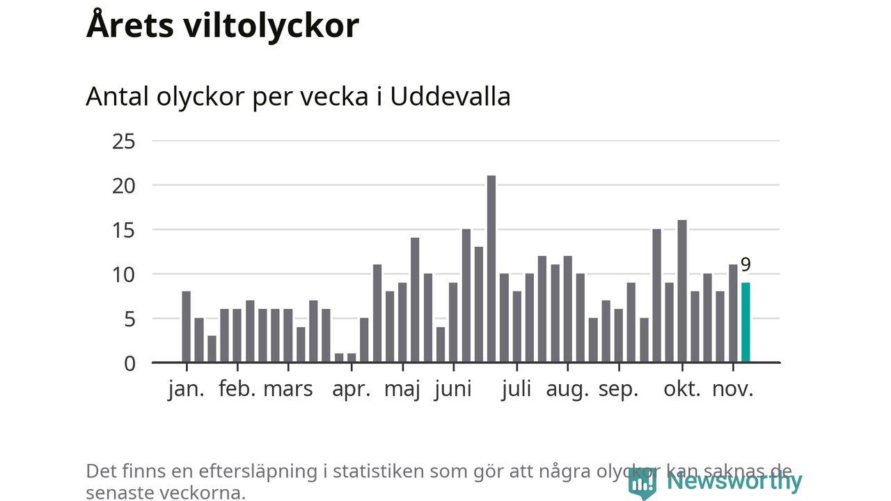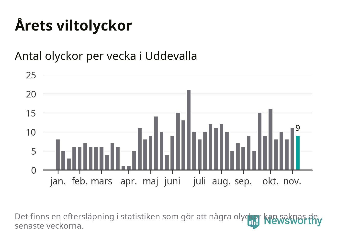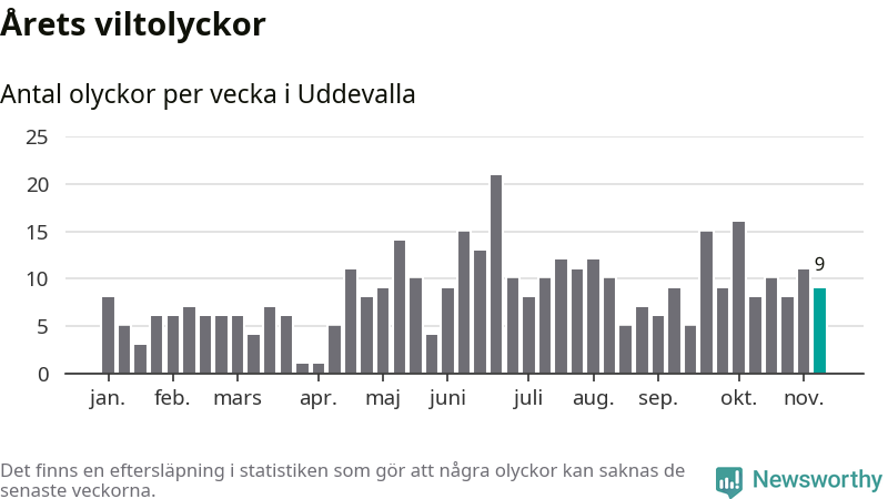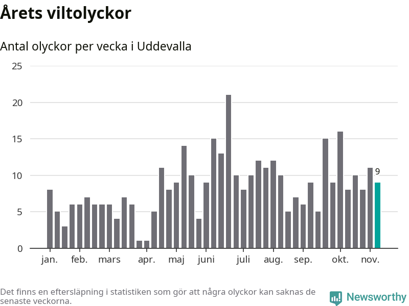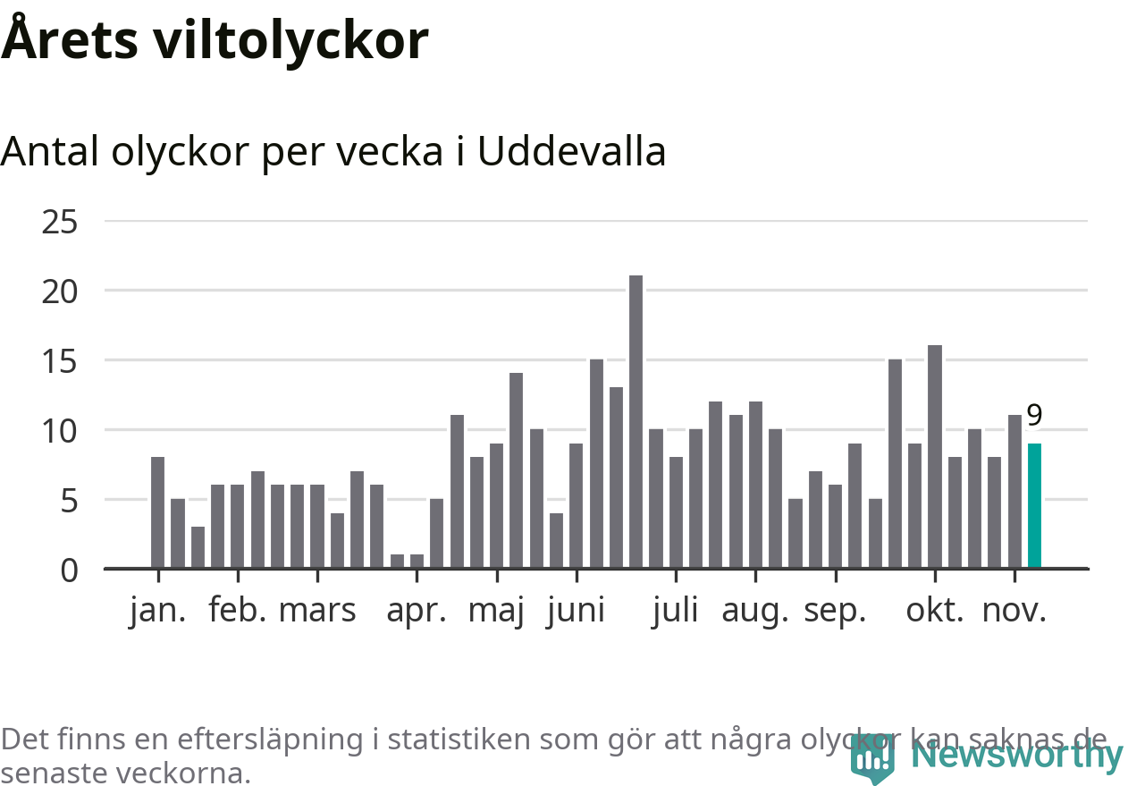 Hittills har nio viltolyckor rapporterats in i Uddevalla kommun från vecka 46. Se listan här.