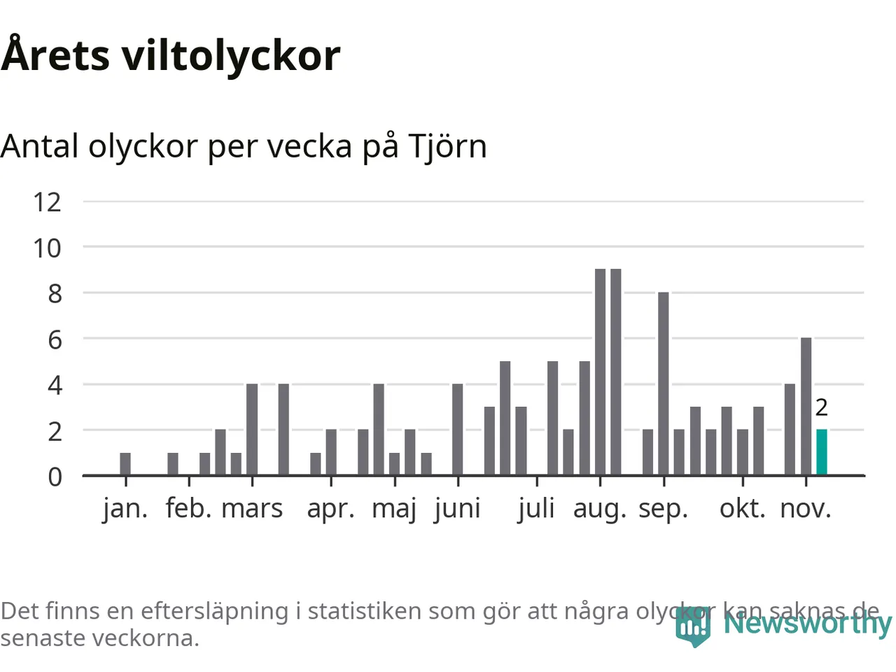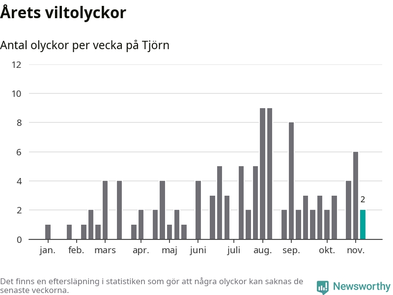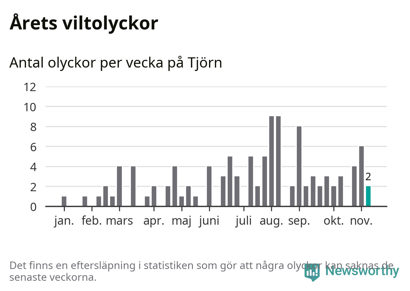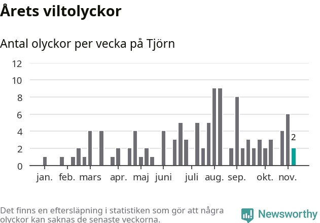 Hittills har två viltolyckor rapporterats in i Tjörns kommun från vecka 46. Se listan här.