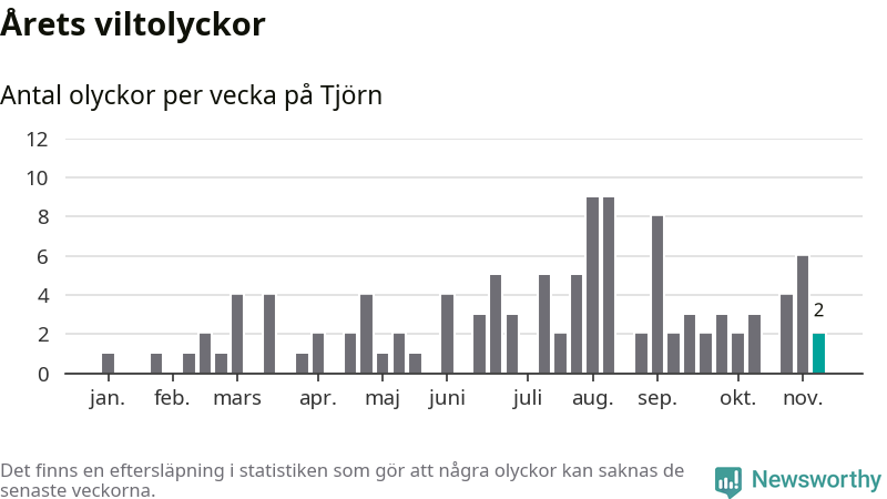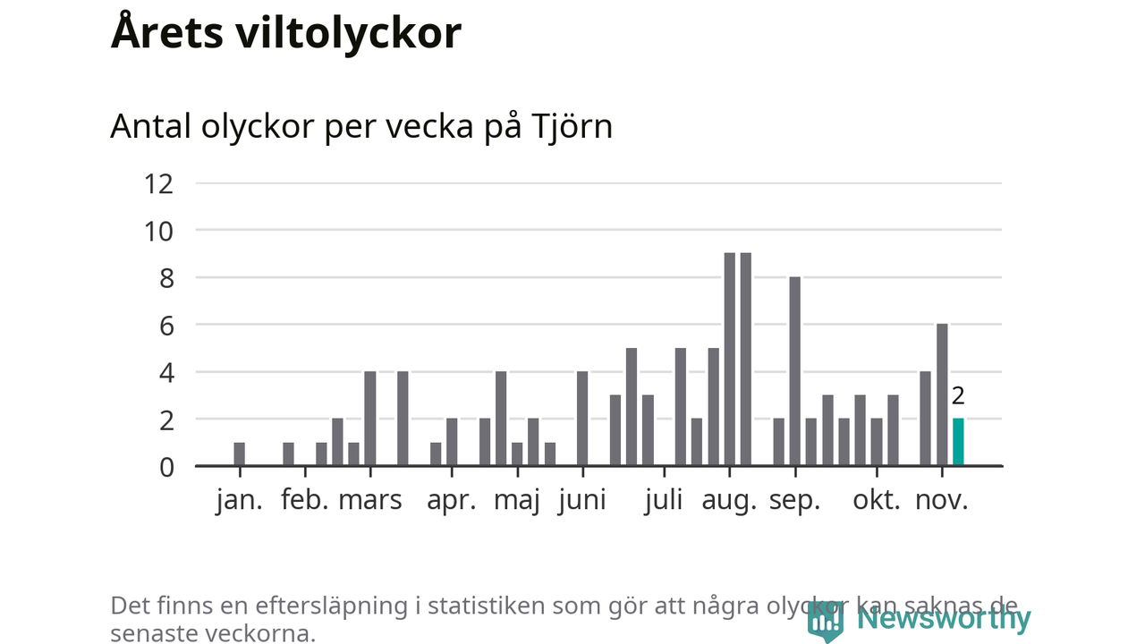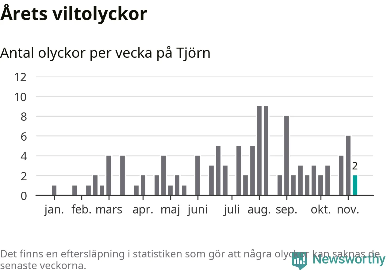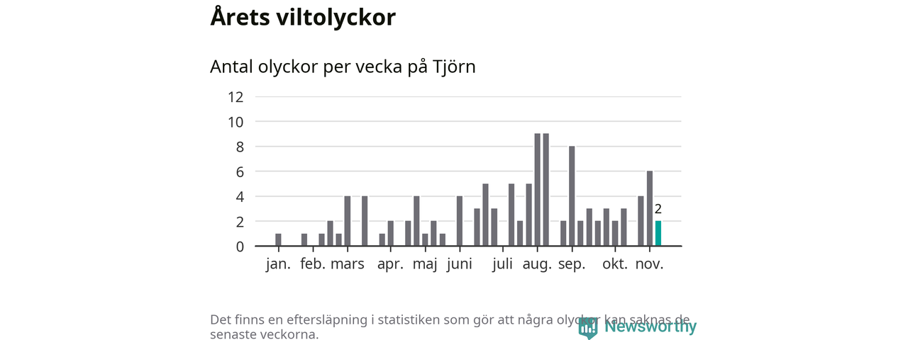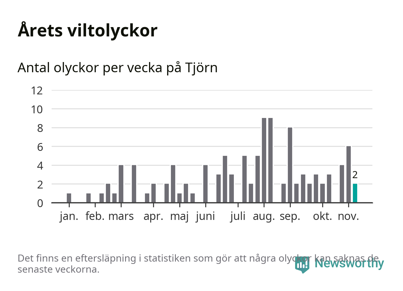 Hittills har två viltolyckor rapporterats in i Tjörns kommun från vecka 46. Se listan här.