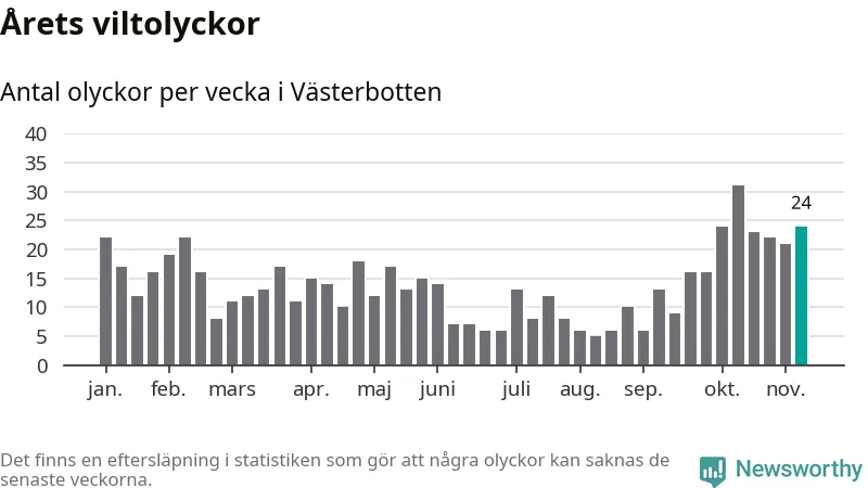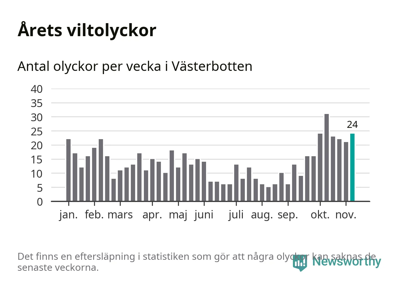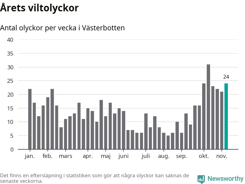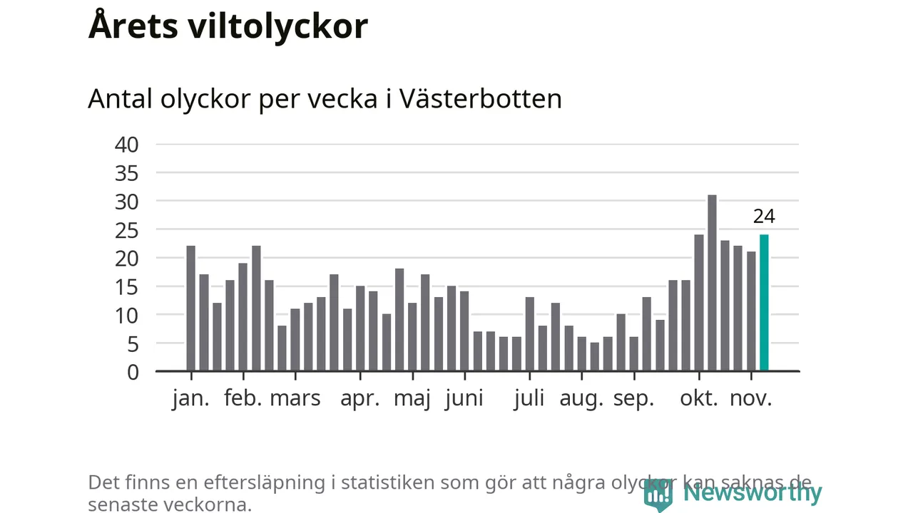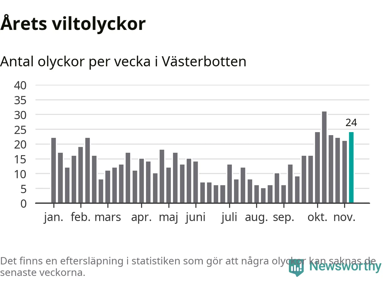 Till påkört vilt räknas även djur som inte kunnat återfinnas. Här visas de olyckor som rapporterats in hitills. Det förekommer felrapporteringar, och det dröjer också ibland innan en olycka rapporteras.