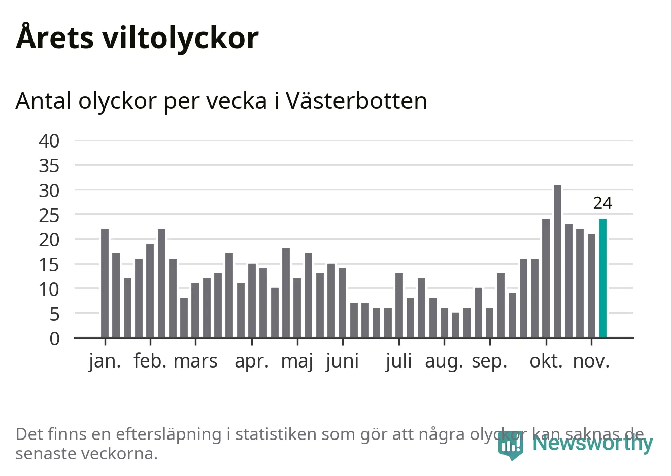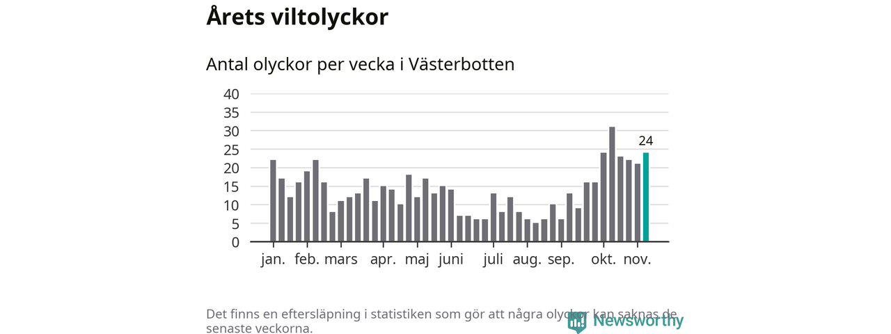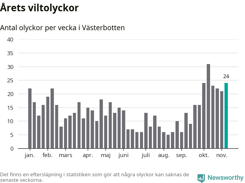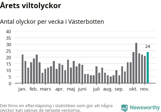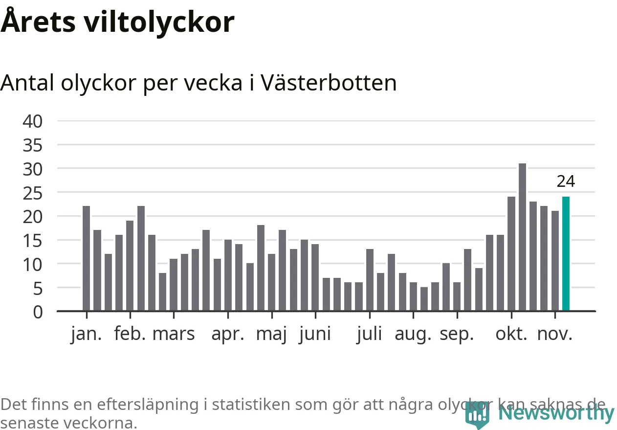 sett till de senaste tio årens statistik. I statistiken ingår inte olyckor med ren, som här räknas som tamdjur.