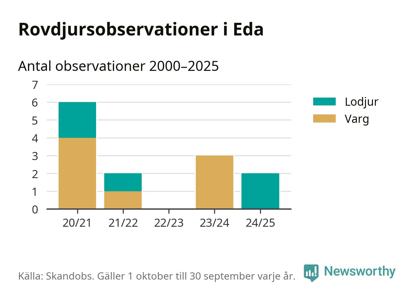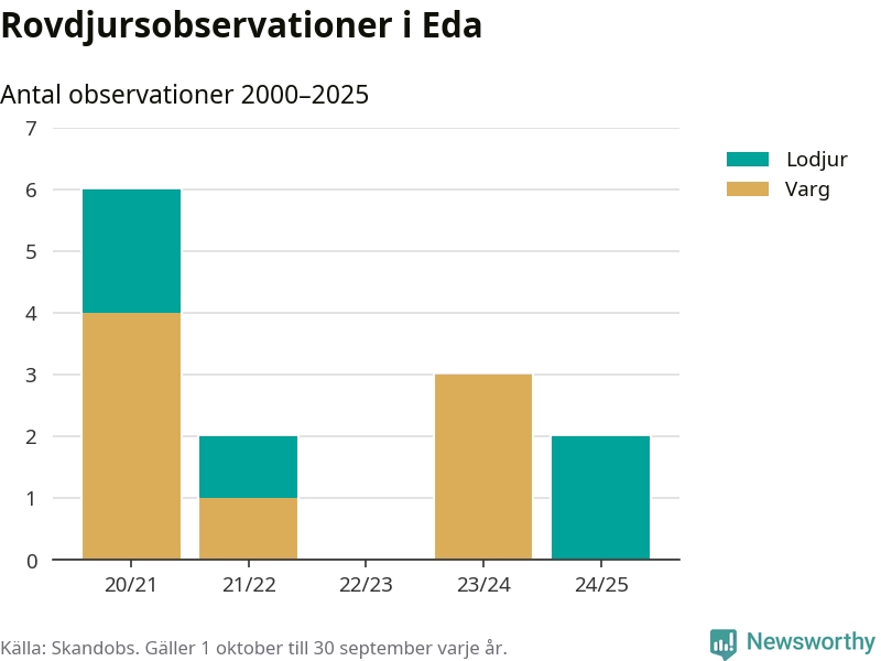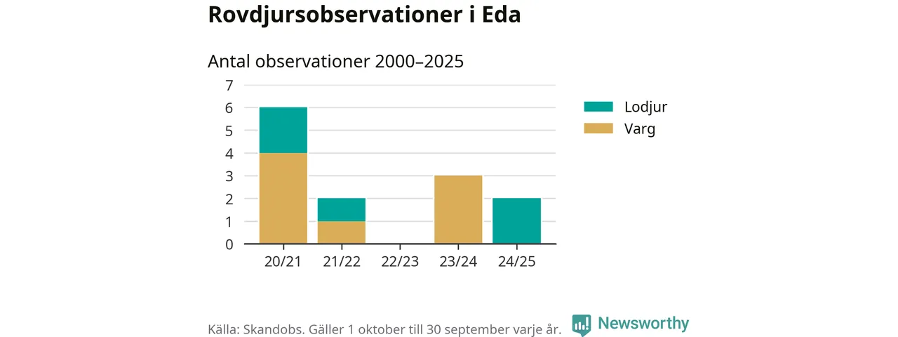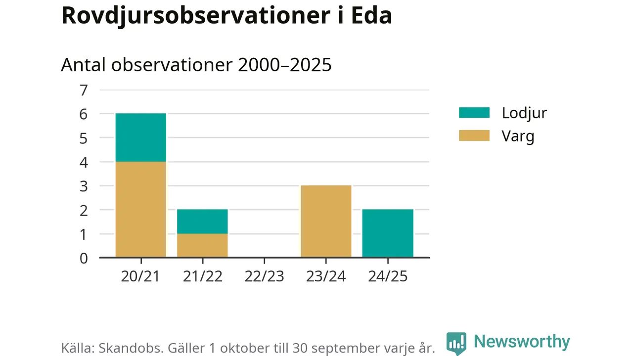 Där kan vem som helst rapportera sina observationer av de stora rovdjuren björn, varg, lodjur och järv. Mellan 1 oktober 2024 och 30 september i år har knappt 10 000 observationer registrerats i landet. Det kan vara synobservationer, foton, spår, spillning, döda bytesdjur eller andra tecken på rovdjursförekomst. I Eda handlar det om totalt två observationer av lodjur.