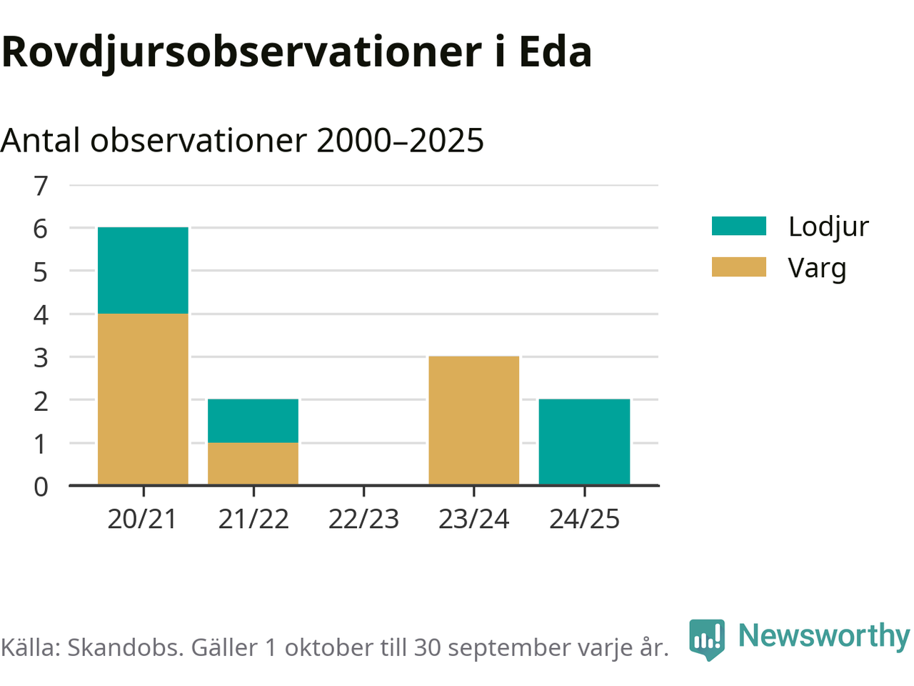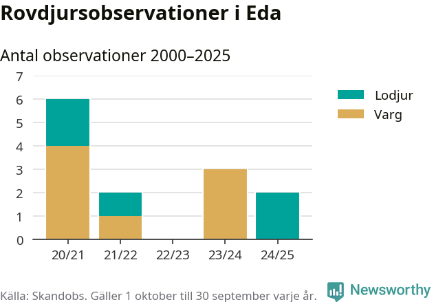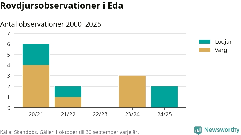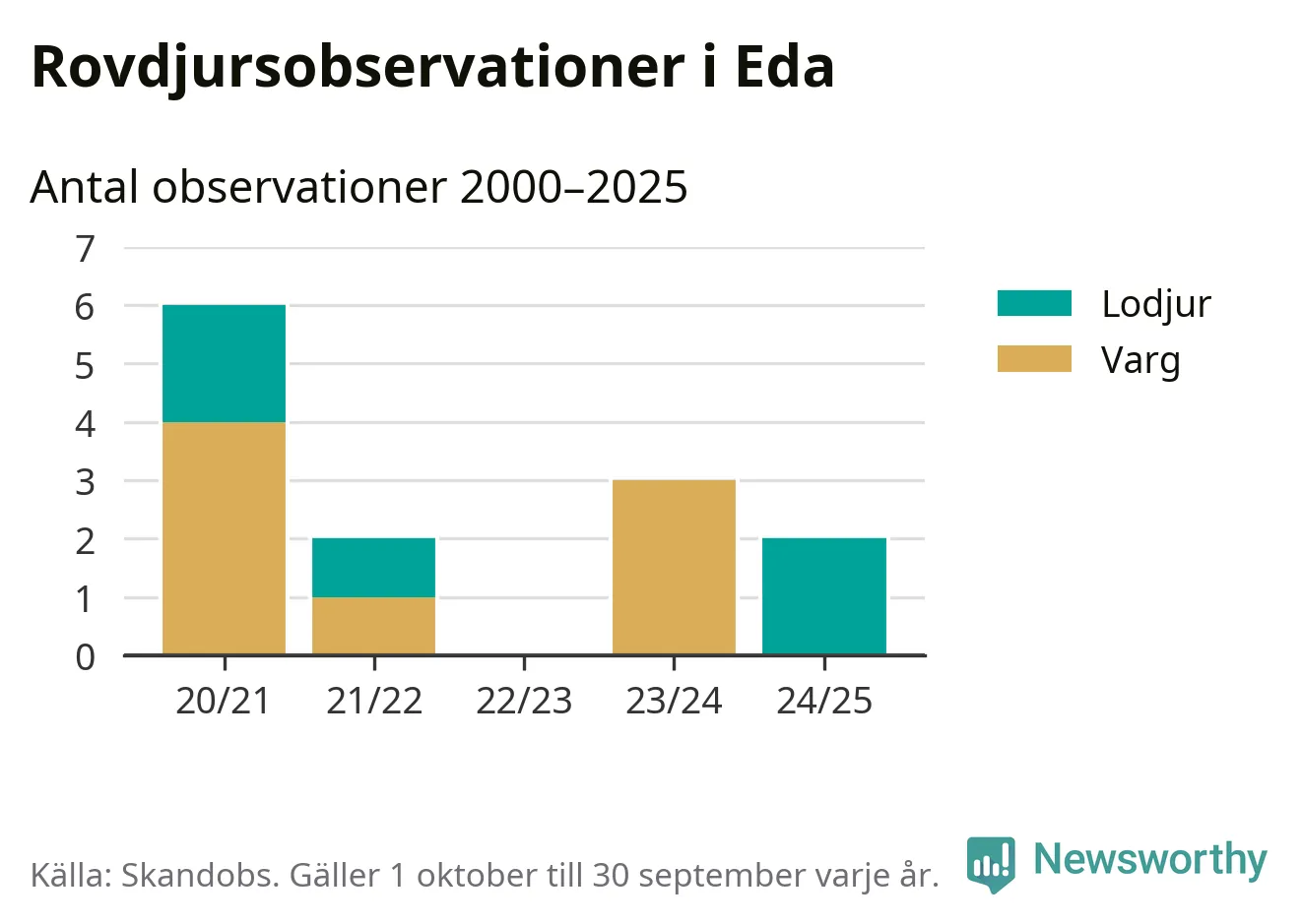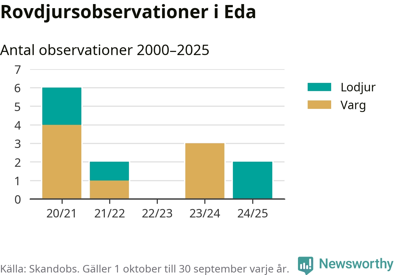 Där kan vem som helst rapportera sina observationer av de stora rovdjuren björn, varg, lodjur och järv. Mellan 1 oktober 2024 och 30 september i år har knappt 10 000 observationer registrerats i landet. Det kan vara synobservationer, foton, spår, spillning, döda bytesdjur eller andra tecken på rovdjursförekomst. I Eda handlar det om totalt två observationer av lodjur.
