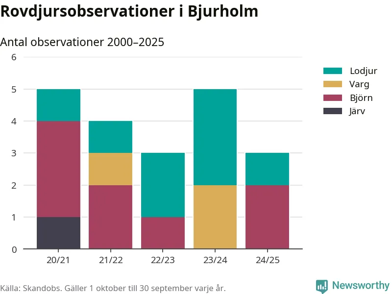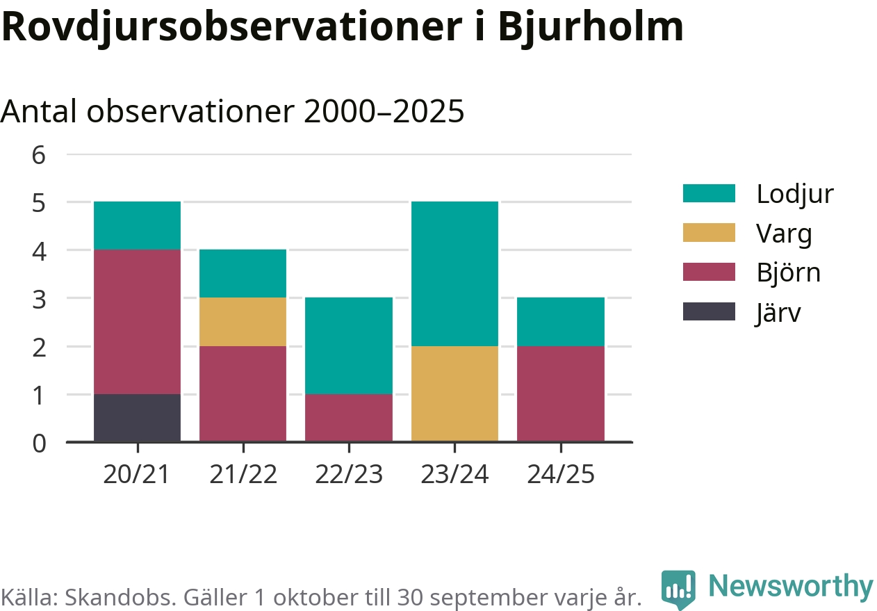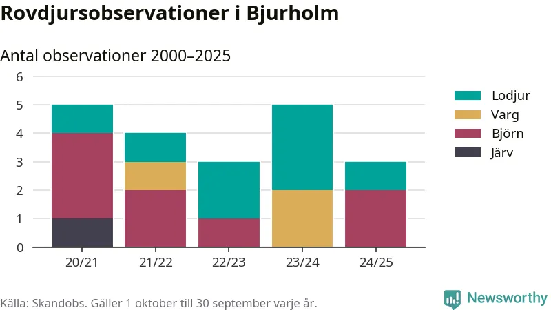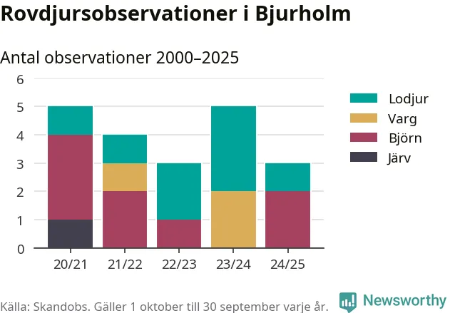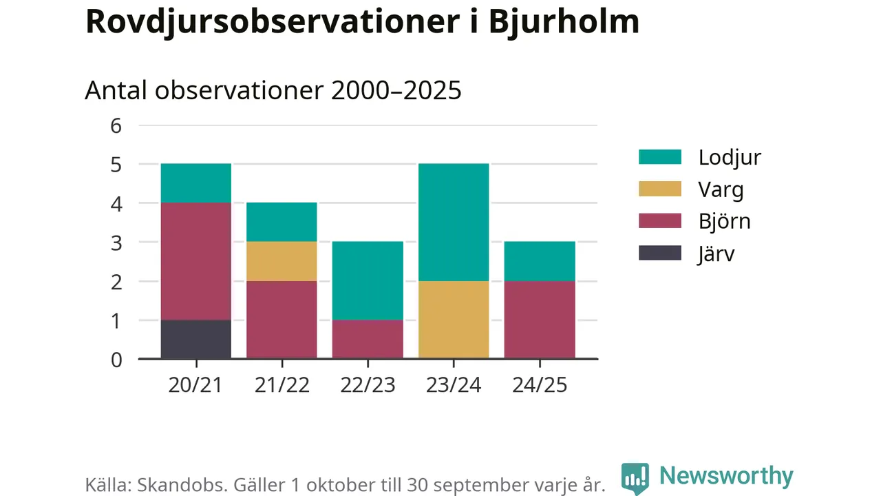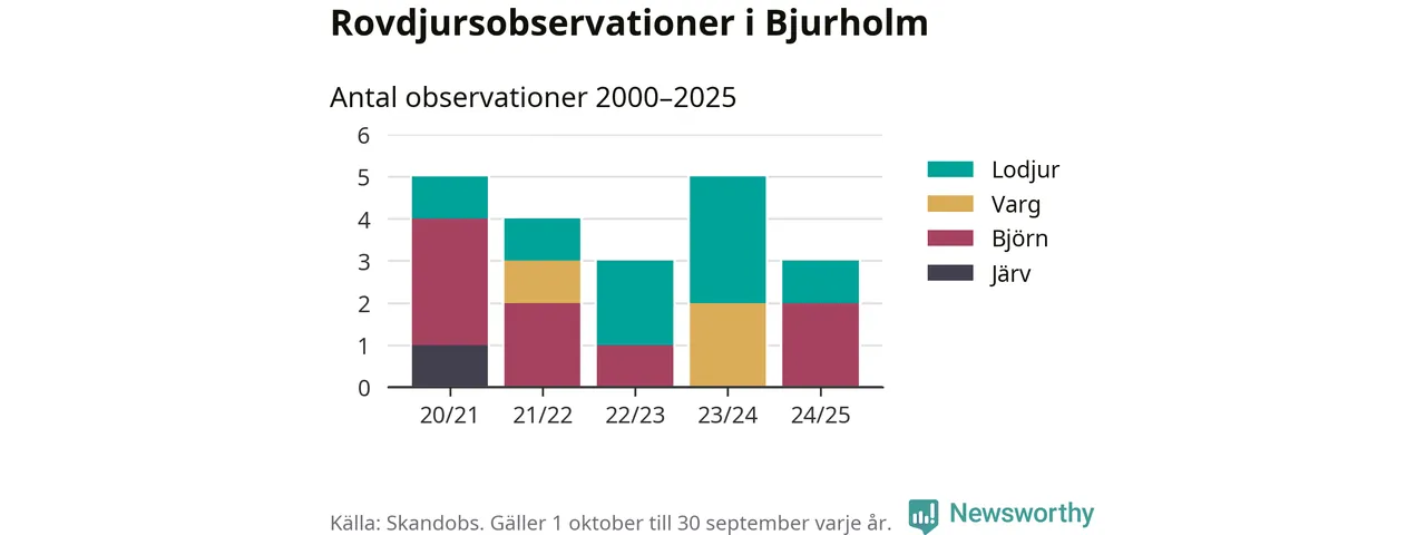 Där kan vem som helst rapportera sina observationer av de stora rovdjuren björn, varg, lodjur och järv. Mellan 1 oktober 2024 och 30 september i år har knappt 10 000 observationer registrerats i landet. Det kan vara synobservationer, foton, spår, spillning, döda bytesdjur eller andra tecken på rovdjursförekomst. I Bjurholm handlar det om totalt tre observationer av björn eller lodjur.