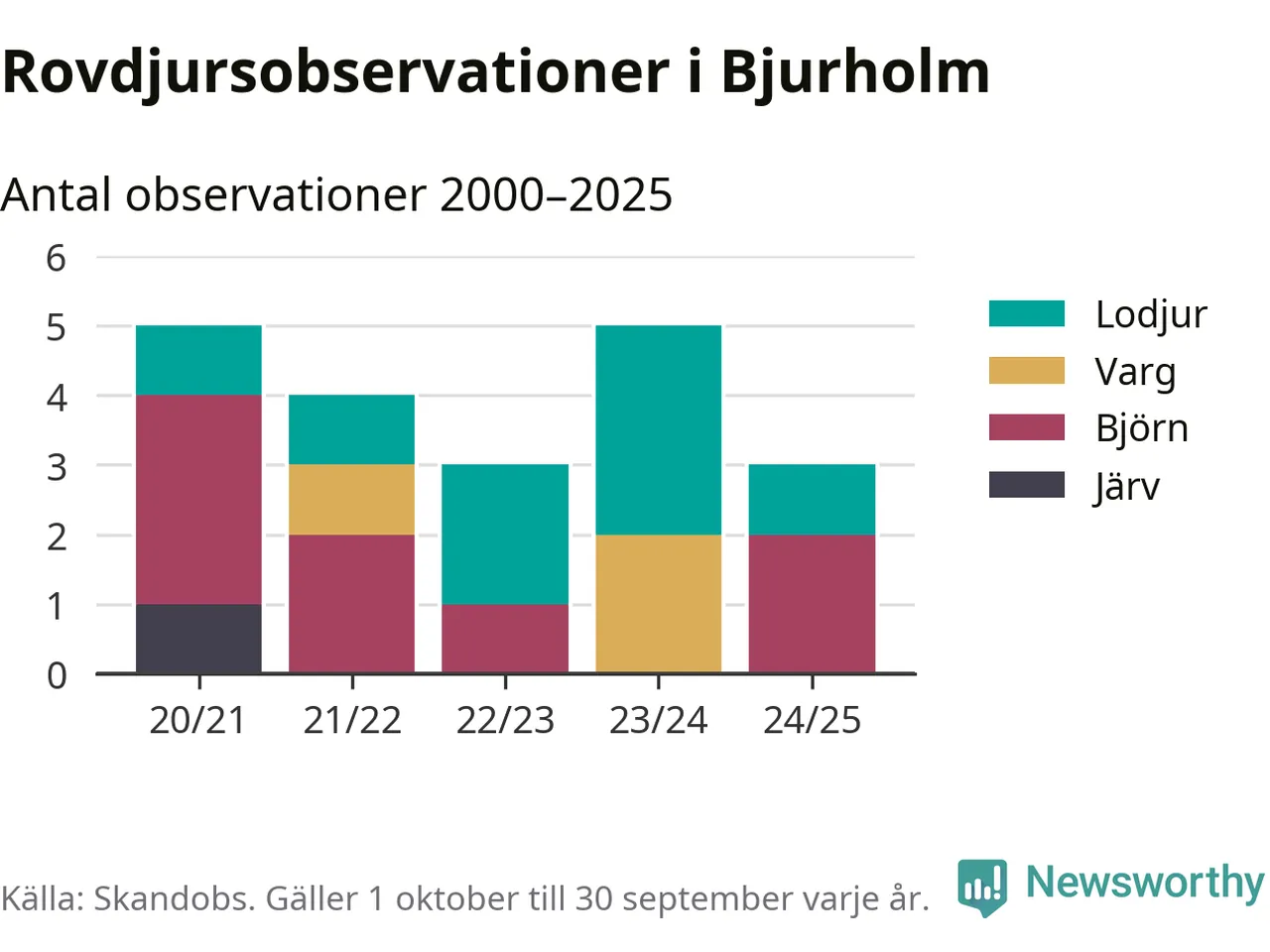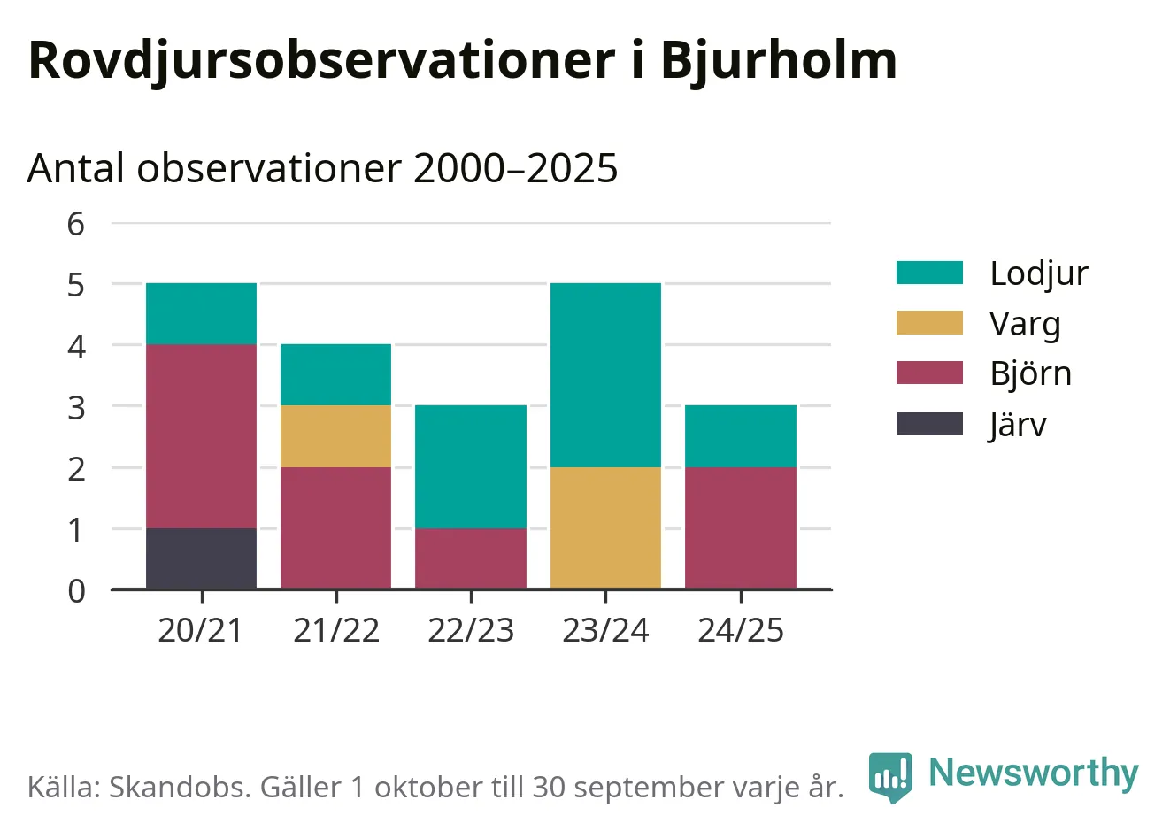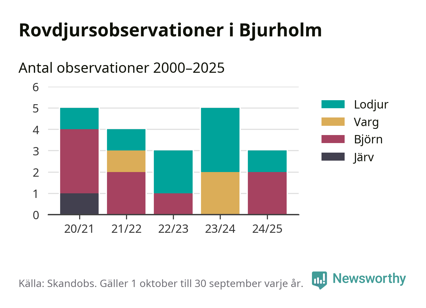 Där kan vem som helst rapportera sina observationer av de stora rovdjuren björn, varg, lodjur och järv. Mellan 1 oktober 2024 och 30 september i år har knappt 10 000 observationer registrerats i landet. Det kan vara synobservationer, foton, spår, spillning, döda bytesdjur eller andra tecken på rovdjursförekomst. I Bjurholm handlar det om totalt tre observationer av björn eller lodjur.