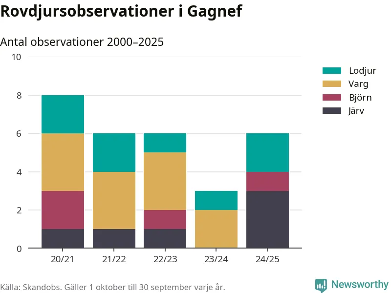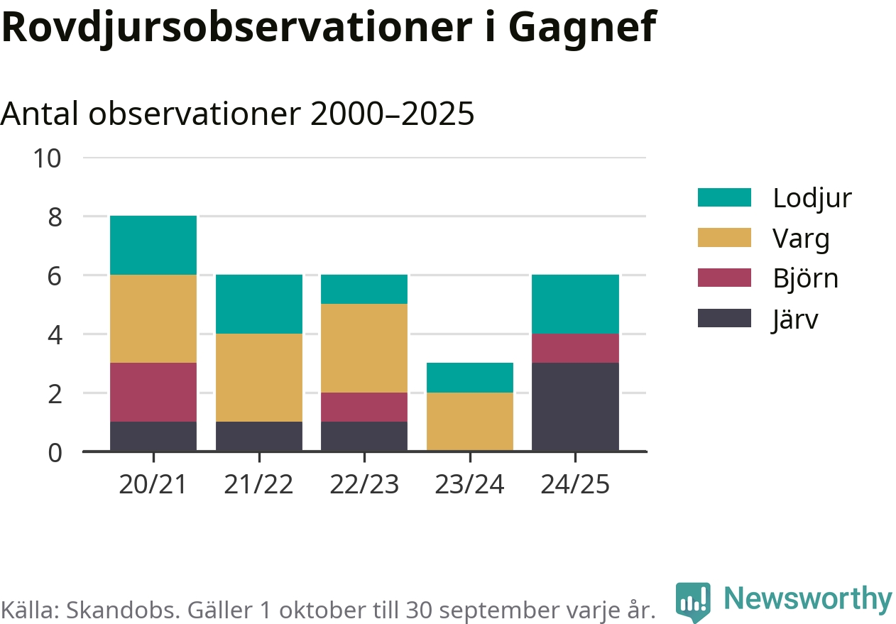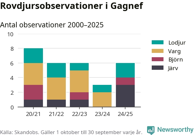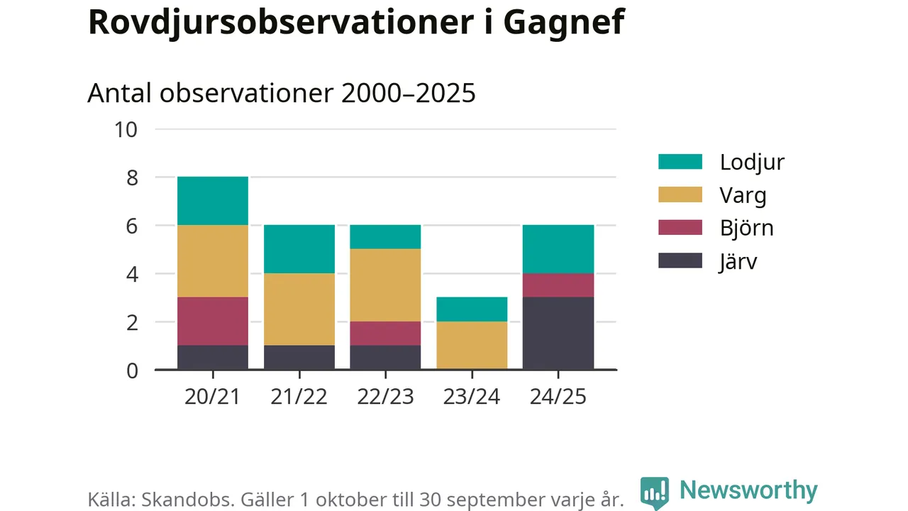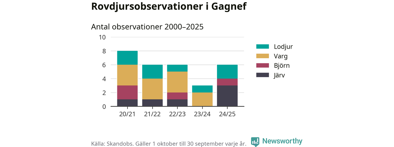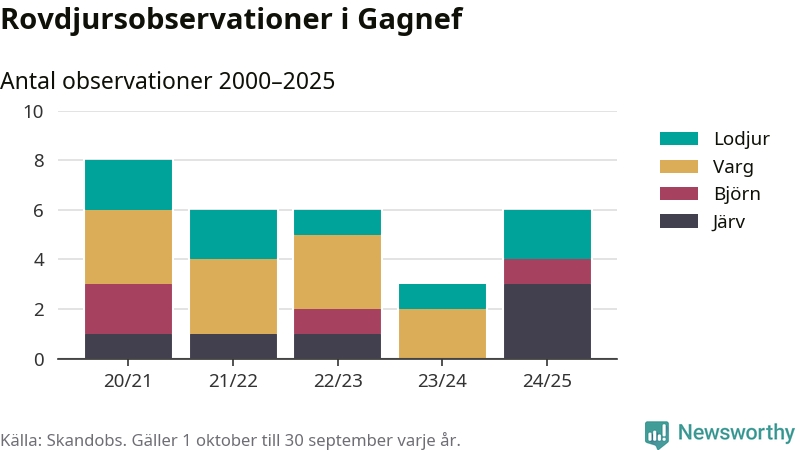 Där kan vem som helst rapportera sina observationer av de stora rovdjuren björn, varg, lodjur och järv. Mellan 1 oktober 2024 och 30 september i år har knappt 10 000 observationer registrerats i landet. Det kan vara synobservationer, foton, spår, spillning, döda bytesdjur eller andra tecken på rovdjursförekomst. I Gagnef handlar det om totalt sex observationer av järv, lodjur eller björn.