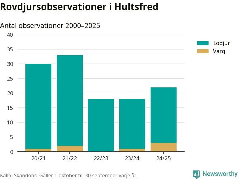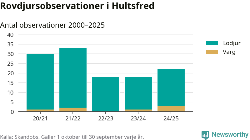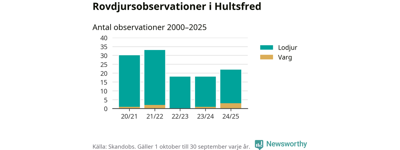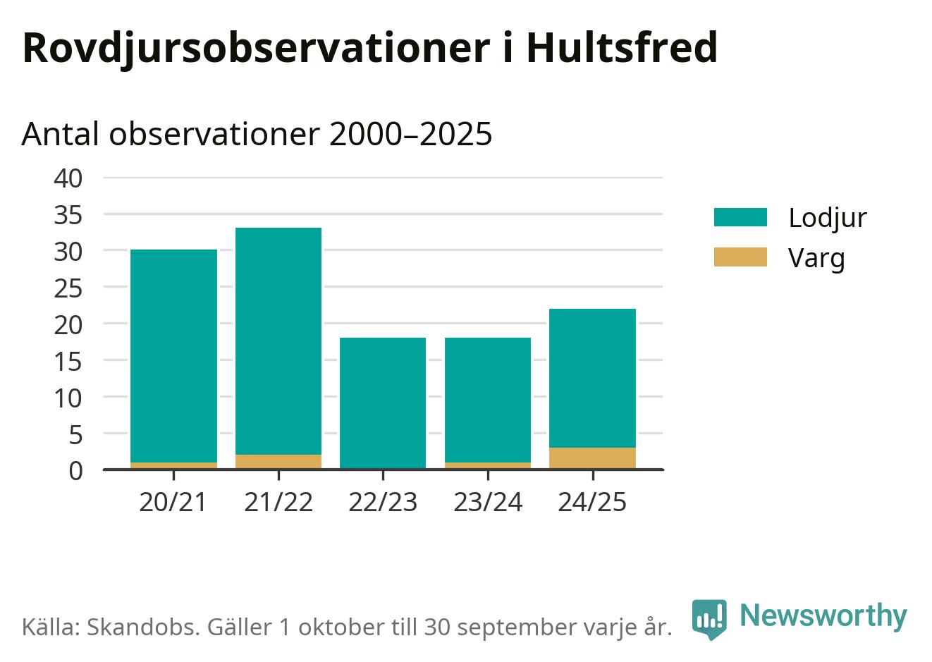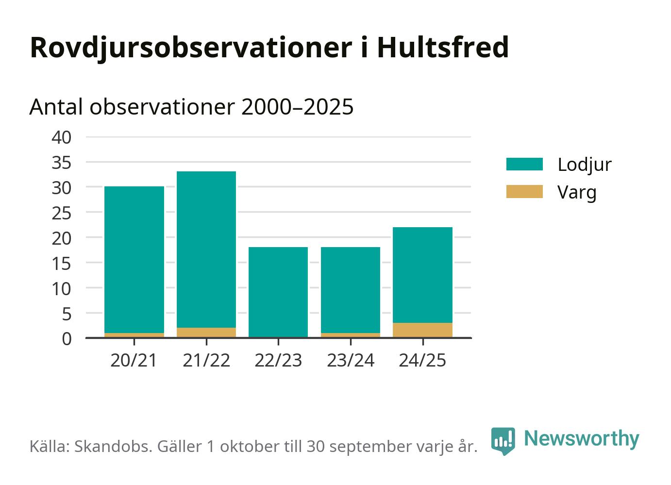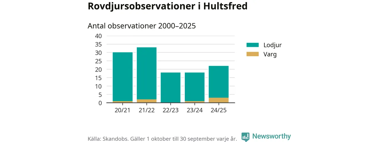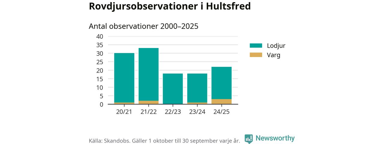 Det rovdjur som oftast rapporterats i Hultsfred det senaste året är lodjur. Det handlar om 19 observationer, varav tolv har bekräftats av länsstyrelsen. Sedan slutet av år 2020 finns även noll rapporter om björn i Hultsfred, men ingen observation har gjorts det senaste året.