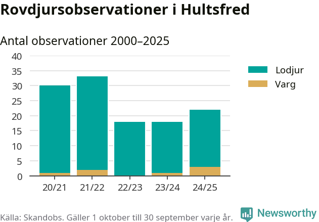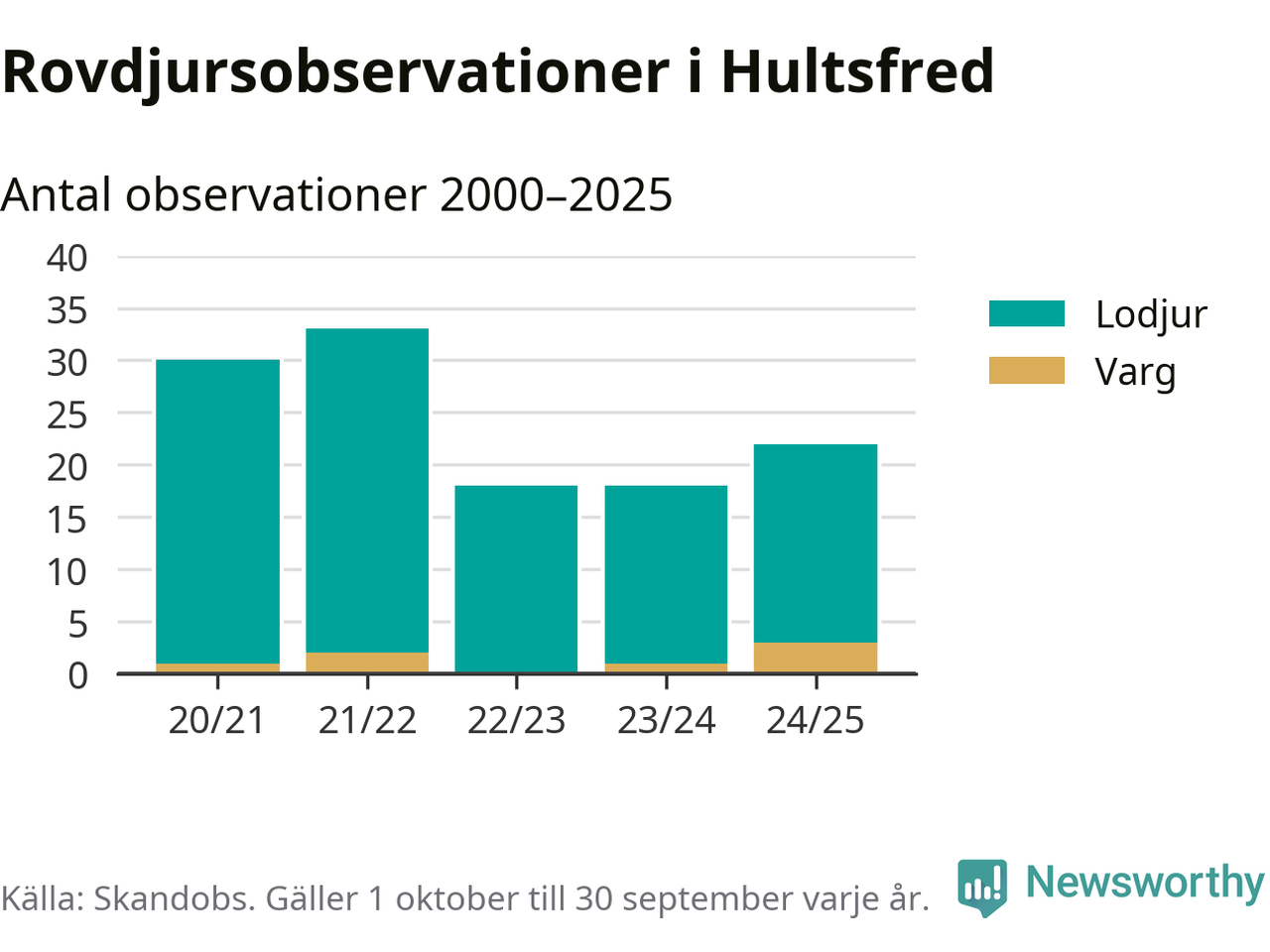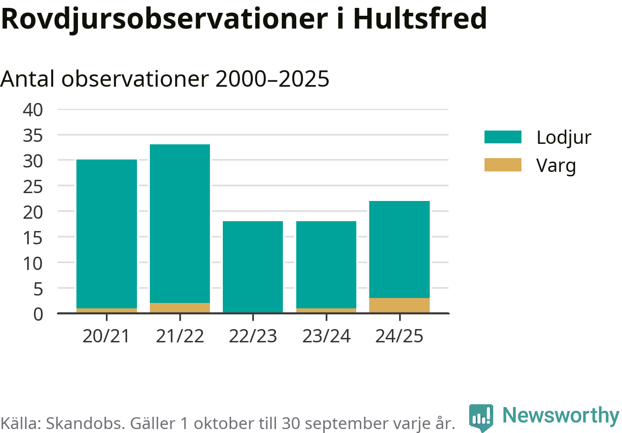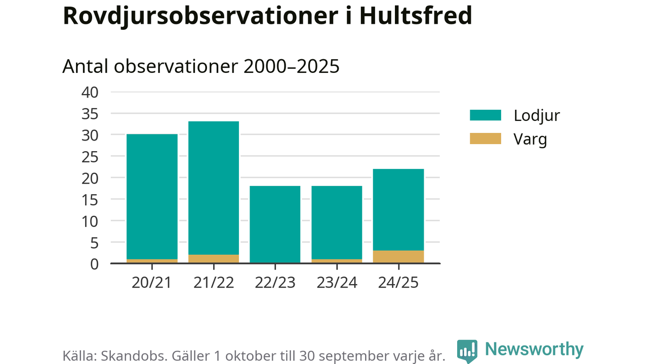 Till Skandobs kan vem som helst rapportera sina observationer av de stora rovdjuren björn, varg, lodjur och järv. Mellan 1 oktober 2024 och 30 september i år har knappt 10 000 observationer registrerats i landet. Det kan vara synobservationer, foton, spår, spillning, döda bytesdjur eller andra tecken på rovdjursförekomst. I Hultsfred handlar det om totalt 22 observationer av lodjur eller varg.