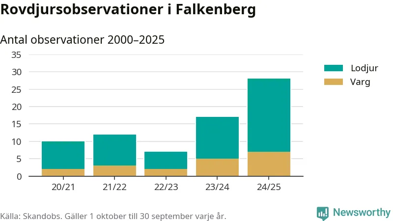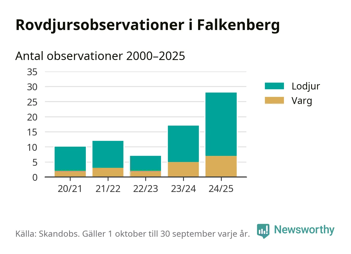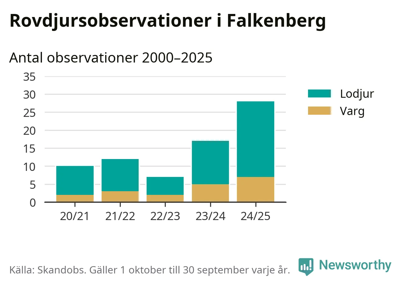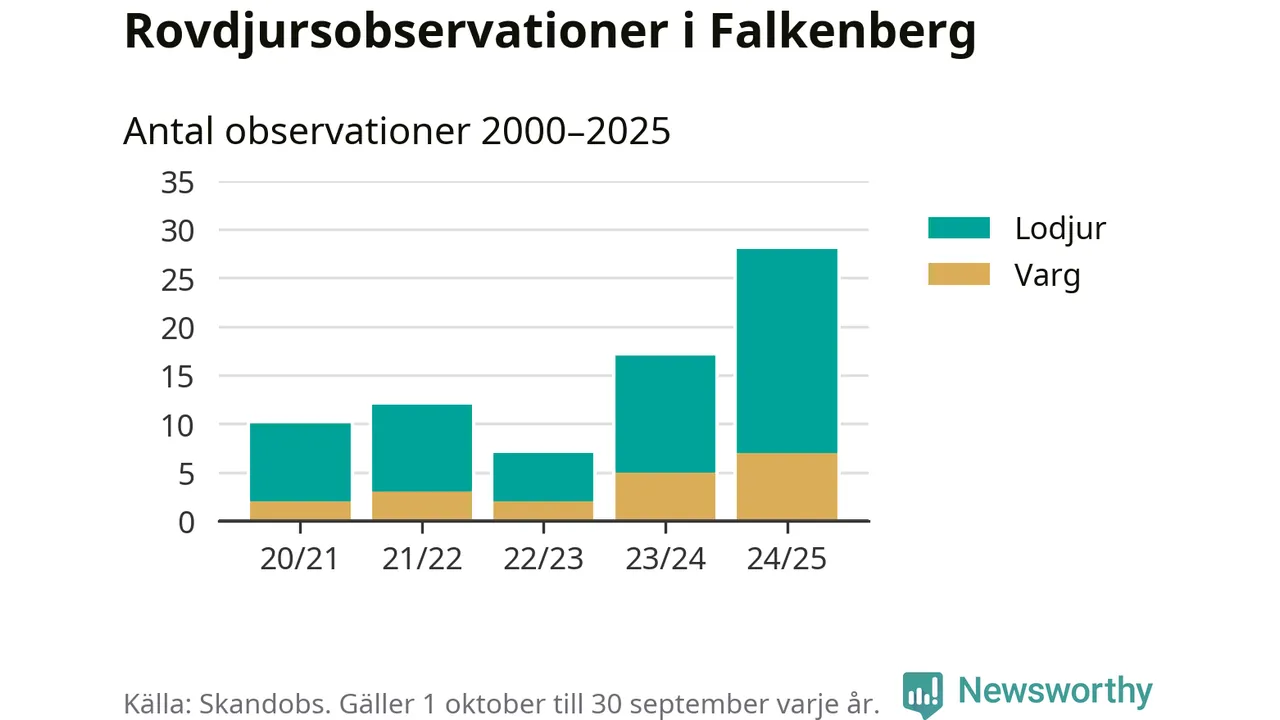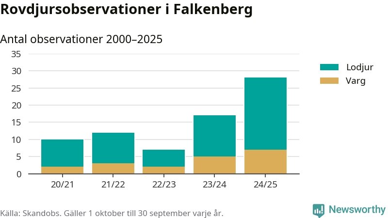 Där kan vem som helst rapportera sina observationer av de stora rovdjuren björn, varg, lodjur och järv. Mellan 1 oktober 2024 och 30 september i år har knappt 10 000 observationer registrerats i landet. Det kan vara synobservationer, foton, spår, spillning, döda bytesdjur eller andra tecken på rovdjursförekomst. I Falkenberg handlar det om totalt 28 observationer av lodjur eller varg.