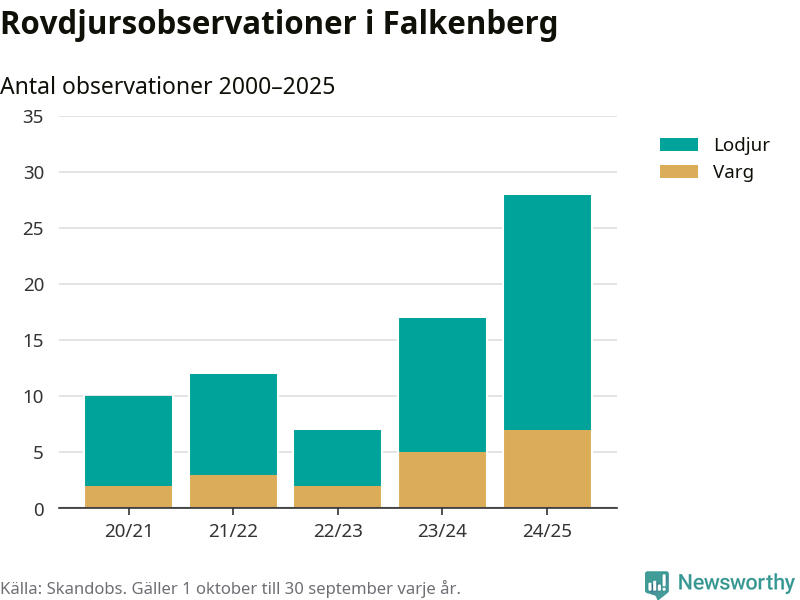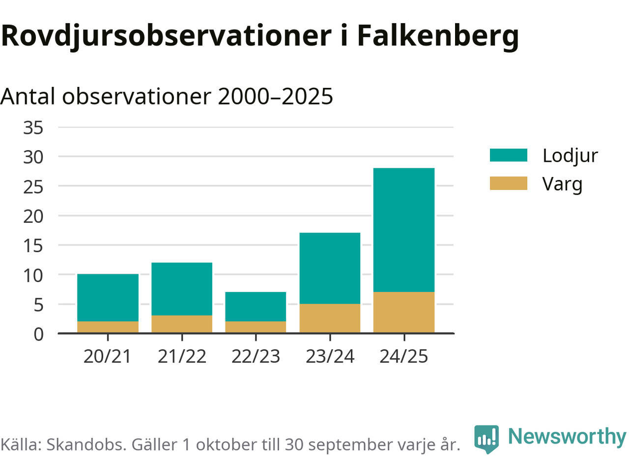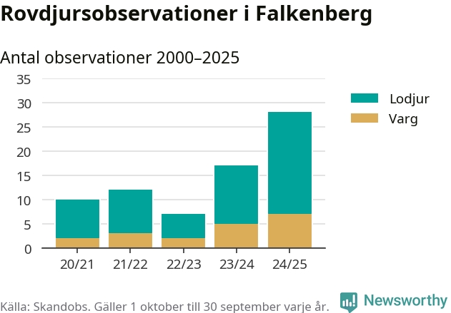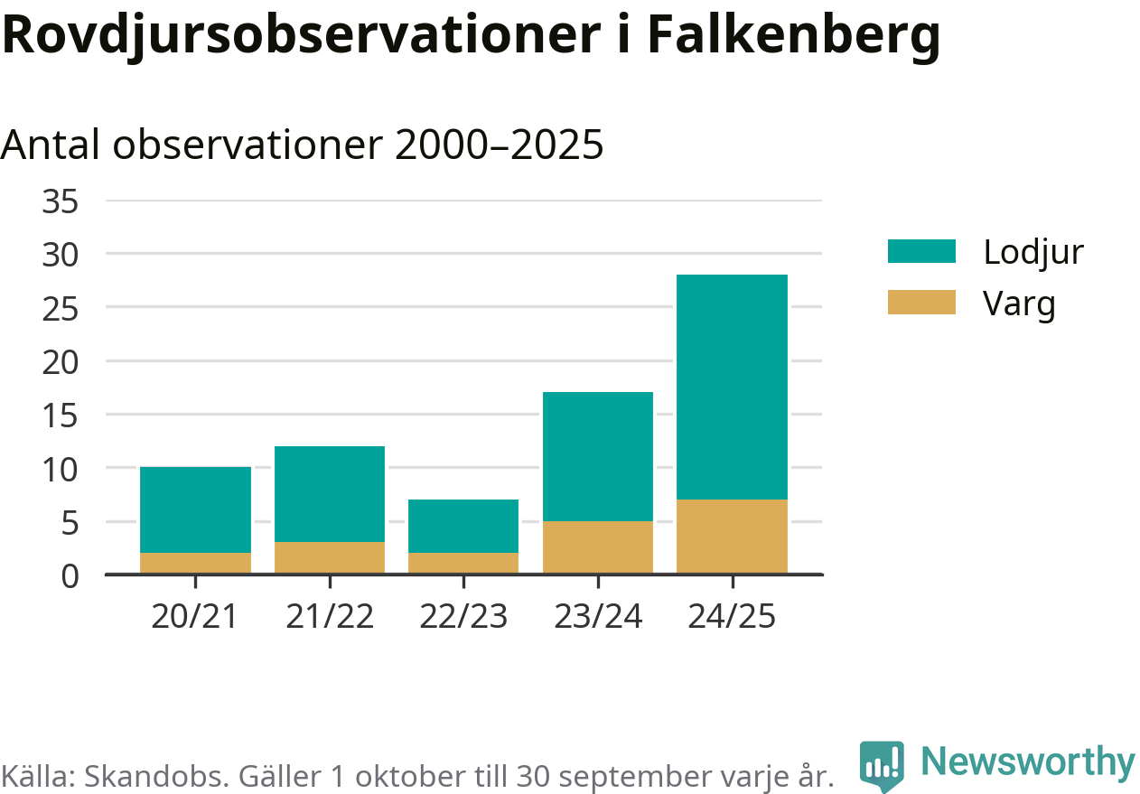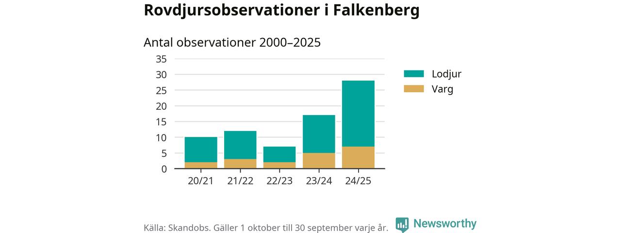 Där kan vem som helst rapportera sina observationer av de stora rovdjuren björn, varg, lodjur och järv. Mellan 1 oktober 2024 och 30 september i år har knappt 10 000 observationer registrerats i landet. Det kan vara synobservationer, foton, spår, spillning, döda bytesdjur eller andra tecken på rovdjursförekomst. I Falkenberg handlar det om totalt 28 observationer av lodjur eller varg.