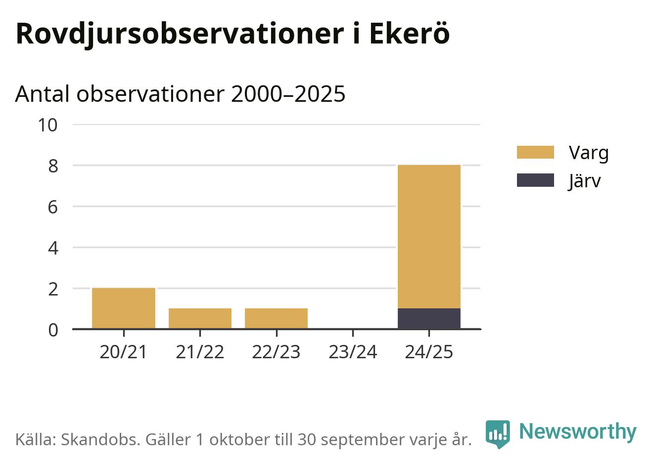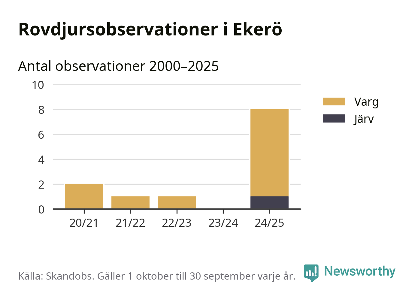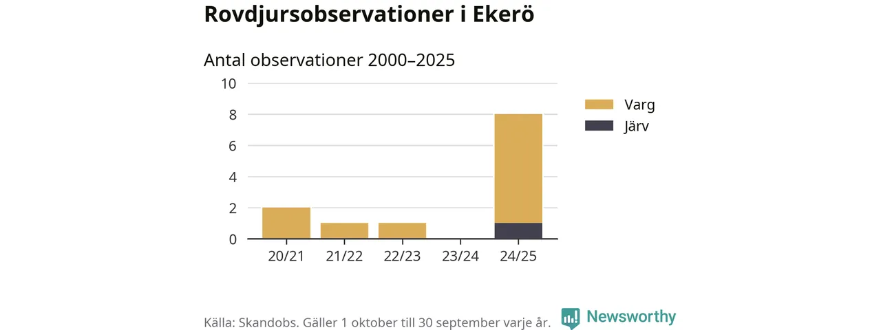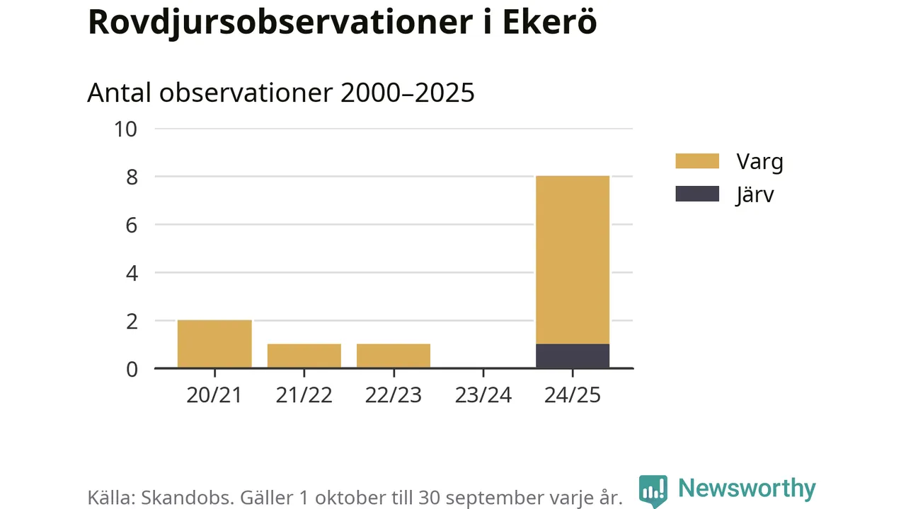 Där kan vem som helst rapportera sina observationer av de stora rovdjuren björn, varg, lodjur och järv. Mellan 1 oktober 2024 och 30 september i år har knappt 10 000 observationer registrerats i landet. Det kan vara synobservationer, foton, spår, spillning, döda bytesdjur eller andra tecken på rovdjursförekomst. I Ekerö handlar det om totalt åtta observationer av varg eller järv.