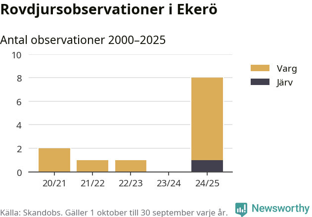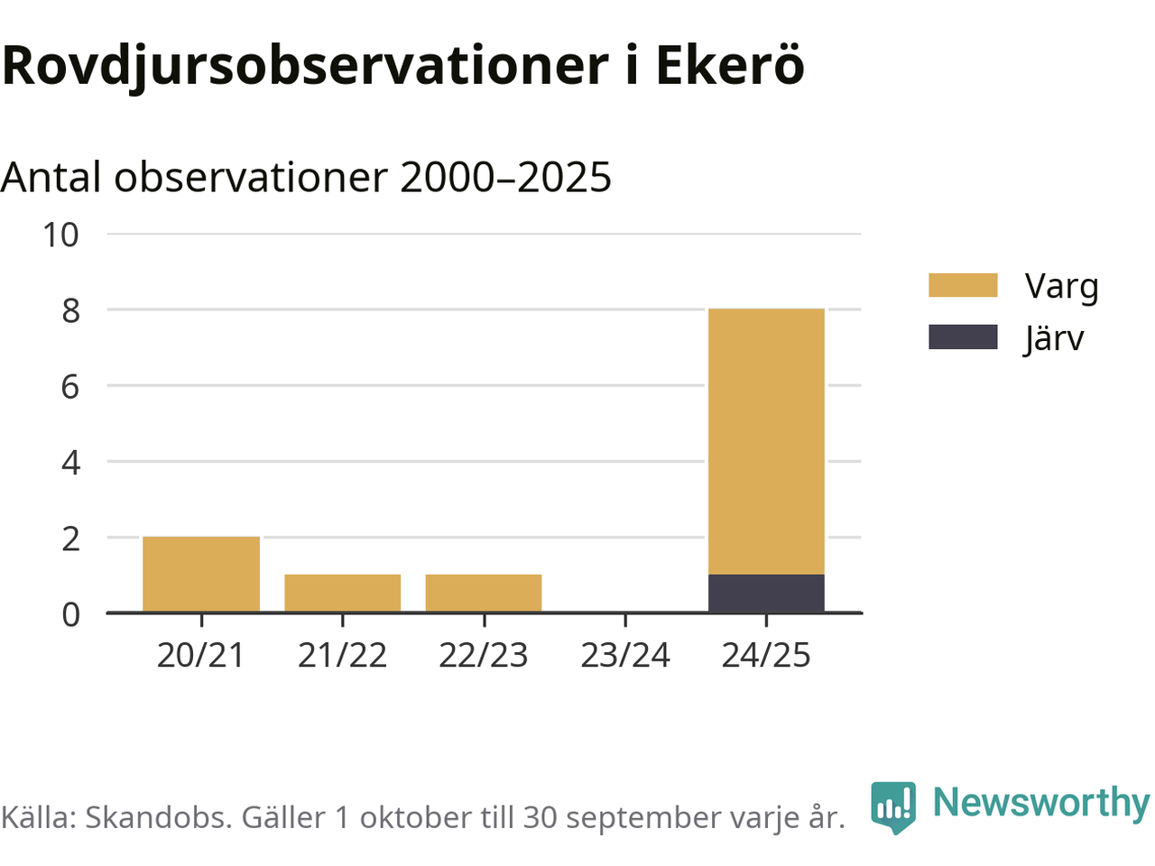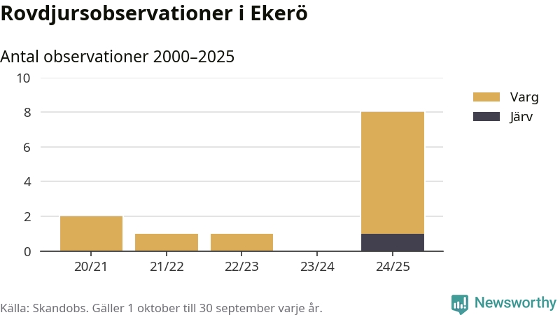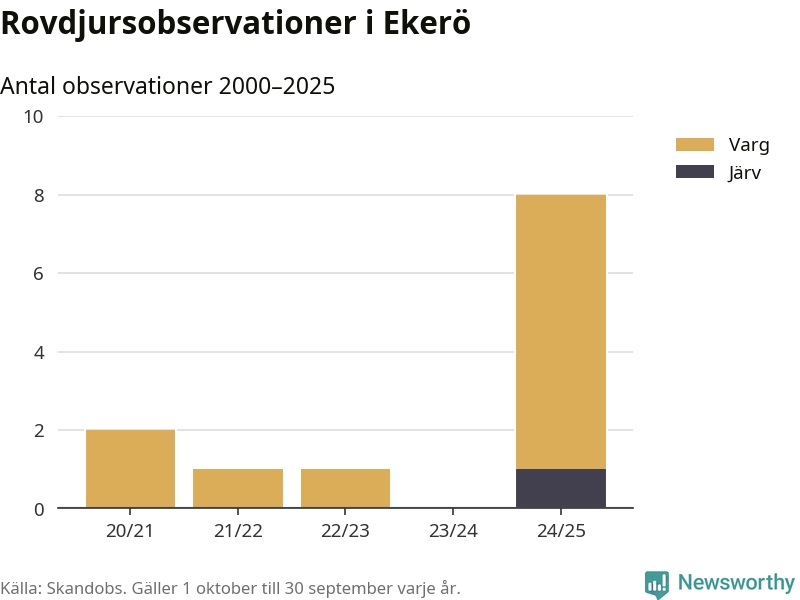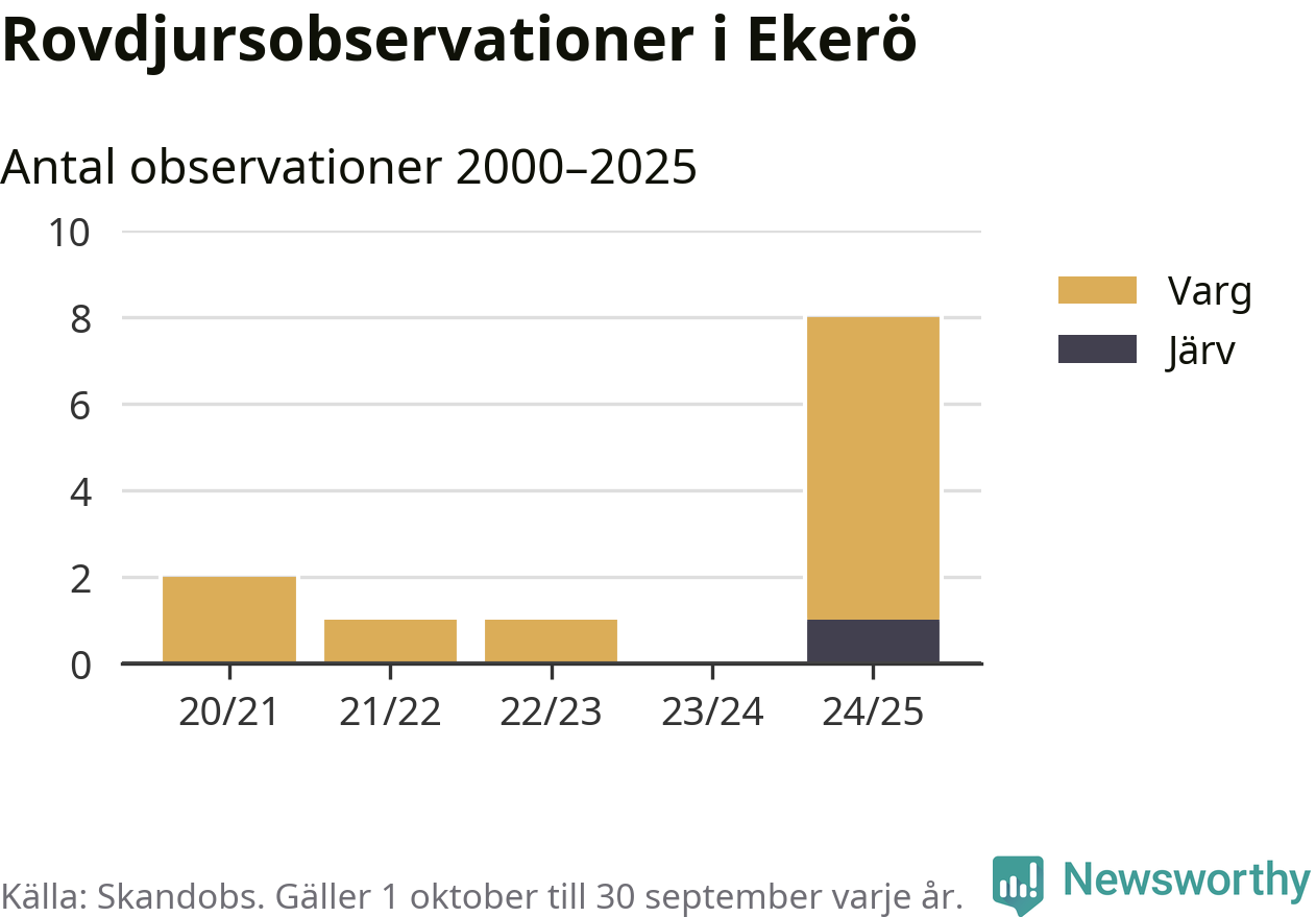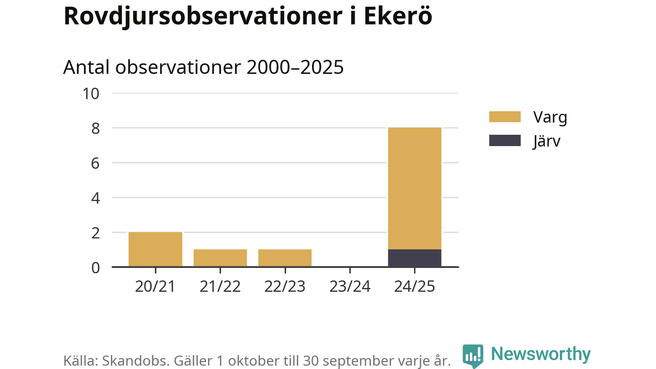 Där kan vem som helst rapportera sina observationer av de stora rovdjuren björn, varg, lodjur och järv. Mellan 1 oktober 2024 och 30 september i år har knappt 10 000 observationer registrerats i landet. Det kan vara synobservationer, foton, spår, spillning, döda bytesdjur eller andra tecken på rovdjursförekomst. I Ekerö handlar det om totalt åtta observationer av varg eller järv.