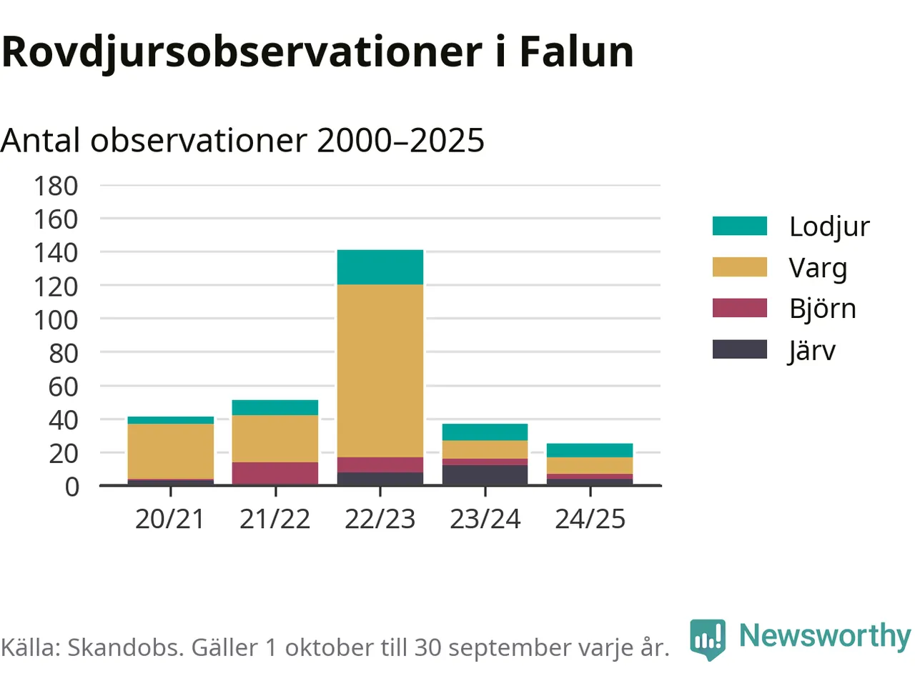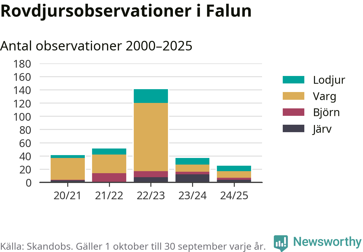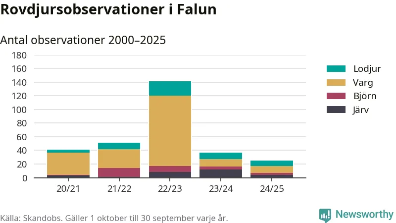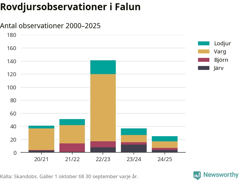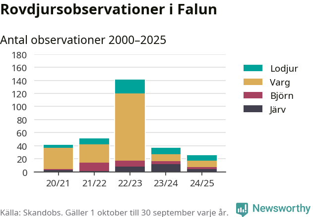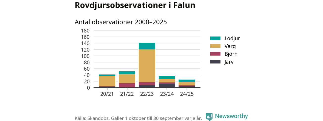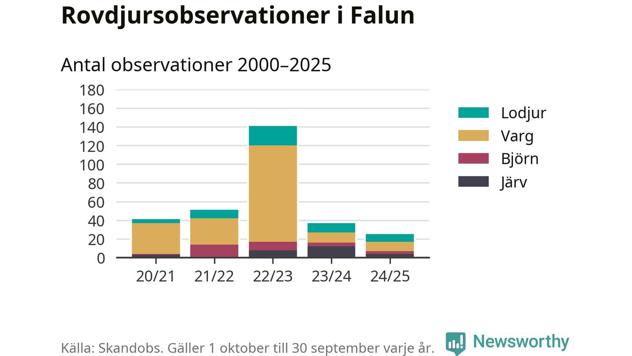 Där kan vem som helst rapportera sina observationer av de stora rovdjuren björn, varg, lodjur och järv. Mellan 1 oktober 2024 och 30 september i år har knappt 10 000 observationer registrerats i landet. Det kan vara synobservationer, foton, spår, spillning, döda bytesdjur eller andra tecken på rovdjursförekomst. I Falun finns totalt 25 rapporter, om alla fyra rovdjur.