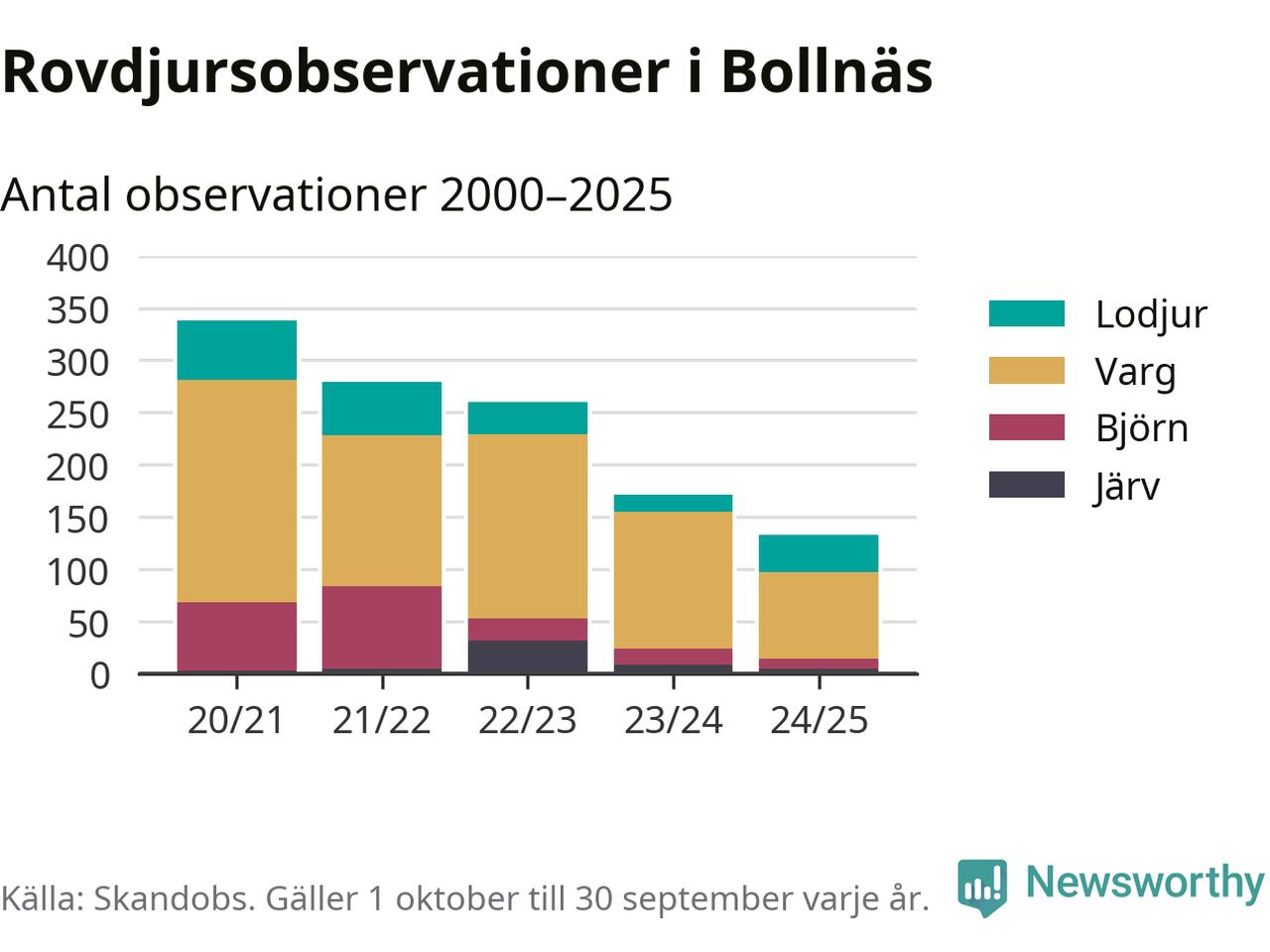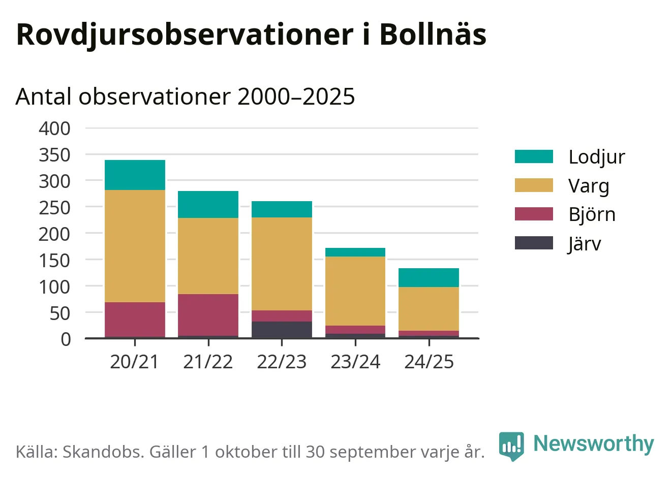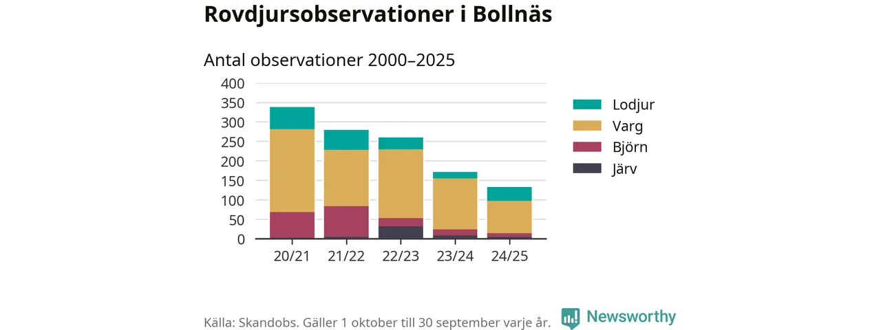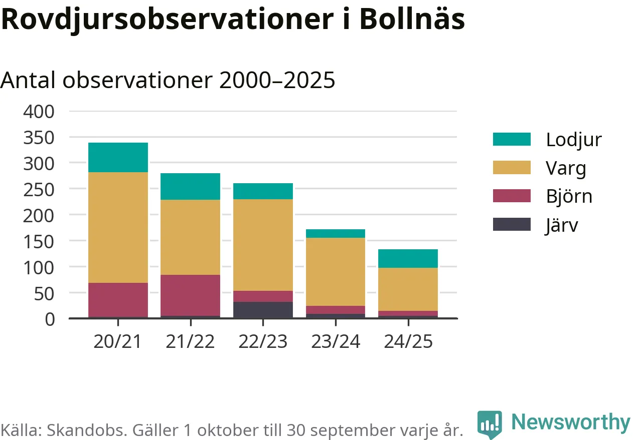 Där kan vem som helst rapportera sina observationer av de stora rovdjuren björn, varg, lodjur och järv. Mellan 1 oktober 2024 och 30 september i år har knappt 10 000 observationer registrerats i landet. Det kan vara synobservationer, foton, spår, spillning, döda bytesdjur eller andra tecken på rovdjursförekomst. I Bollnäs finns totalt 133 rapporter, om alla fyra rovdjur.