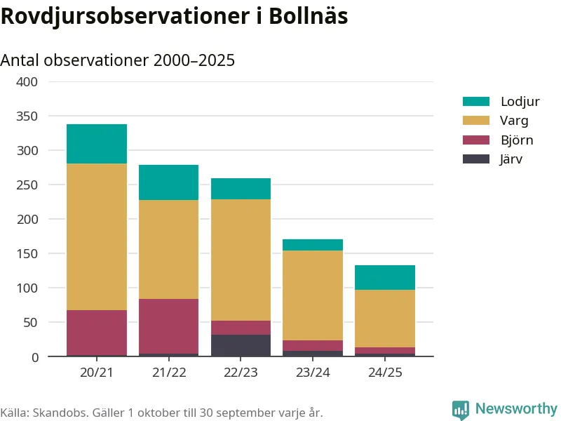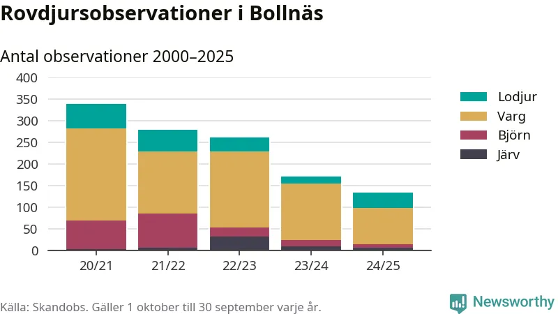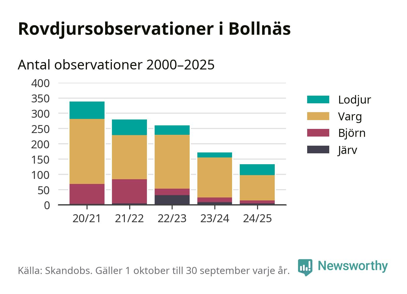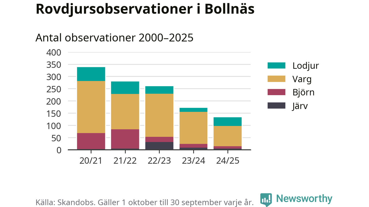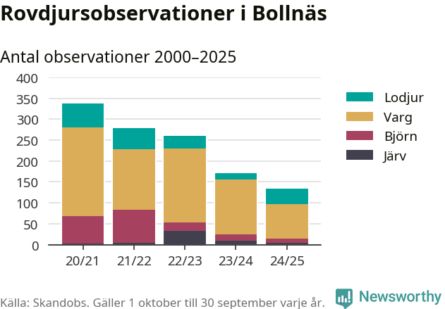 Där kan vem som helst rapportera sina observationer av de stora rovdjuren björn, varg, lodjur och järv. Mellan 1 oktober 2024 och 30 september i år har knappt 10 000 observationer registrerats i landet. Det kan vara synobservationer, foton, spår, spillning, döda bytesdjur eller andra tecken på rovdjursförekomst. I Bollnäs finns totalt 133 rapporter, om alla fyra rovdjur.