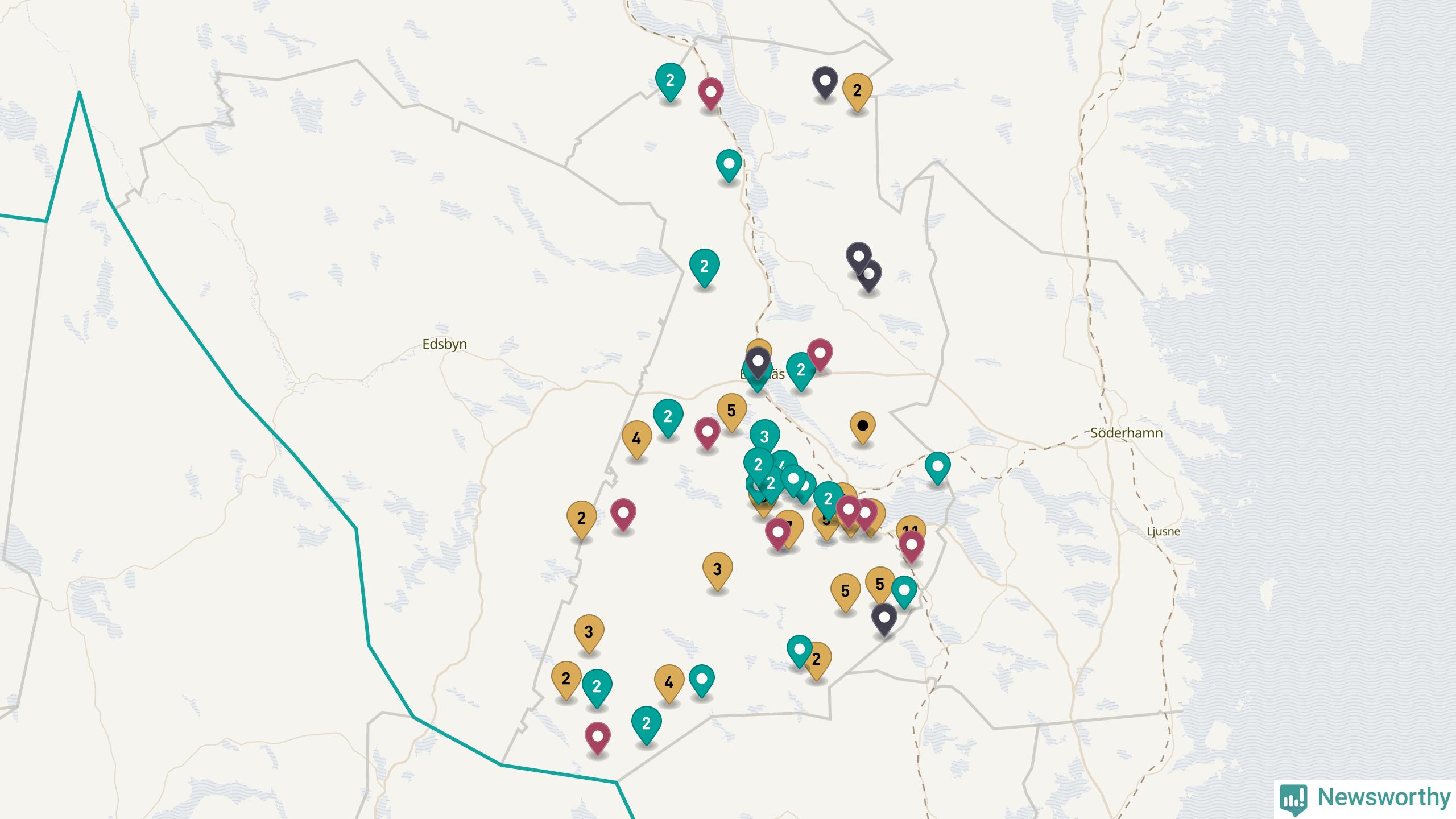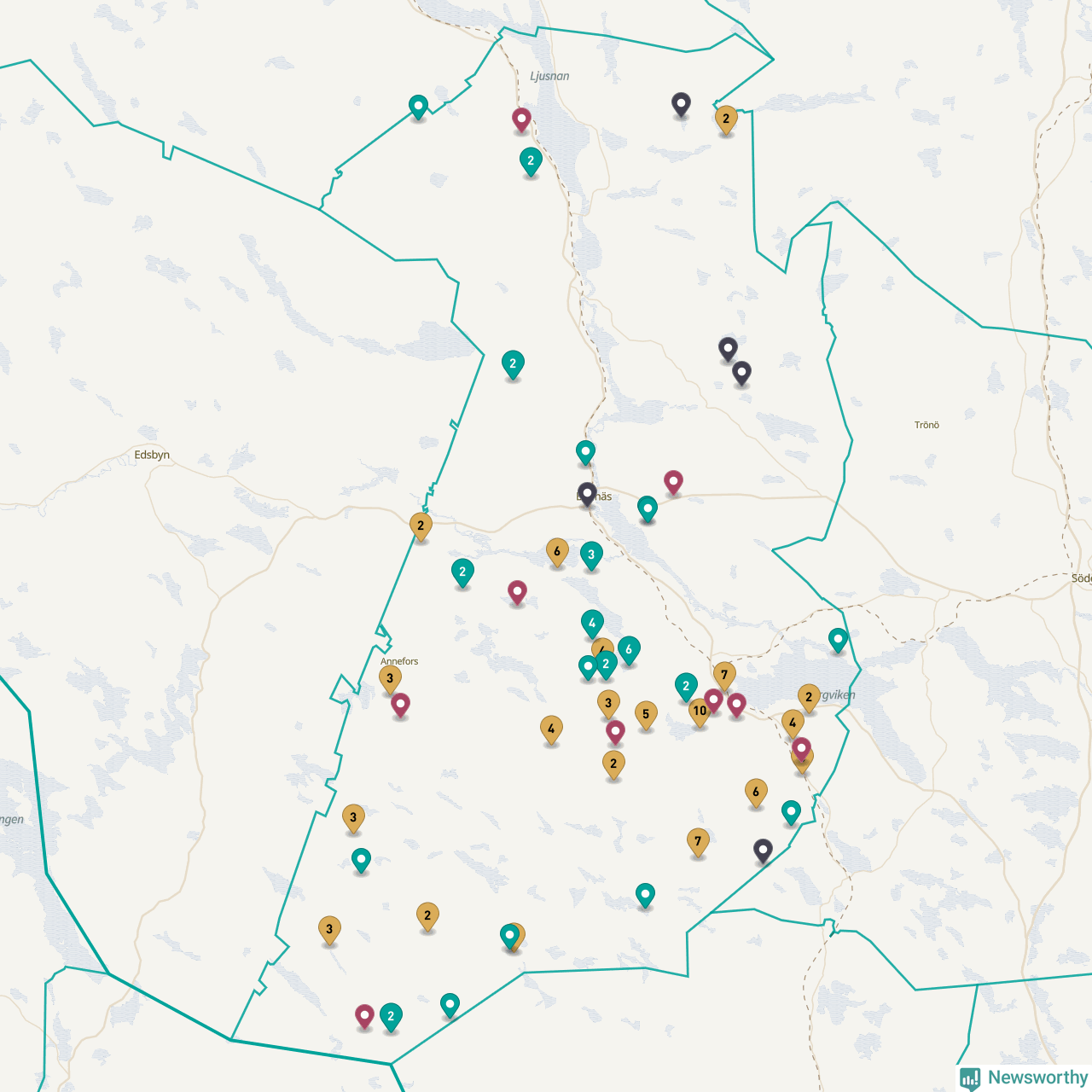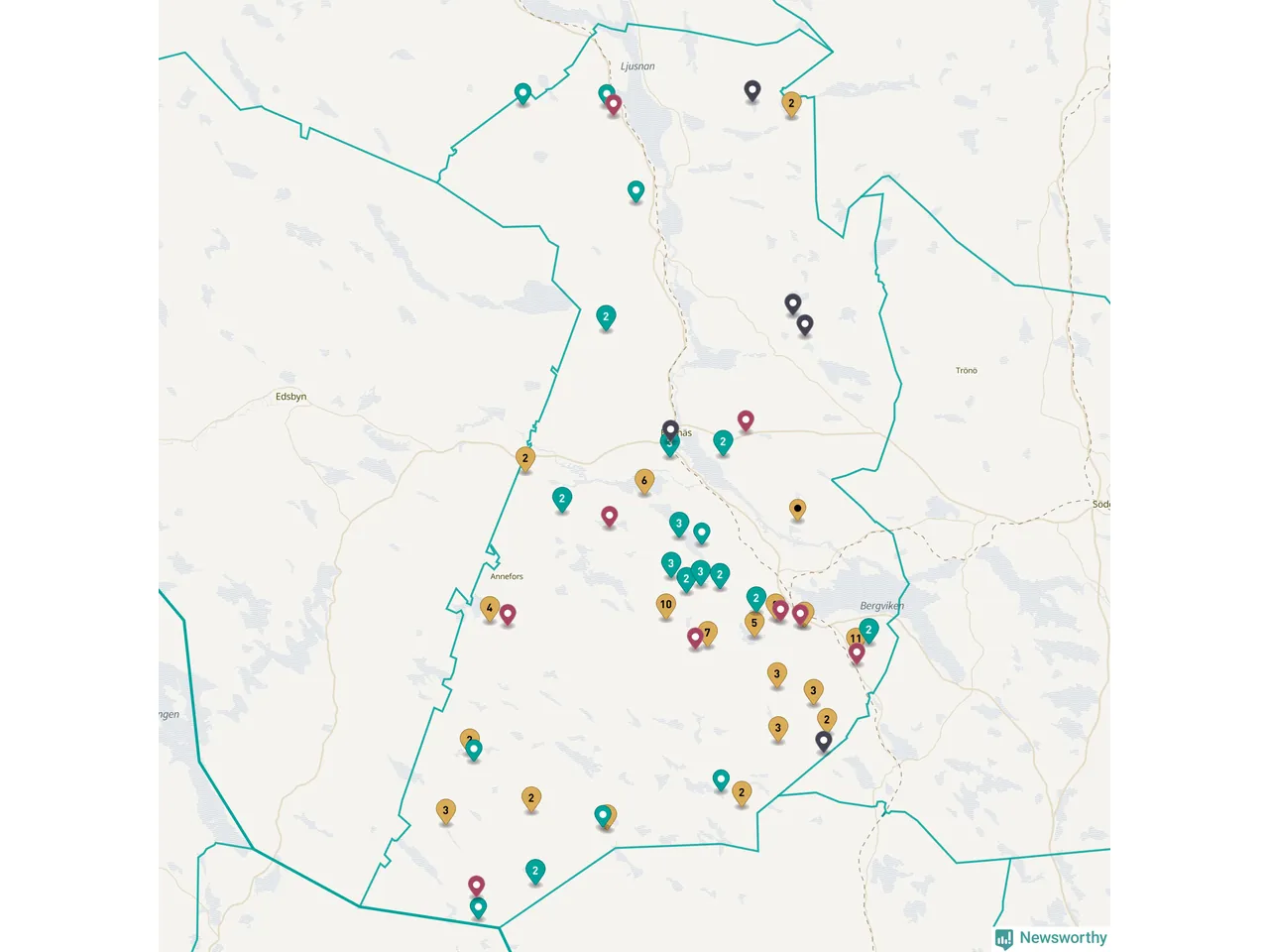 | Bollnäs | 36 (+20) | 83 (−48) | 9 (−6) | 5 (−4) |