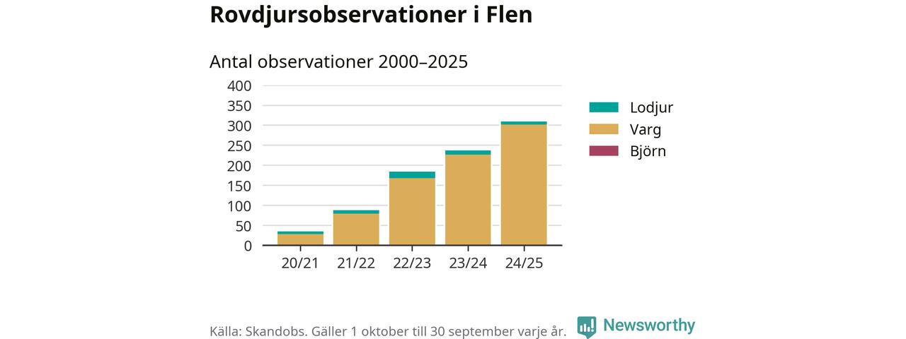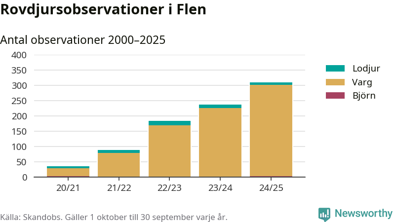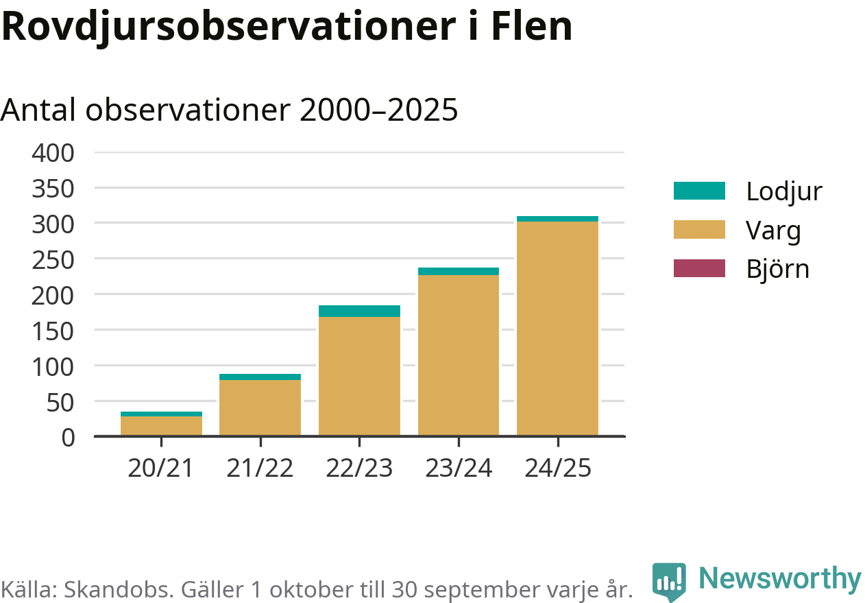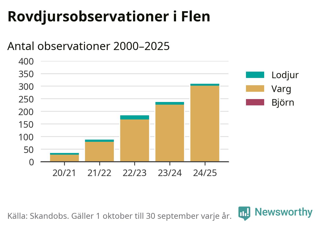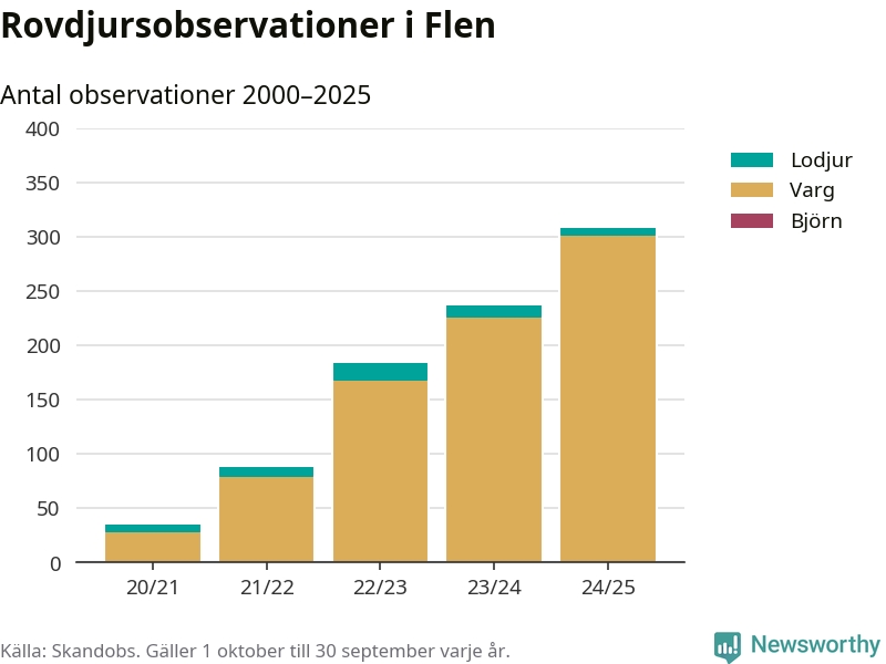 Där kan vem som helst rapportera sina observationer av de stora rovdjuren björn, varg, lodjur och järv. Mellan 1 oktober 2024 och 30 september i år har knappt 10 000 observationer registrerats i landet. Det kan vara synobservationer, foton, spår, spillning, döda bytesdjur eller andra tecken på rovdjursförekomst. I Flen handlar det om totalt 309 observationer av varg, lodjur eller björn.