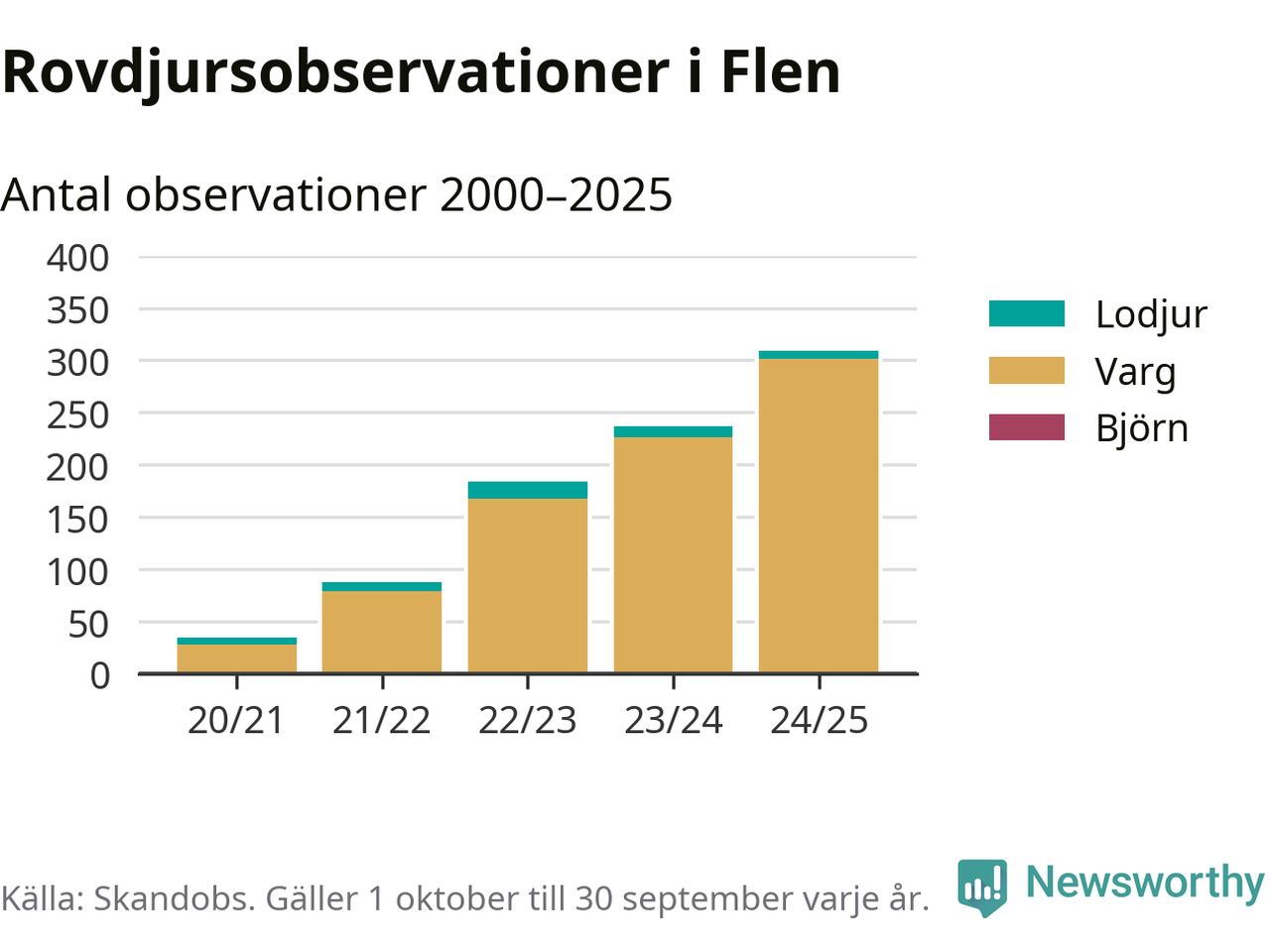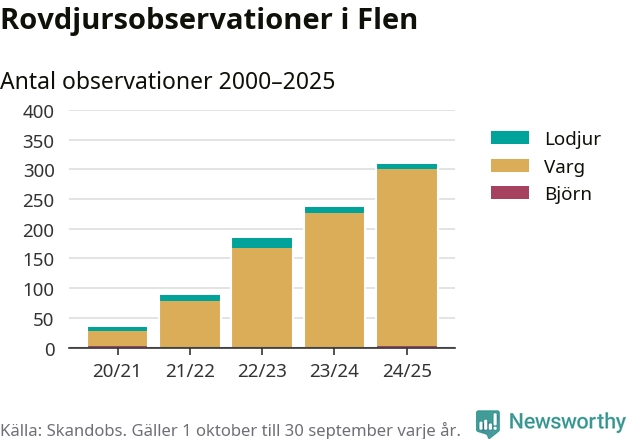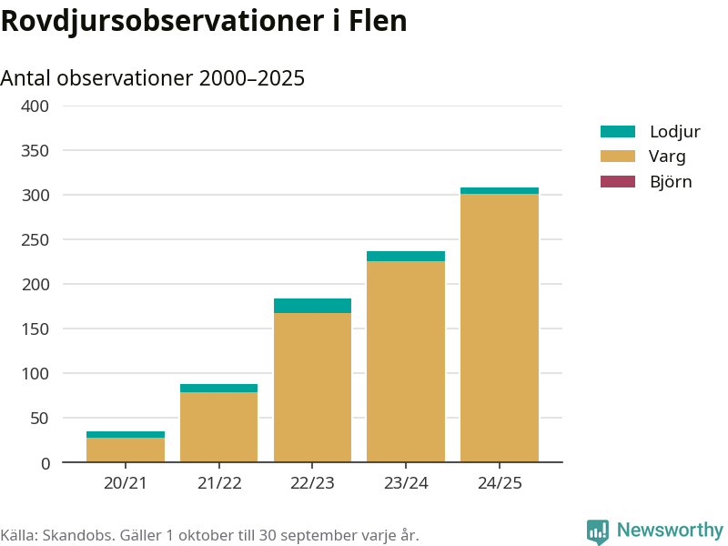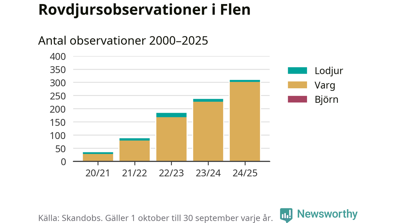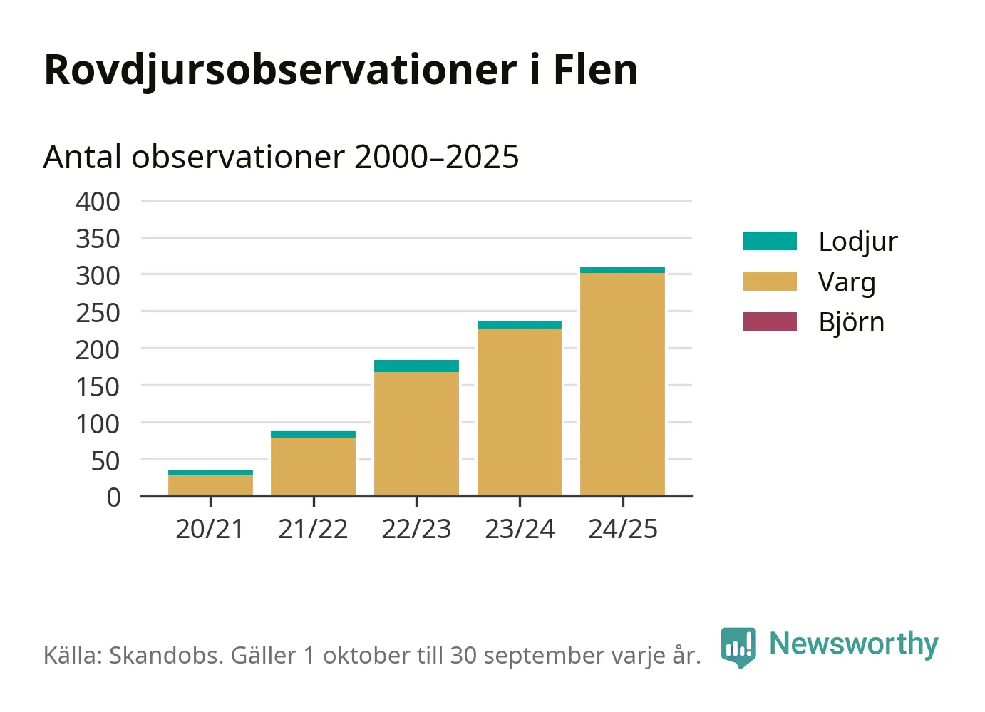 Där kan vem som helst rapportera sina observationer av de stora rovdjuren björn, varg, lodjur och järv. Mellan 1 oktober 2024 och 30 september i år har knappt 10 000 observationer registrerats i landet. Det kan vara synobservationer, foton, spår, spillning, döda bytesdjur eller andra tecken på rovdjursförekomst. I Flen handlar det om totalt 309 observationer av varg, lodjur eller björn.