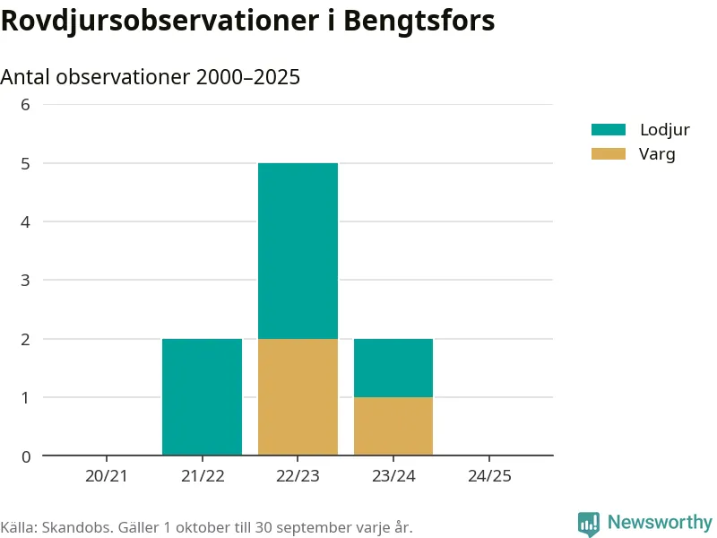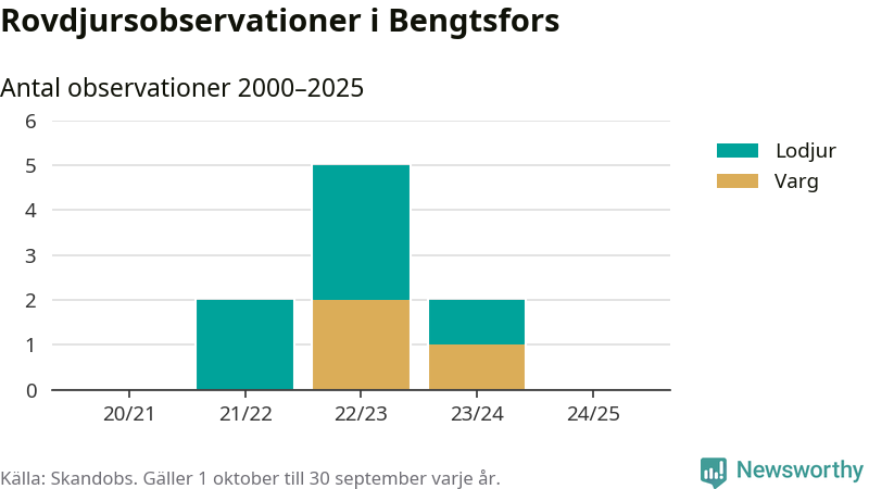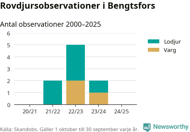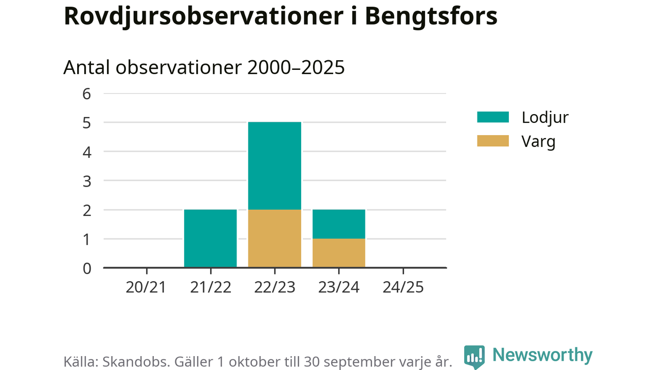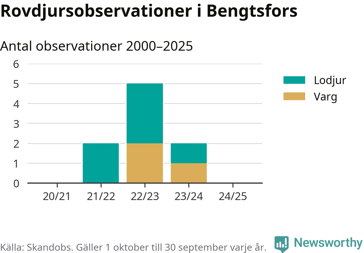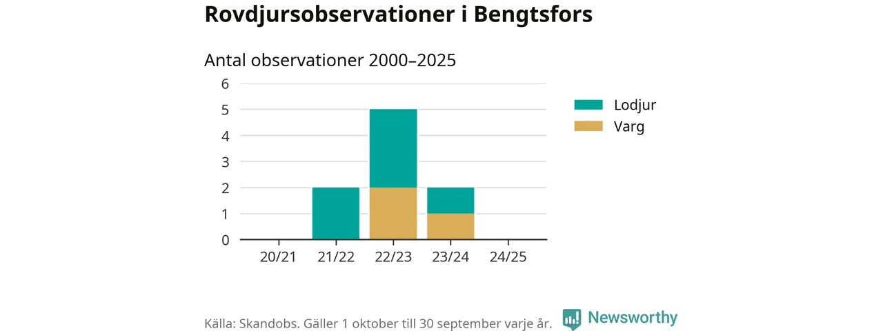 Under det senaste året har inga observationer av rovdjur i Bengtsfors rapporterats till Skandobs, men sedan slutet av 2020 finns sex lodjursobservationer och tre vargobservationer.