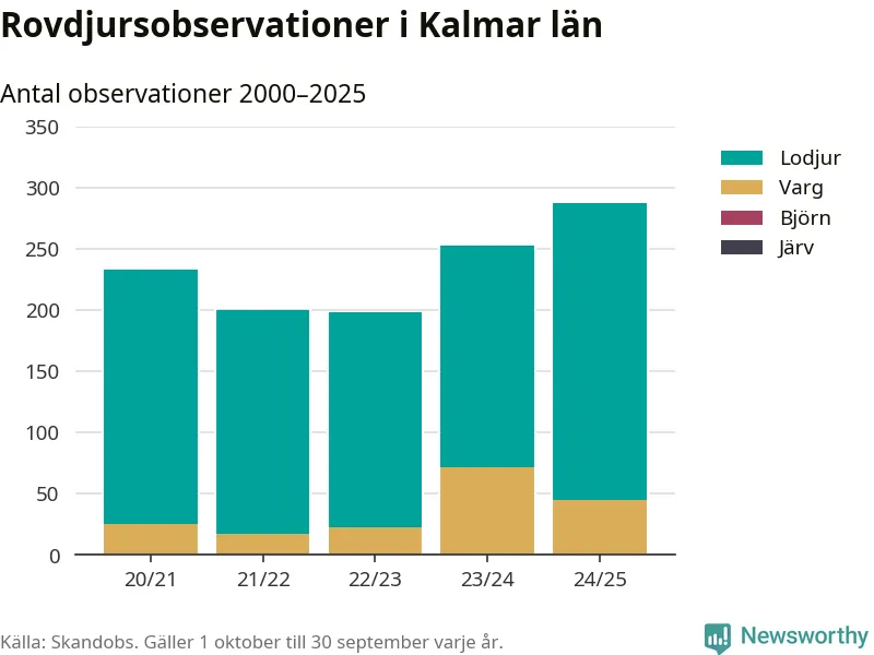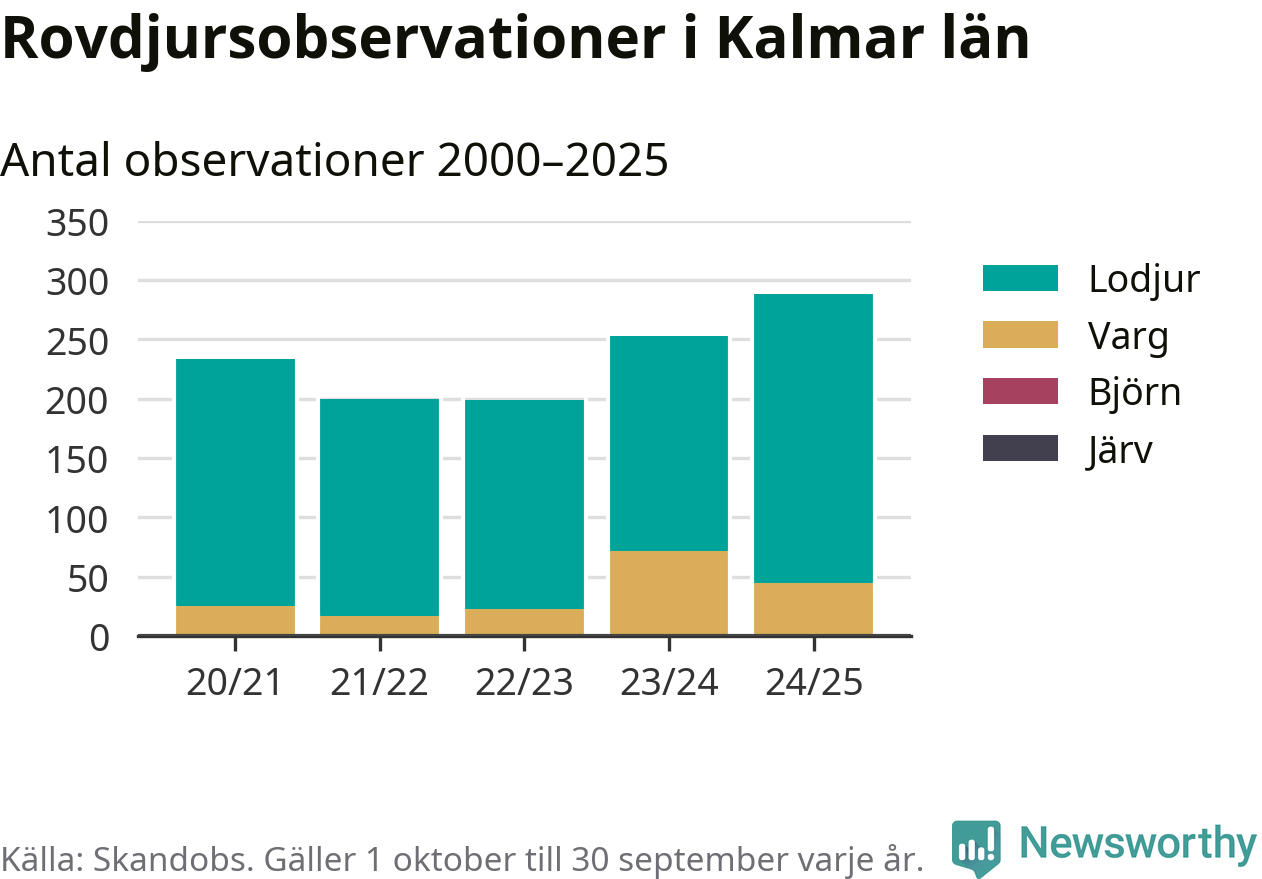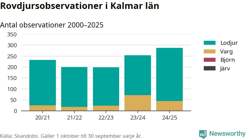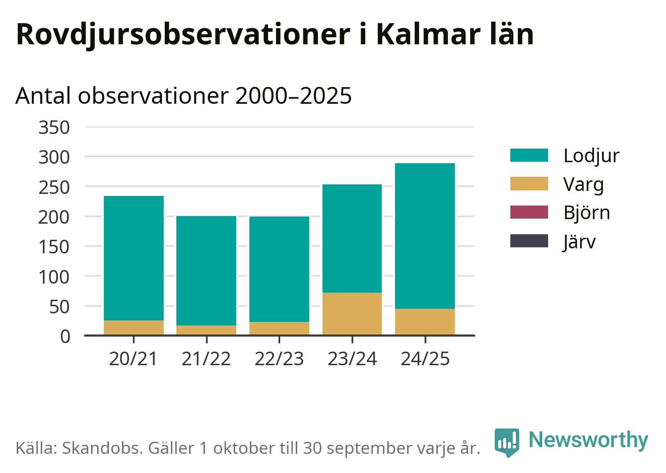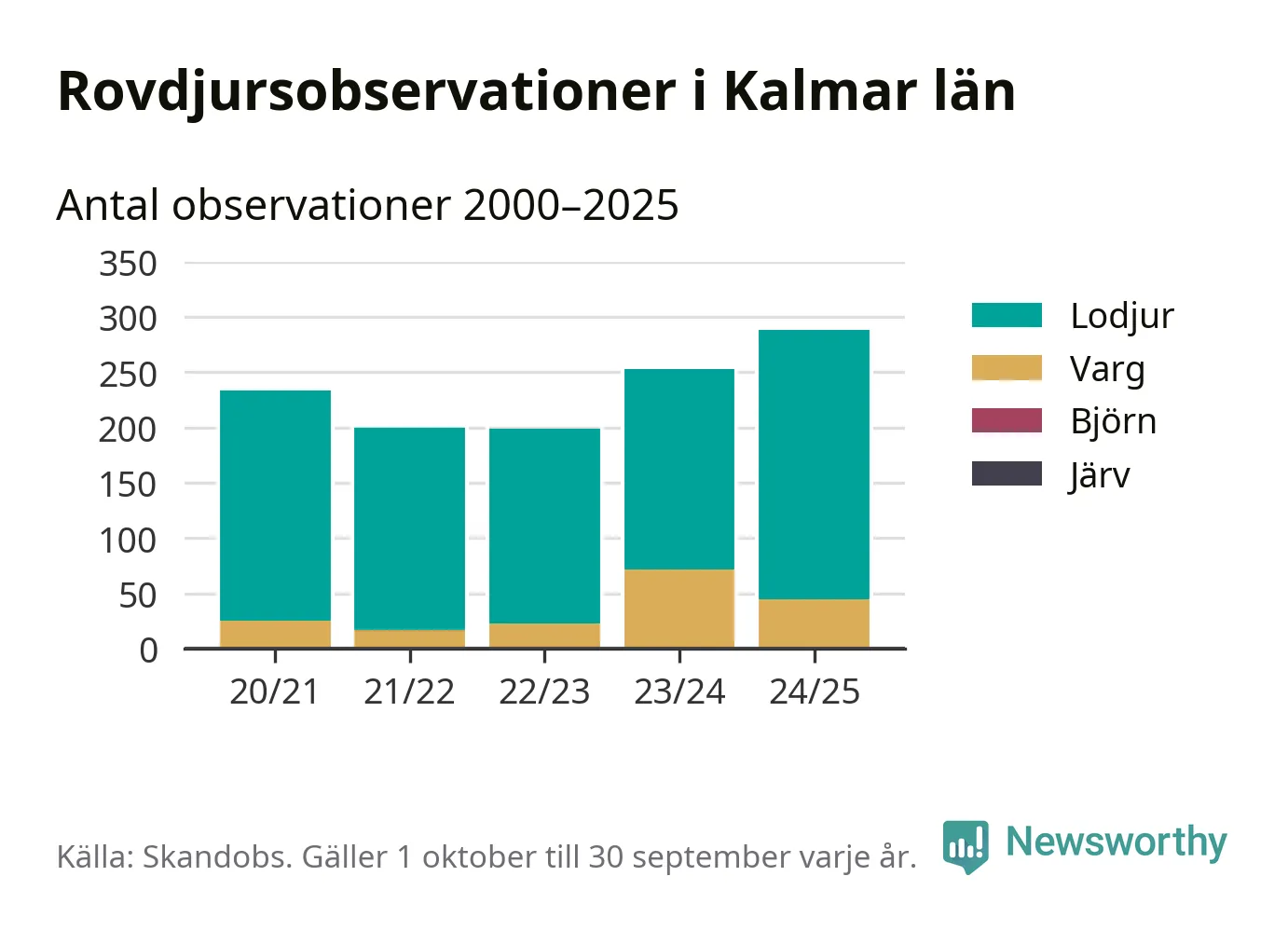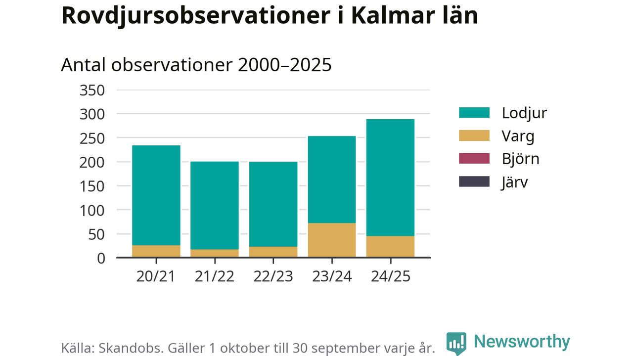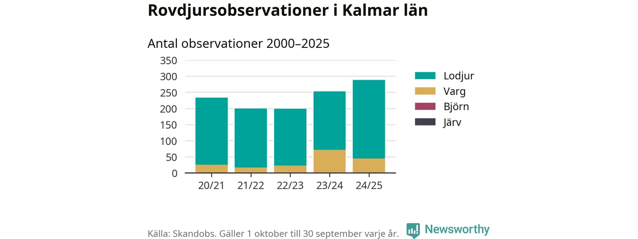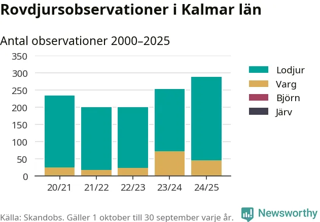 Där kan vem som helst rapportera sina observationer av de stora rovdjuren björn, varg, lodjur och järv. Mellan 1 oktober 2024 och 30 september i år har knappt 10 000 observationer registrerats i landet. Det kan vara synobservationer, foton, spår, spillning, döda bytesdjur eller andra tecken på rovdjursförekomst. I Kalmar län handlar det om totalt 288 observationer av lodjur, varg eller järv.