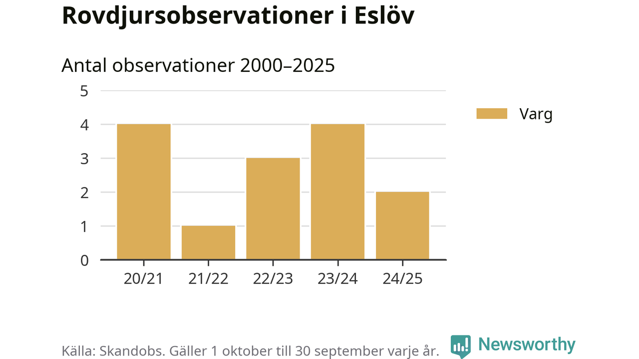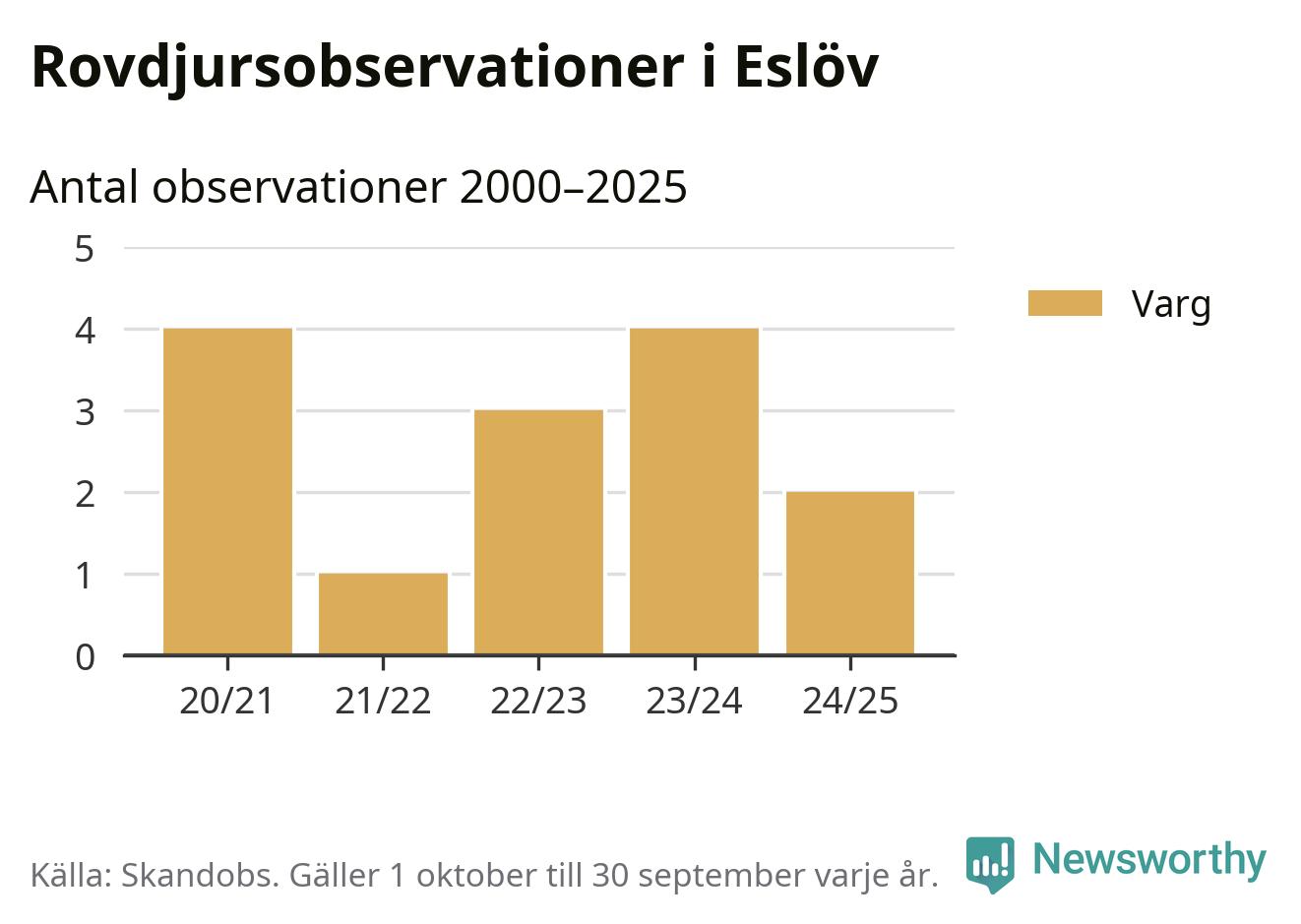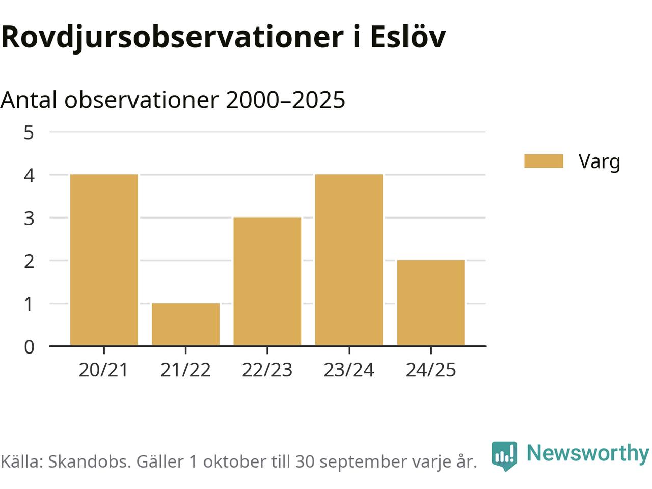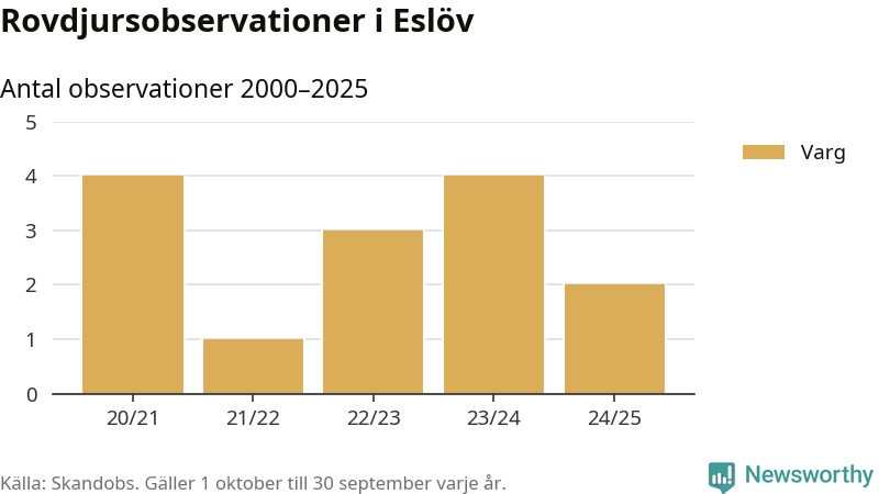 Där kan vem som helst rapportera sina observationer av de stora rovdjuren björn, varg, lodjur och järv. Mellan 1 oktober 2024 och 30 september i år har knappt 10 000 observationer registrerats i landet. Det kan vara synobservationer, foton, spår, spillning, döda bytesdjur eller andra tecken på rovdjursförekomst. I Eslöv handlar det om totalt två observationer av varg.