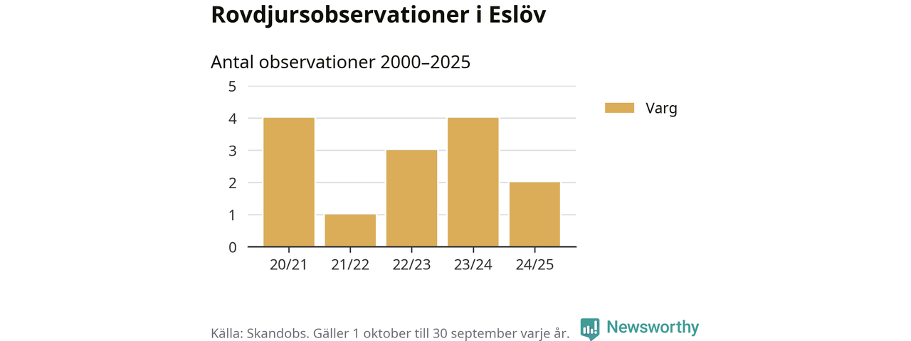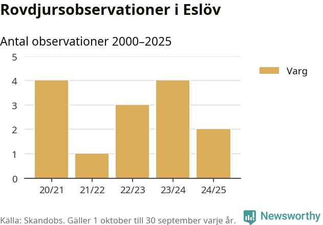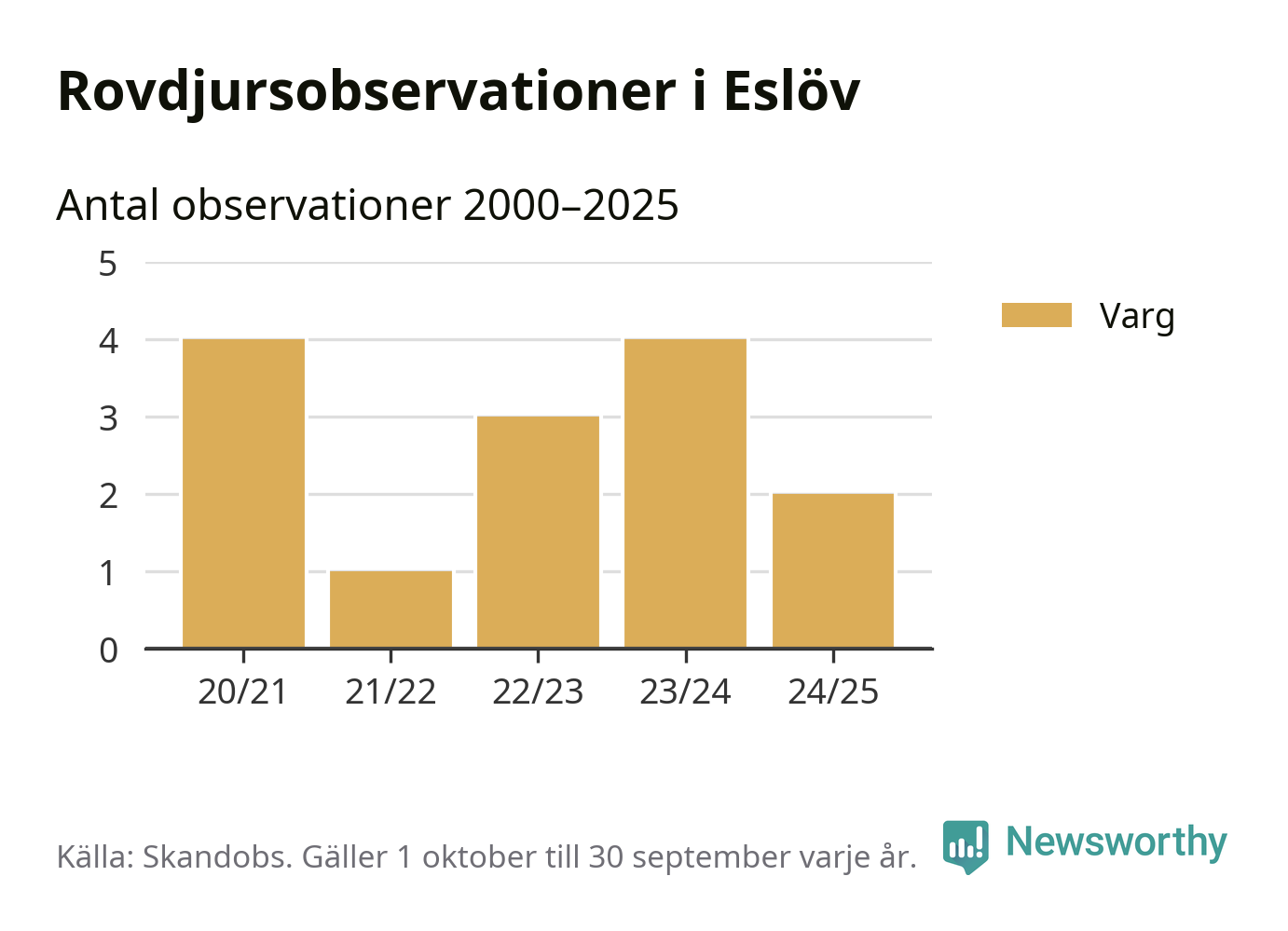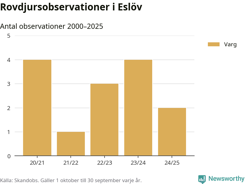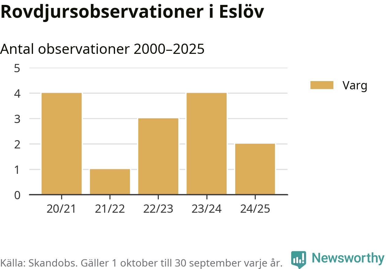 Där kan vem som helst rapportera sina observationer av de stora rovdjuren björn, varg, lodjur och järv. Mellan 1 oktober 2024 och 30 september i år har knappt 10 000 observationer registrerats i landet. Det kan vara synobservationer, foton, spår, spillning, döda bytesdjur eller andra tecken på rovdjursförekomst. I Eslöv handlar det om totalt två observationer av varg.