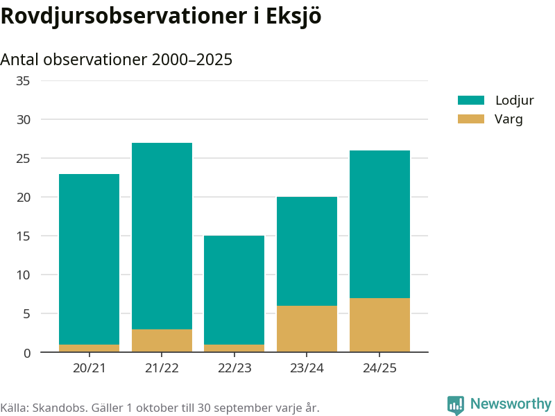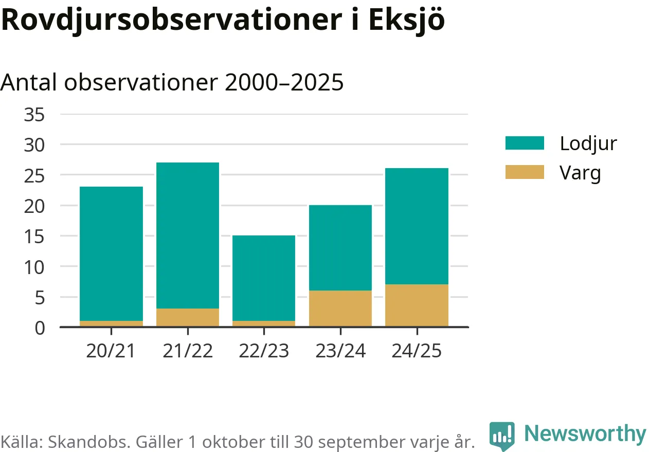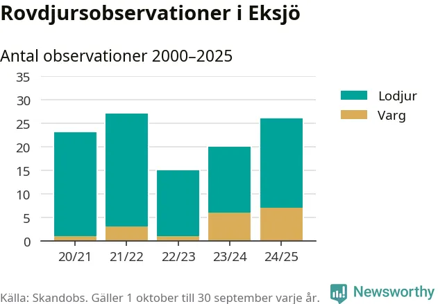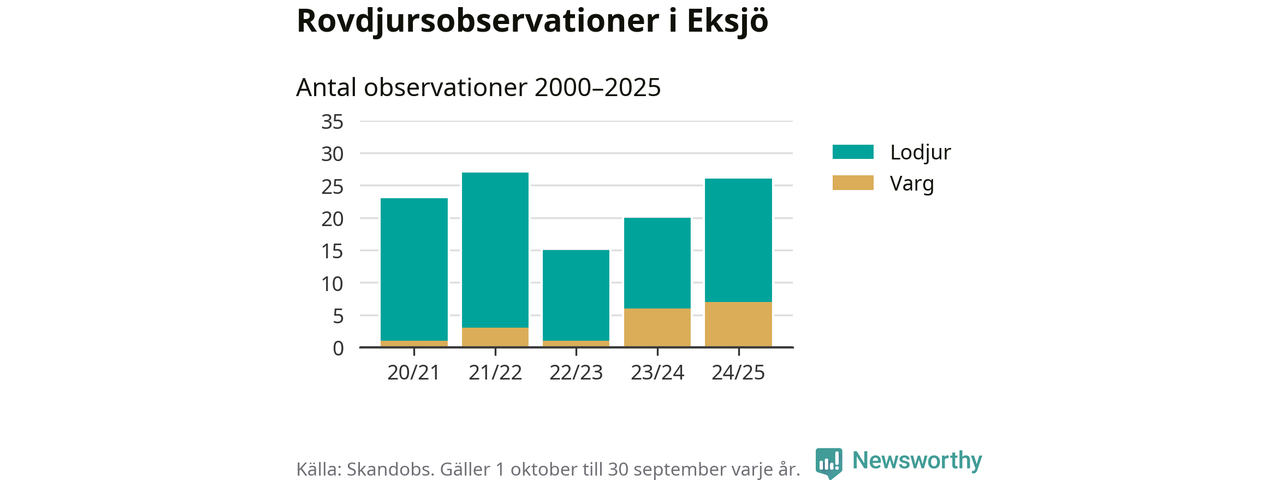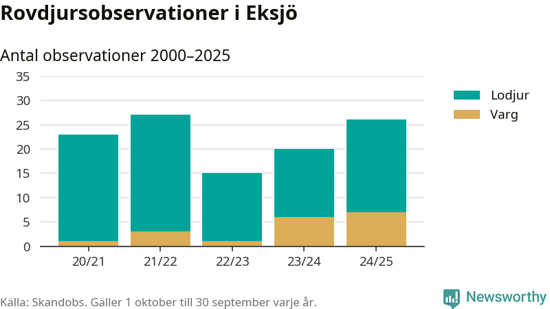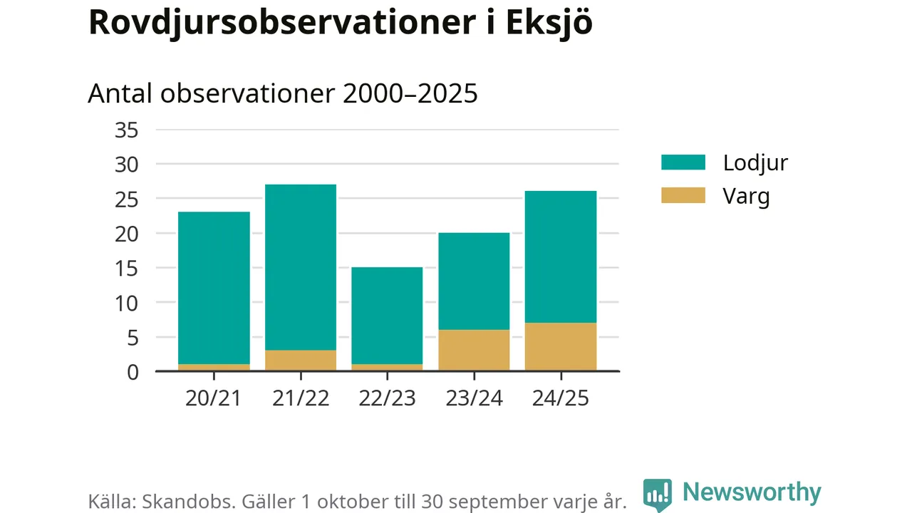 Där kan vem som helst rapportera sina observationer av de stora rovdjuren björn, varg, lodjur och järv. Mellan 1 oktober 2024 och 30 september i år har knappt 10 000 observationer registrerats i landet. Det kan vara synobservationer, foton, spår, spillning, döda bytesdjur eller andra tecken på rovdjursförekomst. I Eksjö handlar det om totalt 26 observationer av lodjur eller varg.