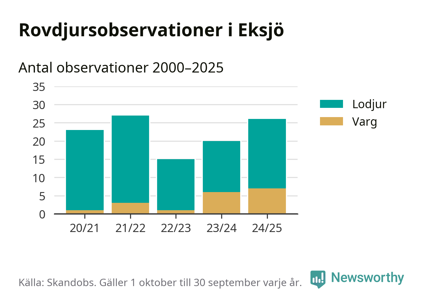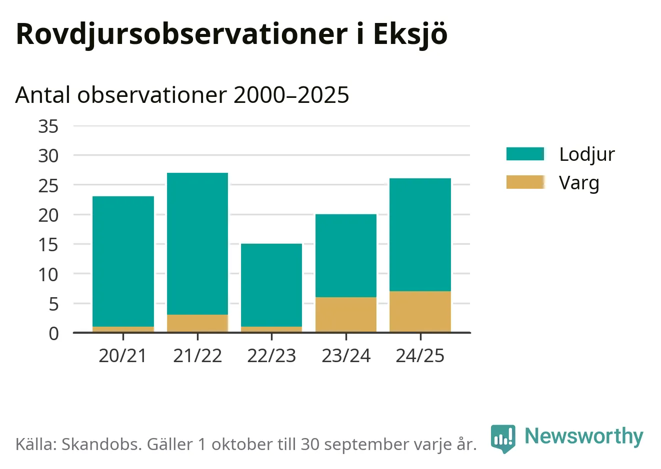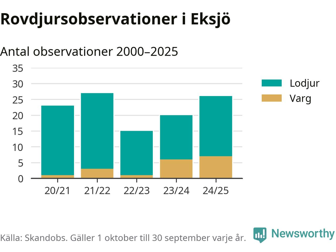Där kan vem som helst rapportera sina observationer av de stora rovdjuren björn, varg, lodjur och järv. Mellan 1 oktober 2024 och 30 september i år har knappt 10 000 observationer registrerats i landet. Det kan vara synobservationer, foton, spår, spillning, döda bytesdjur eller andra tecken på rovdjursförekomst. I Eksjö handlar det om totalt 26 observationer av lodjur eller varg.