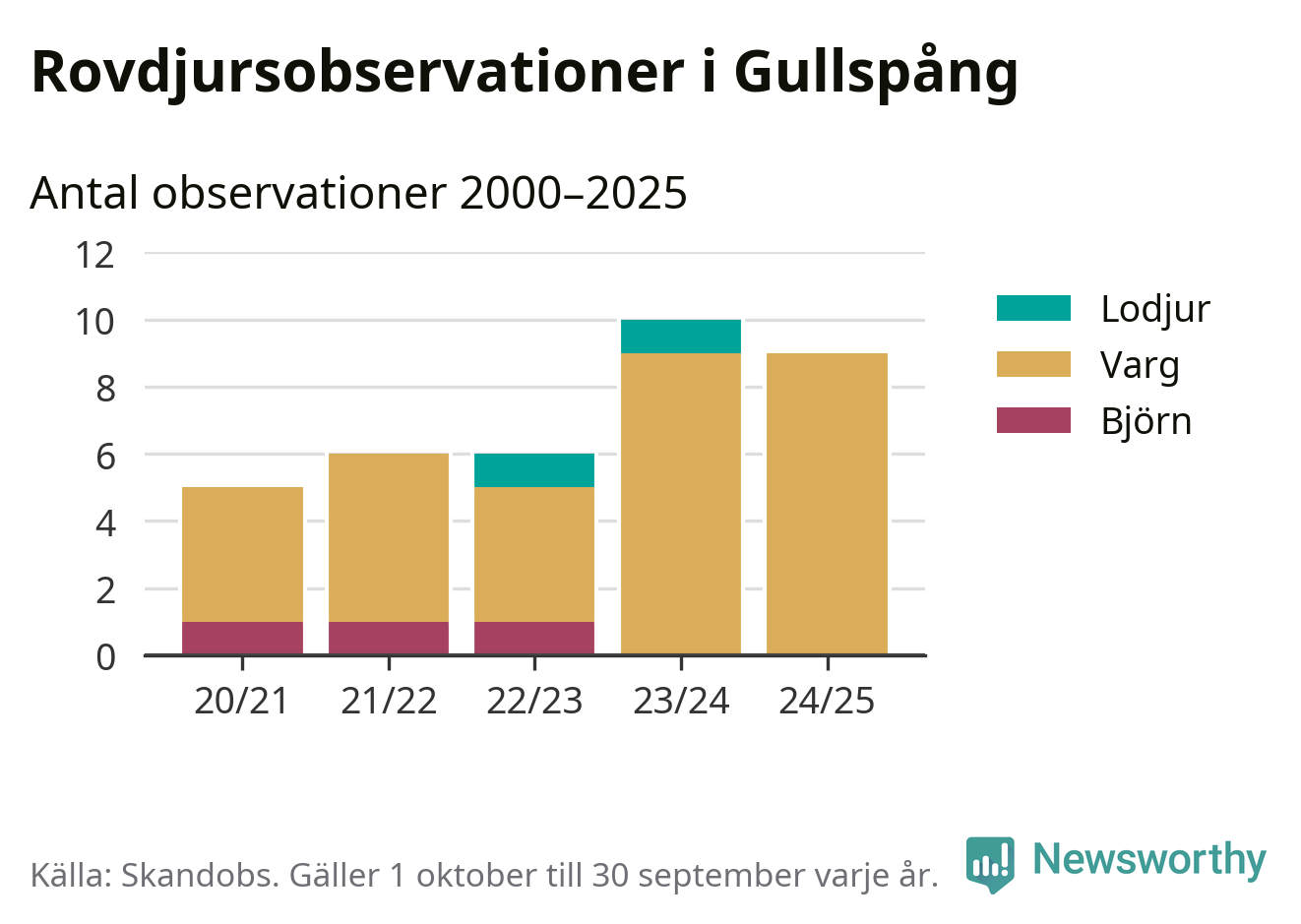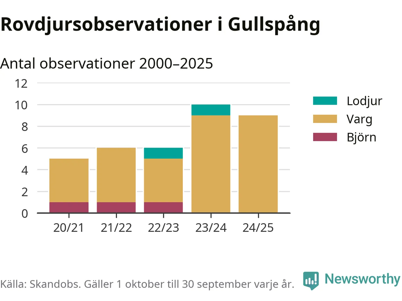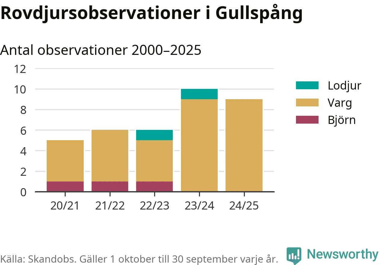 Där kan vem som helst rapportera sina observationer av de stora rovdjuren björn, varg, lodjur och järv. Mellan 1 oktober 2024 och 30 september i år har knappt 10 000 observationer registrerats i landet. Det kan vara synobservationer, foton, spår, spillning, döda bytesdjur eller andra tecken på rovdjursförekomst. I Gullspång handlar det om totalt nio observationer av varg.