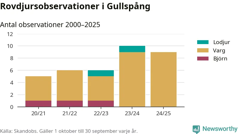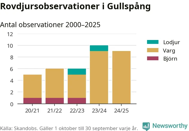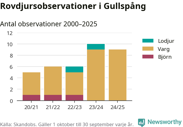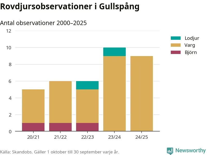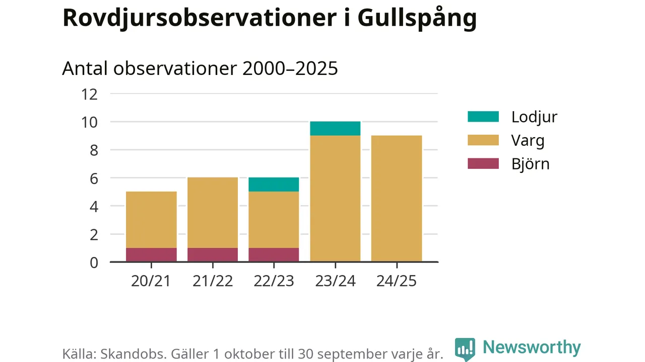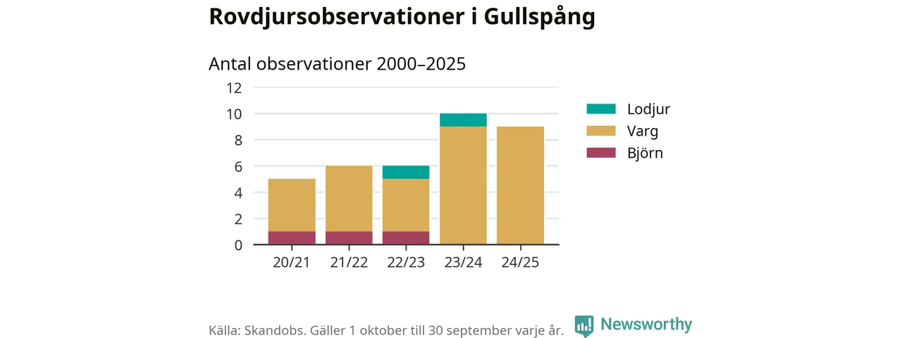 Där kan vem som helst rapportera sina observationer av de stora rovdjuren björn, varg, lodjur och järv. Mellan 1 oktober 2024 och 30 september i år har knappt 10 000 observationer registrerats i landet. Det kan vara synobservationer, foton, spår, spillning, döda bytesdjur eller andra tecken på rovdjursförekomst. I Gullspång handlar det om totalt nio observationer av varg.